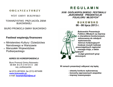 ORGANIZATORZY WÓJT GMINY BUKOWSKO TOWARZYSTWO PRZYJACIÓŁ ZIEMI BUKOWSKIEJ REGULAMIN XVIII OGÓLNOPOLSKIEGO FESTIWALU „BUKOWSKIE PREZENTACJE FOLKLORU MŁODYCH” BUKOWSKO 06 - 08 lipca 2013 r. BIURO PROMOCJI GMINY BUKOWSKO Festiwal wspierają finansowo • Ministerstwo Kultury i Dziedzictwa Narodowego w Warszawie • Marszałek Województwa Podkarpackiego Bukowskie Prezentacje Folkloru Młodych są imprezą o charakterze konkursowym, adresowaną do młodych wykonawców, twórczo kultywujących tradycje muzyki ludowej poszczególnych regionów naszego kraju, a także żyjących w jego granicach grup etnicznych. ADRES DO KORESPONDENCJI Biuro Promocji Gminy Bukowsko 38-505 B U K O W S K O 290 woj. podkarpackie tel (013) 4674024, fax (013) 4674466 www.bukowsko.pl e-mail: [email protected] W ramach prezentacji odbywać się będą: - otwarty konkurs wykonawczy - koncerty zaproszonych zespołów - imprezy towarzyszące I. Celem konkursu jest: Ø aktywizowanie twórczych zainteresowań młodego pokolenia tradycyjną muzyką ludową, Ø podnoszenie poziomu artystycznego sztuki wykonawczej, Ø popularyzacja kultury ludowej w społeczeństwie. II. Uczestnikami konkursu mogą być: 1. Kapele ludowe (do 8 osób): Ø instrumentalne oraz instrumentalno-wokalne, których skład winien być zgodny z wzorami danego regionu. 2. Zespoły śpiewacze (do 10 osób) bez towarzyszenia instrumentalnego. 3. Soliści instrumentaliści, grający na tradycyjnych instrumentach; skrzypce, cymbały, klarnet, fujarka, piszczałki oraz innych lokalnych instrumentach ludowych (z wyłączeniem akordeonu). 4. Soliści śpiewacy (bez towarzyszenia instrumentalnego). III. Wiek uczestników nie może przekroczyć 20 roku życia. IV. Kwalifikacje do udziału w konkursie dokonane będą na podstawie karty zgłoszeniowej i płyty CD lub DVD (nie dotyczy uczestników poprzednich edycji festiwalu) przesłanych na adres organizatora, w terminie do 05 czerwca 2013 roku. V. Wybrani przez komisję uczestnicy konkursu, otrzymają zaproszenia oraz szczegółowy harmonogram VI. Do udziału w konkursie zostaną dopuszczone: • kapele i zespoły śpiewacze z programem zawierającym 3 utwory, których łączny czas trwania nie przekroczy 15 minut, • soliści, instrumentaliści i śpiewacy z programem zawierającym 2 utwory, których łączny czas prezentacji nie przekroczy 7 minut. VII. Prezentacje konkursowe oceniać będzie Jury powołane przez organizatorów. Decyzje Jury potwierdzone protokołem, są ostateczne. Jury szczególną uwagę będzie zwracać na: • • • • dobór repertuaru, poziom artystyczny i wykonawczy, strój zgodny z regionem, właściwe cechy gwarowe. VIII. Jury przyzna nagrody i wyróżnienia, a ich wysokość i forma uzależniona będzie od środków zgromadzonych przez organizatorów. IX. Organizatorzy zapewniają bezpłatne; wyżywienie i zakwaterowanie (po uzgodnieniu).Koszty przejazdu i ubezpieczenia, uczestnicy pokrywają we własnym zakresie. Szczegóły zawierać będzie mail lub telefon do wybranych uczestników konkursu.
