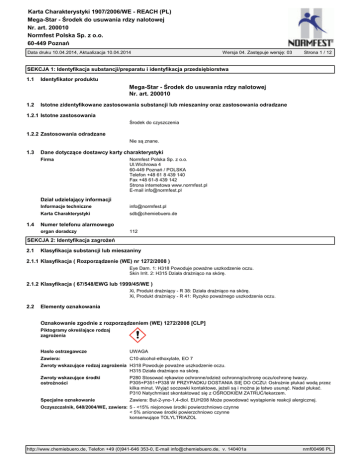 Karta Charakterystyki 1907/2006/WE - REACH (PL) Nr. art. 200010 Normfest Polska Sp. z o.o. Data druku 10.04.2014, Aktualizacja 10.04.2014 1.1 Strona 1 / 12 Identyfikator produktu Nr. art. 200010 1.2 Istotne zidentyfikowane zastosowania substancji lub mieszaniny oraz zastosowania odradzane 1.2.1 Istotne zastosowania 1.2.2 Zastosowania odradzane 1.3 Firma Normfest Polska Sp. z o.o. Ul.Wichrowa 4 Telefon +48 61 8 439 140 Fax +48 61-8 439 142 Strona internetowa www.normfest.pl E-mail [email protected] 1.4 Informacje techniczne [email protected] Karta Charakterystyki [email protected] Numer telefonu alarmowego organ doradczy 2.1 112 Klasyfikacja substancji lub mieszaniny 2.1.1 2.1.2 Klasyfikacja ( 67/548/EWG lub 1999/45/WE ) 2.2 Elementy oznakowania UWAGA Zawiera: C10-alcohol-ethoxylate, EO 7 Specjalne oznakowanie Oczyszczalnik, 648/2004/WE, zawiera: http://www.chemiebuero.de, Telefon +49 (0)941-646 353-0, E-mail [email protected], v. 140401a nmf00496 PL Karta Charakterystyki 1907/2006/WE - REACH (PL) Nr. art. 200010 Normfest Polska Sp. z o.o. Data druku 10.04.2014, Aktualizacja 10.04.2014 Strona 2 / 12 2.3 Produkt typu: 1 - <5 C10-alcohol-ethoxylate, EO 7 CAS: 78330-20-8, EINECS/ELINCS: polymer GHS/CLP: Acute Tox. 4: H302 - Eye Dam. 1: H318 EEC: Xn, R 22-41 1 - <5 Kwas fosforowy CAS: 7664-38-2, EINECS/ELINCS: 231-633-2, EU-INDEX: 015-011-00-6 GHS/CLP: Skin Corr. 1B: H314 EEC: C, R 34 1 - <3 2-aminoetanol CAS: 141-43-5, EINECS/ELINCS: 205-483-3, EU-INDEX: 603-030-00-8 GHS/CLP: Acute Tox. 4: H302 H312 H332 - Skin Corr. 1B: H314 EEC: C, R 20/21/22-34 1 - <3 Oxalic acid dihydrate CAS: 6153-56-6, EINECS/ELINCS: 205-634-3, EU-INDEX: 607-006-00-8 GHS/CLP: Acute Tox. 4: H302 H312 EEC: Xn, R 21/22 1 - <3 Etoksylowany alkohol CAS: 24938-91-8, EINECS/ELINCS: 500-195-7 GHS/CLP: Eye Dam. 1: H318 EEC: Xi, R 41 0,1 - <0,25 But-2-yno-1,4-diol CAS: 110-65-6, EINECS/ELINCS: 203-788-6, EU-INDEX: 603-076-00-9 GHS/CLP: Acute Tox. 4: H312 - Acute Tox. 3: H301 H331 - Skin Corr. 1B: H314 - Skin Sens. 1: H317 - STOT RE 2: H373 EEC: T-C, R 21-23/25-34-43-48/22 0,1 - <0,25 1H-Imidazolo-1-etanol, 4,5-dihydro-,2-nortal-alkilowe oleje pochodne CAS: 61791-39-7, EINECS/ELINCS: 263-171-2 EEC: C-N, R 34-22-50/53 Lista SVHC (Candidate List of Substances of Very High Concern for authorisation): nie SEKCJA 4: Pierwsza pomoc 4.1 Informacje ogólne oddechowych Kontakt z oczami 4.2 Wywoluje oparzenia. http://www.chemiebuero.de, Telefon +49 (0)941-646 353-0, E-mail [email protected], v. 140401a nmf00496 PL Karta Charakterystyki 1907/2006/WE - REACH (PL) Nr. art. 200010 Normfest Polska Sp. z o.o. Data druku 10.04.2014, Aktualizacja 10.04.2014 Strona 3 / 12 4.3 poszkodowanym leczenie objawowe 5.1 5.2 5.3 6.1 6.2 6.3 6.4 Odniesienia do innych sekcji Patrz SEKCJA 8+13 7.1 przyjmowanie lekarstw. 7.2 kwasoodpornego. 7.3 Patrz sekcja 1.2 http://www.chemiebuero.de, Telefon +49 (0)941-646 353-0, E-mail [email protected], v. 140401a nmf00496 PL Karta Charakterystyki 1907/2006/WE - REACH (PL) Nr. art. 200010 Normfest Polska Sp. z o.o. Data druku 10.04.2014, Aktualizacja 10.04.2014 Strona 4 / 12 8.1 granicznych, nad którymi konieczny jest dozór w miejscu pracy (PL) 1 - <5 Kwas fosforowy CAS: 7664-38-2, EINECS/ELINCS: 231-633-2, EU-INDEX: 015-011-00-6 1 - <3 Oxalic acid dihydrate CAS: 6153-56-6, EINECS/ELINCS: 205-634-3, EU-INDEX: 607-006-00-8 1 - <3 2-aminoetanol CAS: 141-43-5, EINECS/ELINCS: 205-483-3, EU-INDEX: 603-030-00-8 granicznych, nad którymi konieczny jest dozór w miejscu pracy (EU) 1 - <5 Kwas fosforowy CAS: 7664-38-2, EINECS/ELINCS: 231-633-2, EU-INDEX: 015-011-00-6 8-godzinne: 1 mg/m³ Krótkoterminowe (15-minutowego): 2 mg/m³ 1 - <3 Oxalic acid dihydrate CAS: 6153-56-6, EINECS/ELINCS: 205-634-3, EU-INDEX: 607-006-00-8 8-godzinne: 1 mg/m³ 1 - <3 2-aminoetanol CAS: 141-43-5, EINECS/ELINCS: 205-483-3, EU-INDEX: 603-030-00-8 8-godzinne: 1 ppm, 2,5 mg/m³, H Krótkoterminowe (15-minutowego): 3 ppm, 7,6 mg/m³ 8.2 Ochrona oczu Okulary ochronne. Kauczuk butylowy, >480 min (EN 374). Ochrona skóry Inne Ochrona dróg oddechowych Ograniczenie i kontrola nieoznaczony naturalnego http://www.chemiebuero.de, Telefon +49 (0)941-646 353-0, E-mail [email protected], v. 140401a nmf00496 PL Karta Charakterystyki 1907/2006/WE - REACH (PL) Nr. art. 200010 Normfest Polska Sp. z o.o. Data druku 10.04.2014, Aktualizacja 10.04.2014 Strona 5 / 12 9.1 Stan skupienia ciecz Kolor Czerwonawy Zapach charakterystyczny Próg zapachu nieoznaczony kwasowy nieoznaczony Temperatura wrzenia [°C] nieoznaczony nie dotyczy nie dotyczy nie dotyczy nie dotyczy Utlenianie brak nieoznaczony nieoznaczony nie dotyczy mieszalny nieoznaczony oktanol/woda] nie dotyczy nie dotyczy do powietrza nie dotyczy 9.2 Temperatura topnienia [°C] nieoznaczony Samozapalenie [°C] nie dotyczy Temperatura rozpadu [°C] nieoznaczony Inne informacje Brak. 10.1 10.2 W normalnych warunkach otoczenia (temperatura pokojowa) stabilny. 10.3 Reaguje z zasadami. 10.4 Mocne ogrzewanie. 10.5 Patrz SEKCJA 10.3. 10.6 http://www.chemiebuero.de, Telefon +49 (0)941-646 353-0, E-mail [email protected], v. 140401a nmf00496 PL Karta Charakterystyki 1907/2006/WE - REACH (PL) Nr. art. 200010 Normfest Polska Sp. z o.o. Data druku 10.04.2014, Aktualizacja 10.04.2014 Strona 6 / 12 SEKCJA 11: Informacje toksykologiczne 11.1 Produkt ATE-mix, ustne, >2000 mg/kg bw. ATE-mix, skórne, >2000 mg/kg bw. 0,1 - <0,25 But-2-yno-1,4-diol, CAS: 110-65-6 LD50, skórne, Szczur: 659 mg/kg (BASF). LD50, ustne, Szczur: 136 mg/kg (BASF). LC50, wdechowe, Szczur: 2,5 mg/l 4h (IUCLID). 1 - <5 Kwas fosforowy, CAS: 7664-38-2 LD50, skórne, Królik: 2740 mg/kg (Lit.). LD50, ustne, Szczur: 1530 mg/kg (Lit.). LC50, wdechowe, Szczur: > 0,85 mg/l (1h) (Lit.). 1 - <3 2-aminoetanol, CAS: 141-43-5 LD50, skórne, Królik: 1000 mg/kg bw. LD50, ustne, Szczur: 2050 mg/kg bw. 1 - <3 Oxalic acid dihydrate, CAS: 6153-56-6 LD50, skórne, Szczur: 20000 mg/kg (IUCLID). LD50, ustne, Szczur: 375 mg/kg (IUCLID). nieoznaczony nieoznaczony nieoznaczony nieo