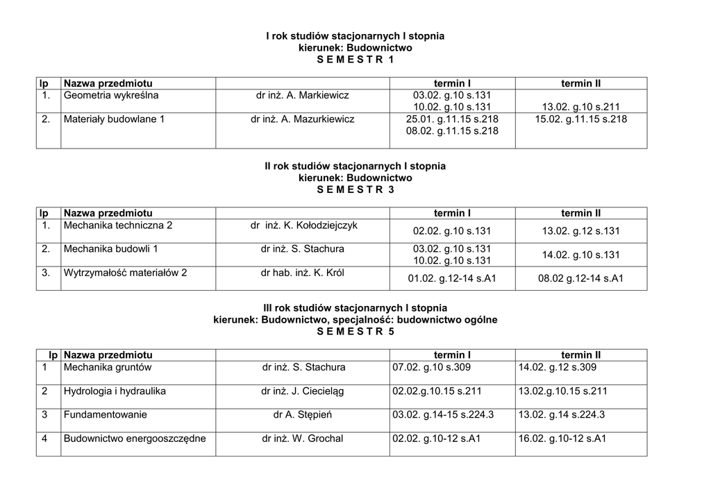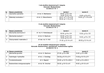 I rok studiów stacjonarnych I stopnia kierunek: Budownictwo SEMESTR 1 lp 1. 2. Nazwa przedmiotu Geometria wykreślna Materiały budowlane 1 dr inż. A. Markiewicz dr inż. A. Mazurkiewicz termin I 03.02. g.10 s.131 10.02. g.10 s.131 25.01. g.11.15 s.218 08.02. g.11.15 s.218 termin II 13.02. g.10 s.211 15.02. g.11.15 s.218 II rok studiów stacjonarnych I stopnia kierunek: Budownictwo SEMESTR 3 lp 1. Nazwa przedmiotu Mechanika techniczna 2 2. Mechanika budowli 1 dr inż. S. Stachura 3. Wytrzymałość materiałów 2 dr hab. inż. K. Król dr inż. K. Kołodziejczyk termin I termin II 02.02. g.10 s.131 13.02. g.12 s.131 03.02. g.10 s.131 10.02. g.10 s.131 14.02. g.10 s.131 01.02. g.12-14 s.A1 08.02 g.12-14 s.A1 III rok studiów stacjonarnych I stopnia kierunek: Budownictwo, specjalność: budownictwo ogólne SEMESTR 5 1 lp Nazwa przedmiotu Mechanika gruntów 2 Hydrologia i hydraulika 3 Fundamentowanie 4 Budownictwo energooszczędne dr inż. S. Stachura termin I 07.02. g.10 s.309 termin II 14.02. g.12 s.309 dr inż. J. Ciecieląg 02.02.g.10.15 s.211 13.02.g.10.15 s.211 03.02. g.14-15 s.224.3 13.02. g.14 s.224.3 02.02. g.10-12 s.A1 16.02. g.10-12 s.A1 dr A. Stępień dr inż. W. Grochal IV rok studiów stacjonarnych I stopnia kierunek: Budownictwo, specjalność: budownictwo ogólne SEMESTR 7 lp Nazwa przedmiotu Pokrycia ochronne materiałów budowlanych 2 Maszyny budowlane 1 3 Zarządzanie jakością w budownictwie termin I 02.02.g.12 s.12 termin II prof. dr hab. inż. D. Kotnarowska dr inż. Z. Trela 01.02. g.10.15 s.1 15.02. g.10.15 s.1 06.02. g.12 s.A1 13.02. g.12 s.A1 dr inż. M. Ahmed I rok studiów stacjonarnych I stopnia kierunek: Mechanika i budowa maszyn SEMESTR 1 lp Nazwa przedmiotu 1 Nauka o materiałach 2 Maszynoznawstwo dr inż. A. Poprzeczka termin I 09.02. g.10 termin II 16.02. g.10 prof. dr hab. inż. J. Sadowski 06.02. g.10-12 s.115A 13.02. g.10-12 s.115A II rok studiów stacjonarnych I stopnia kierunek: Mechanika i budowa maszyn SEMESTR 3 lp 1. Nazwa przedmiotu Mechanika techniczna 2. Wytrzymałość materiałów / 3. 4. prof. dr hab. inż. W. Blajer termin I termin II 06.02 g.10.15-13 s.A2 115 15.02. g.10.15-13 s.A2 115 10.02.g.10.15-13 s.A2 115 dr hab. inż. K. Król 01.02 g.12-14 s.A1 08.02. g.12-14 s.A1 Strenght of materials dr inż. K. Olejarczyk 01.02. g.12 s.A1 08.02. g.12 s.A1 Elektrotechnika i elektronika dr inż. Z. Wołczyński 03.02. g.9.15 s.A2 III rok studiów stacjonarnych I stopnia kierunek: Mechanika i budowa maszyn SEMESTR 5 przedmioty realizowane na wszystkich specjalnościach: lp Nazwa przedmiotu 1 Podstawy konstrukcji maszyn prof. dr hab. inż. J. Sadowski 2 Technologia budowy maszyn dr hab. inż. M. Kowalik specjalność: Projektowanie i wytwarzanie maszyn (PiWM) lp Nazwa przedmiotu 1. Technologie specjalne dr inż. A. Mazurkiewicz 2. Obrabiarki CNC dr inż. J. Narojczyk specjalności: Komputerowe systemy inżynierskie (KSI) lp Nazwa przedmiotu 1. Metody komputerowe mechaniki dr T. Schubring termin I 06.02. g.8-10 s.115A termin II 13.02. g.8-10 s.115A 31.01. g.8 s.A1 03.02. g.8 s.A1 termin I 26.01. g.10.15 s.218 02.02. g.10.15 s.218 termin II 16.02. g.10.15 s.218 01.02. g.10 s.218 14.02. g.10 s.218 termin I 01.02. g.10 s.310 termin II 14.02. g.10 s.310 III rok studiów stacjonarnych I stopnia kierunek: Mechanika i budowa maszyn SEMESTR 7 specjalność: Eksploatacja samochodów (ES) lp Nazwa przedmiotu 1. Technologie napraw samochodów dr inż. Z. Chmielewski 2. Płyny motoryzacyjne dr inż. W. Olszewski specjalność: Projektowanie i wytwarzanie maszyn (PiWM) termin I 01.02. g.12 s.12 24.01. g.12 s.1 termin II 14.02. g.12 s.12 lp Nazwa przedmiotu 3. Inżynieria powierzchni dr hab. inż. M. Rucki termin I 01.02. g.8.30 s.218 termin II 16.02. g.8.30 s.218 I rok studiów stacjonarnych I stopnia kierunek: Samochody i Bezpieczeństwo w Transporcie Drogowym SEMESTR 1 lp Nazwa przedmiotu 1. Podstawy budowy samochodów 2. Bezpieczeństwo ruchu drogowego w Polsce i UE 3. Grafika inżynierska prof. dr hab. inż. S. Luft termin I 02.02. g.9 s.1 termin II 14..02. g.9 s.1 dr inż. M. Gidlewski 03.02. g.10 s.22 13.02. g.10 s.22 dr inż. P. Sadowski 10.02. g.9 s.210 14.02. g.9 s.210 II rok studiów stacjonarnych I stopnia kierunek: Samochody i Bezpieczeństwo w Transporcie Drogowym SEMESTR 3 lp Nazwa przedmiotu 1. Podstawy diagnostyki samochodów 2. Podstawy elektroniki samochodowej prof. dr hab. inż. W. Lotko termin I 24.01. g.10 s.22 dr inż. M. Stępniewski 02.02. g.10 s.12 termin II 31.01. g.10 s.22 III rok studiów stacjonarnych I stopnia kierunek: Samochody i Bezpieczeństwo w Transporcie Drogowym SEMESTR 5 lp Nazwa przedmiotu 1. Diagnostyka silników 2. Badania bezpieczeństwa dr hab. inż. K. Górski termin I 24.01. g.10.15 s.1 termin II 01.02 g.10 s.1 dr inż. M. Gidlewski 03.02. g.10 s.22 13.02. g.10 s.22 samochodów i brd. I rok studiów stacjonarnych I stopnia kierunek: LOGISTYKA SEMESTR 1 lp Nazwa przedmiotu 1. Logistyka i zarządzanie łańcuchem dostaw 2. Podstawy zarządzania logistyką dr inż. A. Wąsowicz termin I 01.02. g.10.15 s.22 termin II 08.02. g.10.15 s.22 Mgr inż. Z. Alot 06.02. g.10.15 s.22 10.02. g.10.15 s.22 II rok studiów stacjonarnych I stopnia kierunek: LOGISTYKA SEMESTR 3 lp Nazwa przedmiotu 1. Ekonomika transportu dr hab. T. Dyr termin I 06.02. g.10 s.1 termin II III rok studiów stacjonarnych I stopnia kierunek: LOGISTYKA SEMESTR 5 specjalność: Logistyka w motoryzacji lp Nazwa przedmiotu 1. Organizacja produkcji 2. Budowa pojazdów 3. Podstawy eksploatacji pojazdów termin I 02.02. g.10 s.20 termin II dr hab. inż. K. Krawczyk prof. S. Luft 02.02. g.9 s.1 14.02. g.9 s.1 dr inż. Z.Chmielewski 01.02. g.10 s.12 14.02. g.10 s.12 IV rok studiów stacjonarnych I stopnia kierunek: LOGISTYKA SEMESTR 7 specjalność: Logistyka w motoryzacji lp Nazwa przedmiotu 1. Ochrona środowiska w motoryzacji prof. dr hab. inż. D. Kotnarowska termin I 02.02. g.10 s.12 termin II I rok studiów stacjonarnych I stopnia kierunek: Inżynieria Odnawia