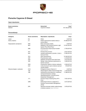 Porsche Cayenne S Diesel Opcje indywidualne Numer zamówiena 92AAD1 Samochód Cayenne S Diesel Ceny* 415 180,00 PLN Personalizacja Kategoria Numer zamówiena Wyposażenie indywidualne Lakier Kolory wnętrza 0Q LC Wyposażenie zewnętrzne 0NA 8EX White Pakiet wykończenia wnętrza skórą w kolorze Black Brak oznaczenia modelu Reflektory LED Porsche Dynamic Light System Plus (PDLS Plus) Przyciemniane klosze tylnych świateł Opcje Exclusive Porsche Entry & Drive Asystent parkowania (z przodu i z tyłu) z Surround View Dach panoramiczny Przyciemniane szyby Delikatne domykanie drzwi Soft Close Relingi i listwy dachowe wykończone w kolorze czarnym Poszerzenia nadkoli w kolorze nadwozia Listwy bocznych szyb w kolorze czarnym (wysoki połysk) 8-biegowa skrzynia Tiptronic S Wspomaganie układu kierowniczego Plus Zawieszenie pneumatyczne z systemem samopoziomowania i funkcją regulacjiwysokości z Porsche Active Suspension Management Porsche Torque Vectoring Plus (PTV Plus) Pakiet Sport Chrono w połączeniu z Porsche Communication Management (PCM) Sportowe końcówki układu wydechowego 8SB 4F2 8A4 3FU 4KF GZ2 3S5 6GH QJ4 Skrzynia biegów / podwozie G1G 1N3 1BK 1Y1 QR5 0P6 w kolorze czarnym Opcje Exclusive Ceny* 0,00 PLN 16 466,00 PLN 0,00 PLN 14 261,00 PLN 2 755,00 PLN 5 631,00 PLN 11 692,00 PLN 10 345,00 PLN 2 418,00 PLN 3 612,00 PLN 3 000,00 PLN 4 836,00 PLN 919,00 PLN 0,00 PLN 1 470,00 PLN 17 996,00 PLN 7 651,00 PLN 3 917,00 PLN 3 979,00 PLN Personalizacja (dalej) Kategoria Numer zamówiena Wyposażenie indywidualne Koła CQ1 21-calowe koło Cayenne SportEdition w kolorze Black (wysoki połysk)z Akcesoria do kół Wyposażenie wnętrza 1G1 8T3 7Y7 9Q6 PA2 PP6 PE6 4A4 4D3 2ZH 0TD 4X4 3Y7 Wnętrze: skóra 3J7 Wnętrze: włókno węglowe 5MH Wnętrze: aluminium 6Q7 Audio / komunikacja 7T1 9W5 9VL poszerzeniami nadkoli Opcje Exclusive 18-calowe dojazdowe koło zapasowe Adaptacyjny tempomat w połączeniu z Porsche Active Safe (PAS) Asystent utrzymania pasa ruchu z asystentem zmiany pasa ruchu Lane Change Assist(LCA) System rozpoznawania ograniczenia prędkości Automatycznie przyciemniane lusterka zewnętrzne i wewnętrzne Pakiet oświetlenia Komfort Adaptacyjne sportowe fotele z 18zakresową regulacją i pakietem pamięci Podgrzewane fotele (z przodu i z tyłu) Wentylowane fotele (z przodu) Podgrzewana kierownica Dywaniki Boczne poduszki powietrzne (z tyłu) Elektryczne rolety przeciwsłoneczne tylnych bocznych szyb Herb Porsche wytłoczony na zagłówkach (z przodu) Opcje Exclusive Pakiet wnętrza z włókna węglowego w połączniu z dźwignią zmianybiegów Tiptronic S wykończoną aluminium Dźwignia zmiany biegów Tiptronic S z aluminium Opcje Exclusive Porsche Communication Management (PCM) z modułem nawigacji Przygotowanie do telefonu komórkowego System BOSE® Surround Sound Ceny* 26 382,00 PLN 919,00 PLN 9 732,00 PLN 6 366,00 PLN 1 958,00 PLN 1 836,00 PLN 1 592,00 PLN 9 732,00 PLN 4 469,00 PLN 4 774,00 PLN 1 530,00 PLN 919,00 PLN 2 112,00 PLN 3 979,00 PLN 1 041,00 PLN 8 386,00 PLN 3 672,00 PLN 17 445,00 PLN 3 366,00 PLN 6 947,00 PLN Cena całkowita 643 285,00 PLN OFERTA SPECJALNA* 604 688,00 PLN RATA LEASINGOWA** 7 886,10 PLN *ceny zawierają 23 % VAT i nie stanowią oferty w rozumieniu art.71 Kodeksu cywilnego. ** Leasing 102%, 36 miesięcy, 45% opłaty wstępnej, 1% wartość wykupu. Oferta ważna do 31.01.2017r. lub do wyprzedania samochodów objętych ofertą specjalną Twój Kod Porsche: http://www.porsche-code.com/PGHGH8P2 Ważne informacje Przedstawione w konfiguratorze modele samochodów prezentują wyposażenie dostępne na terenie Rzeczypospolitej Polskiej. Dostępność modeli i opcji może się różnić na poszczególnych rynkach z uwagi na lokalne przepisy i ograniczenia. Zawartość domówionego pakietu lub opcji może zmienić elementy wyposażenia standardowego – w niektorych przypadkach bezzwrotnie zastępując elementy wyposażenia standardowego. W celu uzyskania szczegółowych informacji w tym zakresie prosimy o kontakt z Porsche Centrum lub z wyłącznym przedstawicielem Dr. Ing, h.c.F. Porsche AG w Polsce – Volkswagen Group Polska Sp. z o.o. z siedzibą w Poznaniu, ul. Krańcowa 44, tel. 61 62 73 000. Dr. Ing, h.c.F. Porsche AG zastrzega sobie prawo do zmian designu, wyposażenia, kolorów, jak i specyfikacji samochodów. Kolory i materiały rzeczywiste mogą się różnić od kolorów i materiałów przedstawionych na zdjęciach. Zastrzega się prawo do błędów i pominięć w Konfiguratorze Porsche oraz na www.porsche.pl . Niniejsza konfiguracja nie stanowi oferty w rozumieniu art. 71 Kodeksu cywilnego, ma jedynie charakter poglądowy. Ceny i charakterystyka muszą być potwierdzone w wybranym Porsche Centrum. Wszystkie produkowane obecnie samochody Porsche są wykonywane z materiałów spełniających pod kątem możliwości odzysku i recyklingu wymagania określone w normie ISO 22628 i uzyskały w tym zakresie europejskie świadectwa homologacji zgodne z dyrektywą 2005/64/WE. Volkswagen Group Polska Sp. z o.o. zapewnia wszystkim użytkownikom samochodów sieć odbioru pojazdów po zakończeniu ich eksploatacji zgodną z wymaganiami ustawy z 25 stycznia 2005 r. o recyklingu pojazdów wycofanych z eksploatacji (Dz. U. Nr 25, poz. 202, z późn. zm.). Więcej informacji dotyczących ekologii znajdą państwo na stronach: www.porsche.pl. Pomiary zużycia paliwa oraz emisji CO₂ zostały wykonane zgodnie z rozporządzeniem WE 715/2007*692/2008A, 715/2007*566/2011F lub 715/2007*566/2011A.