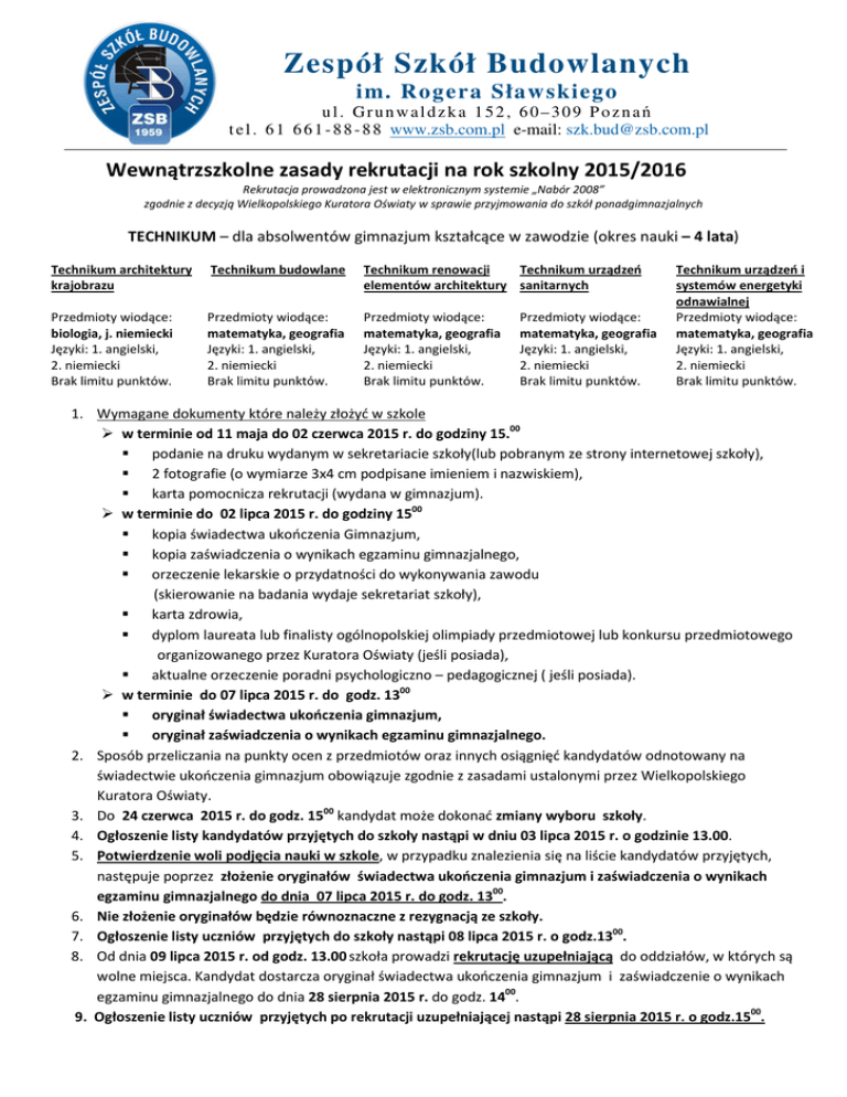 Zespół Szkół Budowlanych im. Rogera Sławskiego ul. Grunwaldzka 152, 60–309 Poznań t e l . 6 1 6 6 1 - 8 8 - 8 8 www.zsb.com.pl e-mail: [email protected] Wewnątrzszkolne zasady rekrutacji na rok szkolny 2015/2016 Rekrutacja prowadzona jest w elektronicznym systemie „Nabór 2008” zgodnie z decyzją Wielkopolskiego Kuratora Oświaty w sprawie przyjmowania do szkół ponadgimnazjalnych TECHNIKUM – dla absolwentów gimnazjum kształcące w zawodzie (okres nauki – 4 lata) Technikum architektury krajobrazu Technikum budowlane Technikum urządzeń Technikum renowacji elementów architektury sanitarnych Przedmioty wiodące: biologia, j. niemiecki Języki: 1. angielski, 2. niemiecki Brak limitu punktów. Przedmioty wiodące: matematyka, geografia Języki: 1. angielski, 2. niemiecki Brak limitu punktów. Przedmioty wiodące: matematyka, geografia Języki: 1. angielski, 2. niemiecki Brak limitu punktów. Przedmioty wiodące: matematyka, geografia Języki: 1. angielski, 2. niemiecki Brak limitu punktów. Technikum urządzeń i systemów energetyki odnawialnej Przedmioty wiodące: matematyka, geografia Języki: 1. angielski, 2. niemiecki Brak limitu punktów. 1. Wymagane dokumenty które należy złożyć w szkole w terminie od 11 maja do 02 czerwca 2015 r. do godziny 15.00 podanie na druku wydanym w sekretariacie szkoły(lub pobranym ze strony internetowej szkoły), 2 fotografie (o wymiarze 3x4 cm podpisane imieniem i nazwiskiem), karta pomocnicza rekrutacji (wydana w gimnazjum). w terminie do 02 lipca 2015 r. do godziny 1500 kopia świadectwa ukończenia Gimnazjum, kopia zaświadczenia o wynikach egzaminu gimnazjalnego, orzeczenie lekarskie o przydatności do wykonywania zawodu (skierowanie na badania wydaje sekretariat szkoły), karta zdrowia, dyplom laureata lub finalisty ogólnopolskiej olimpiady przedmiotowej lub konkursu przedmiotowego organizowanego przez Kuratora Oświaty (jeśli posiada), aktualne orzeczenie poradni psychologiczno – pedagogicznej ( jeśli posiada). w terminie do 07 lipca 2015 r. do godz. 1300 oryginał świadectwa ukończenia gimnazjum, oryginał zaświadczenia o wynikach egzaminu gimnazjalnego. 2. Sposób przeliczania na punkty ocen z przedmiotów oraz innych osiągnięć kandydatów odnotowany na świadectwie ukończenia gimnazjum obowiązuje zgodnie z zasadami ustalonymi przez Wielkopolskiego Kuratora Oświaty. 3. Do 24 czerwca 2015 r. do godz. 1500 kandydat może dokonać zmiany wyboru szkoły. 4. Ogłoszenie listy kandydatów przyjętych do szkoły nastąpi w dniu 03 lipca 2015 r. o godzinie 13.00. 5. Potwierdzenie woli podjęcia nauki w szkole, w przypadku znalezienia się na liście kandydatów przyjętych, następuje poprzez złożenie oryginałów świadectwa ukończenia gimnazjum i zaświadczenia o wynikach egzaminu gimnazjalnego do dnia 07 lipca 2015 r. do godz. 1300. 6. Nie złożenie oryginałów będzie równoznaczne z rezygnacją ze szkoły. 7. Ogłoszenie listy uczniów przyjętych do szkoły nastąpi 08 lipca 2015 r. o godz.1300. 8. Od dnia 09 lipca 2015 r. od godz. 13.00 szkoła prowadzi rekrutację uzupełniającą do oddziałów, w których są wolne miejsca. Kandydat dostarcza oryginał świadectwa ukończenia gimnazjum i zaświadczenie o wynikach egzaminu gimnazjalnego do dnia 28 sierpnia 2015 r. do godz. 1400. 9. Ogłoszenie listy uczniów przyjętych po rekrutacji uzupełniającej nastąpi 28 sierpnia 2015 r. o godz.1500.