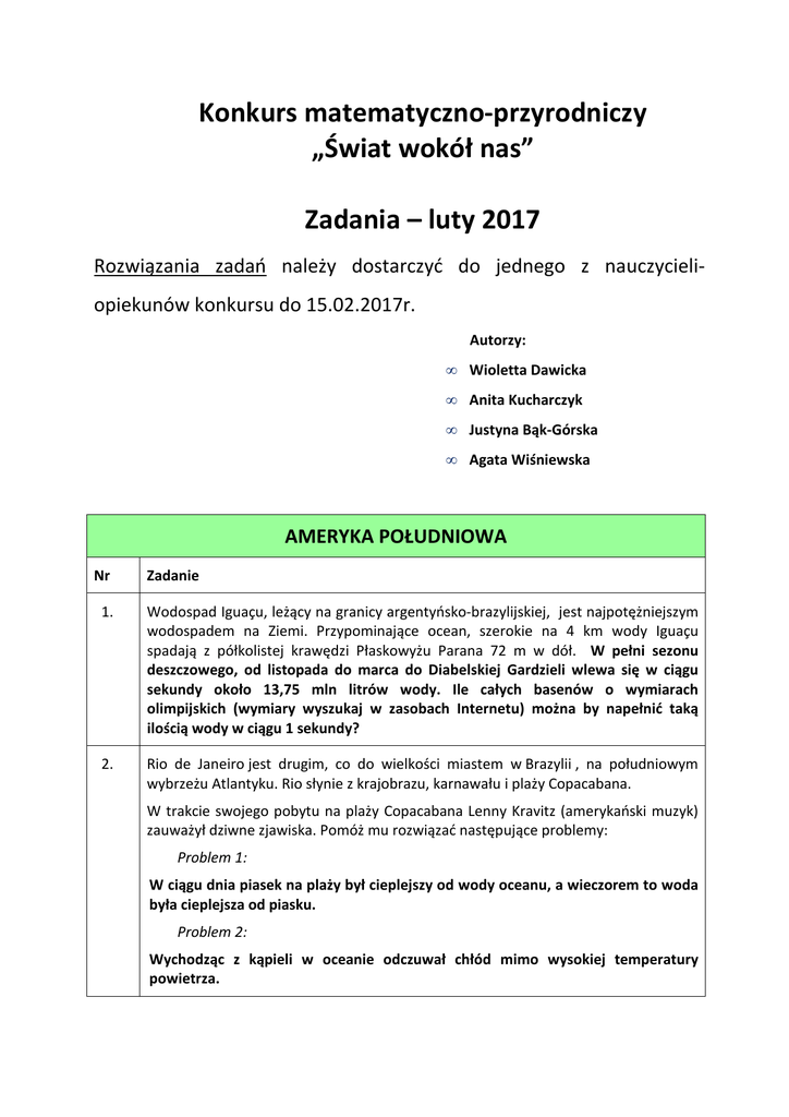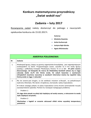 Konkurs matematyczno-przyrodniczy „Świat wokół nas” Zadania – luty 2017 Rozwiązania zadań należy dostarczyć do jednego z nauczycieliopiekunów konkursu do 15.02.2017r. Autorzy: • Wioletta Dawicka • Anita Kucharczyk • Justyna Bąk-Górska • Agata Wiśniewska AMERYKA POŁUDNIOWA Nr Zadanie 1. Wodospad Iguaçu, leżący na granicy argentyńsko-brazylijskiej, jest najpotężniejszym wodospadem na Ziemi. Przypominające ocean, szerokie na 4 km wody Iguaçu spadają z półkolistej krawędzi Płaskowyżu Parana 72 m w dół. W pełni sezonu deszczowego, od listopada do marca do Diabelskiej Gardzieli wlewa się w ciągu sekundy około 13,75 mln litrów wody. Ile całych basenów o wymiarach olimpijskich (wymiary wyszukaj w zasobach Internetu) można by napełnić taką ilością wody w ciągu 1 sekundy? 2. Rio de Janeiro jest drugim, co do wielkości miastem w Brazylii , na południowym wybrzeżu Atlantyku. Rio słynie z krajobrazu, karnawału i plaży Copacabana. W trakcie swojego pobytu na plaży Copacabana Lenny Kravitz (amerykański muzyk) zauważył dziwne zjawiska. Pomóż mu rozwiązać następujące problemy: Problem 1: W ciągu dnia piasek na plaży był cieplejszy od wody oceanu, a wieczorem to woda była cieplejsza od piasku. Problem 2: Wychodząc z kąpieli w oceanie odczuwał chłód mimo wysokiej temperatury powietrza. INNOWCJA PEDAGOGICZNA „ŚWIAT WOKÓŁ NAS” 2016/2017 Gimnazjum im. Kard. Stefana Wyszyńskiego w Starym Mieście Problem 3: Szklanka, do której nalano mu zimny napój wyjęty z lodówki pokryła się kropelkami wody. Problem 4: Odczuwał chłód dotykając metalowej klamki, mimo, że znajdowała się ona w pokoju hotelowym o temperaturze pokojowej. Problem 5: Owoce zostawione przez tydzień w pokoju hotelowym „pomarszczyły się”. Wskazówka: Skorzystaj ze zbioru zadań z fizyki dla gimnazjum wyd. Nowa Era, znajdującego się w bibliotece szkolnej (dział termodynamika). 3. Amazonia - teren ten zajmuje obszar 7 mln km², z czego około 5,5 mln km² zajmuje amazoński las deszczowy. 1) Ile wynosi powierzchnia Amazonii i powierzchnia lasu deszczowego na mapie w skali 1: 30 000 000 (wynik podaj w przybliżeniu do liczb całkowitych)? 2) Wymień nazwy krajów na terenie których leży Amazonia. 3) Podaj trzy skutki degradacji lasów tej części świata. 4. Owoce guarany są od dawna wykorzystywane w Ameryce Południowej w celu podniesienia sprawności fizycznej i psychicznej w stanach wzmożonego wysiłku, poprawienia koncentracji uwagi i zapamiętywania. Guarana zawdzięcza swoje właściwości pobudzające najwyższej wśród roślin zawartości kofeiny (tzw. guaraniny). Jej owoce zawierają cztery razy więcej kofeiny niż ziarna kawy, jednak guaranina wchłania się wolniej z przewodu pokarmowego. Źródło tekstu: http://pl.wikipedia.org/wiki/Paulinia_guarana Które ze stwierdzeń dotyczące właściwości guarany wymienione w tabeli są fałszywe, a które prawdziwe? Stwierdzenie Prawda czy fałsz? Działanie guarany na organizm ludzki jest podobne do 1) działania kawy, ponieważ zawiera taką samą substancję aktywną – kofeinę. Prawda / Fałsz 2) Stosowanie guarany jest bezpieczniejsze niż kawy. Prawda / Fałsz Przyjmowanie guarany w dużych dawkach nie ma wpływu na funkcjonowanie organizmu. Prawda / Fałsz 3) Strona 2 z 3 INNOWCJA PEDAGOGICZNA „ŚWIAT WOKÓŁ NAS” Gimnazjum im. Kard. Stefana Wyszyńskiego w Starym Mieście 5. 2016/2017 Pierwotnie stonka ziemniaczana żyła wyłącznie w Ameryce Północnej, na terenie dzisiejszego stanu Kolorado. Zależności międzygatunkowe panujące w tamtejszym ekosystemie utrzymywały liczebność jej populacji na stałym poziomie. Wszystko zmieniło się, gdy ludzie przywieźli do Kolorado nową roślinę. Był to pochodzący z oddalonej o tysiące kilometrów Ameryki Południowej ziemniak. Na początku XX w wraz z transportem amerykańskich ziemniaków, stonka dotarła do Europy. Dzisiaj zarówno roślinę, jak i żywiącego się nią owada można spotkać w niemal całej strefie umiarkowanej półkuli północnej. W oparciu o informacje zawarte w tekście oceń, które z poniższych stwierdzeń są prawdziwe, a które fałszywe. Stwierdzenie Choć dzisiaj ludzie uważają stonkę za szkodnika, 1) pierwotnie pełniła ważną funkcję − regulowała liczebność populacji ziemniaka. Prawda czy fałsz? Prawda / Fałsz 2) Ziemniak jest jedyną rośliną, którą stonka może się żywić. Prawda / Fałsz 3) Stonka rozprzestrzeniła się na ogromnym obszarze, ponieważ ludzie zaczęli uprawiać ziemniaki. Prawda / Fałsz Strona 3 z 3