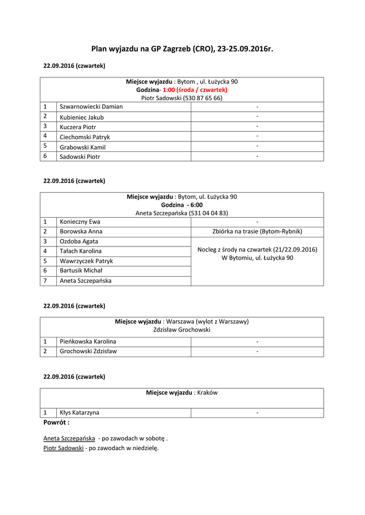 Plan wyjazdu na GP Zagrzeb (CRO), 23-25.09.2016r. 22.09.2016 (czwartek) Miejsce wyjazdu : Bytom , ul. Łużycka 90 Godzina- 1:00 (środa / czwartek) Piotr Sadowski (530 87 65 66) 1 2 3 4 5 6 Szwarnowiecki Damian - Kubieniec Jakub Kuczera Piotr Ciechomski Patryk Grabowski Kamil Sadowski Piotr - 22.09.2016 (czwartek) Miejsce wyjazdu : Bytom, ul. Łużycka 90 Godzina - 6:00 Aneta Szczepańska (531 04 04 83) 1 2 Konieczny Ewa Borowska Anna 3 4 5 6 Ozdoba Agata Tałach Karolina Wawrzyczek Patryk Bartusik Michał 7 Aneta Szczepańska Zbiórka na trasie (Bytom-Rybnik) Nocleg z środy na czwartek (21/22.09.2016) W Bytomiu, ul. Łużycka 90 22.09.2016 (czwartek) Miejsce wyjazdu : Warszawa (wylot z Warszawy) Zdzisław Grochowski 1 2 Pieńkowska Karolina Grochowski Zdzisław - 22.09.2016 (czwartek) Miejsce wyjazdu : Kraków 1 Kłys Katarzyna Powrót : Aneta Szczepańska - po zawodach w sobotę . Piotr Sadowski - po zawodach w niedzielę. -