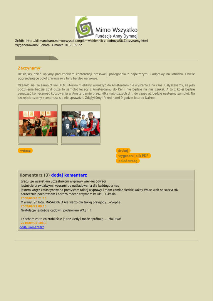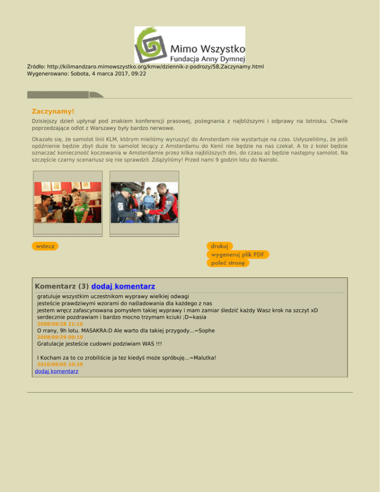 Źródło: http://kilimandzaro.mimowszystko.org/kmw/dziennik-z-podrozy/58,Zaczynamy.html Wygenerowano: Sobota, 4 marca 2017, 09:22 Zaczynamy! Dzisiejszy dzień upłynął pod znakiem konferencji prasowej, pożegnania z najbliższymi i odprawy na lotnisku. Chwile poprzedzające odlot z Warszawy były bardzo nerwowe. Okazało się, że samolot linii KLM, którym mieliśmy wyruszyć do Amsterdam nie wystartuje na czas. Usłyszeliśmy, że jeśli opóźnienie będzie zbyt duże to samolot lecący z Amsterdamu do Kenii nie będzie na nas czekał. A to z kolei będzie oznaczać konieczność koczowania w Amsterdamie przez kilka najbliższych dni, do czasu aż będzie następny samolot. Na szczęście czarny scenariusz się nie sprawdził. Zdążyliśmy! Przed nami 9 godzin lotu do Nairobi. Komentarz (3) dodaj komentarz gratuluje wszystkim uczestnikom wyprawy wielkiej odwagi jesteście prawdziwymi wzorami do naśladowania dla każdego z nas jestem wręcz zafascynowana pomysłem takiej wyprawy i mam zamiar śledzić każdy Wasz krok na szczyt xD serdecznie pozdrawiam i bardzo mocno trzymam kciuki ;D~kasia 2008/09/28 21:10 O rrany, 9h lotu. MASAKRA:D Ale warto dla takiej przygody...~Sophe 2008/09/29 09:10 Gratulacje jesteście cudowni podziwiam WAS !!! I Kocham za to co zrobiliście ja tez kiedyś może spróbuję...~Malutka! 2010/09/05 10:39 dodaj komentarz
