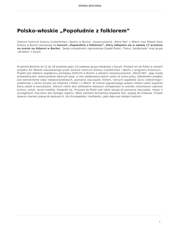 GMINA BOCHNIA Polsko-włoskie „Popołudnie z folklorem” Gminne Centrum Kultury Czytelnictwa i Sportu w Bochni, stowarzyszenie „Word Net” z Włoch oraz Miejski Dom Kultury w Bochni zapraszają na koncert „Popołudnie z folklorem”, który odbędzie się w sobotę 17 września na scenie na Uzborni w Bochni. Swoje umiejętności zaprezentuje Zespół Pieśni i Tańca „Siedlecanie” oraz grupa „Amastra” z Sycylii. W gminie Bochnia od 12 do 18 września gości 22-osobowa grupa młodzieży z Sycylii. Przybyli oni do Polski w ramach projektu Art Market realizowanego przez Gminne Centrum Kultury Czytelnictwa i Sportu z programu Erasmus+. Projekt jest efektem współpracy pomiędzy GCKCziS w Bochni a włoskim stowarzyszeniem „World Net”. Jego myślą przewodnią jest wykorzystanie własnych pasji, w celu zwiększenia swoich szans na rynku pracy. Założeniem projektu jest wzmocnienie więzi międzynarodowych, poznanie zwyczajów, historii, różnych aspektów życia codziennego i problemów z jakimi boryka się młodzież z Polski i z Włoch. W trakcie tygodniowego pobytu młodzi ludzie wspólnie biorą udział w warsztatach, których celem jest szlifowanie własnych umiejętności w szeroko rozumianym zakresie kultury, sztuki, social mediów, fotografii itp. Przyjazd do Polski jest także okazją do poznania zwyczajów, miejsc o szczególnym znaczeniu dla naszego regionu. Włosi zwiedzili bocheńską Kopalnię Soli, wyjadą do Krakowa. Projekt stwarza również szansę do dyskusji nt. Unii Europejskiej i możliwości, jakie daje ona młodym ludziom. 1 GMINA BOCHNIA 2