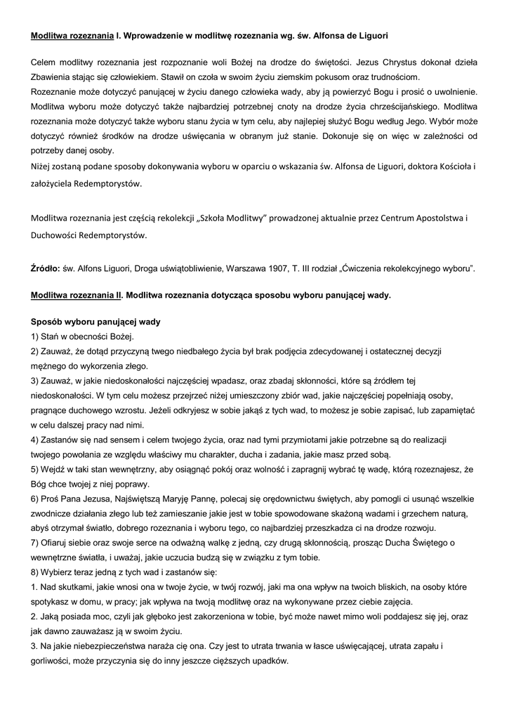 Modlitwa rozeznania I. Wprowadzenie w modlitwę rozeznania wg. św. Alfonsa de Liguori Celem modlitwy rozeznania jest rozpoznanie woli Bożej na drodze do świętości. Jezus Chrystus dokonał dzieła Zbawienia stając się człowiekiem. Stawił on czoła w swoim życiu ziemskim pokusom oraz trudnościom. Rozeznanie może dotyczyć panującej w życiu danego człowieka wady, aby ją powierzyć Bogu i prosić o uwolnienie. Modlitwa wyboru może dotyczyć także najbardziej potrzebnej cnoty na drodze życia chrześcijańskiego. Modlitwa rozeznania może dotyczyć także wyboru stanu życia w tym celu, aby najlepiej służyć Bogu według Jego. Wybór może dotyczyć również środków na drodze uświęcania w obranym już stanie. Dokonuje się on więc w zależności od potrzeby danej osoby. Niżej zostaną podane sposoby dokonywania wyboru w oparciu o wskazania św. Alfonsa de Liguori, doktora Kościoła i założyciela Redemptorystów. Modlitwa rozeznania jest częścią rekolekcji „Szkoła Modlitwy” prowadzonej aktualnie przez Centrum Apostolstwa i Duchowości Redemptorystów. Źródło: św. Alfons Liguori, Droga uświątobliwienie, Warszawa 1907, T. III rodział „Ćwiczenia rekolekcyjnego wyboru”. Modlitwa rozeznania II. Modlitwa rozeznania dotycząca sposobu wyboru panującej wady. Sposób wyboru panującej wady 1) Stań w obecności Bożej. 2) Zauważ, że dotąd przyczyną twego niedbałego życia był brak podjęcia zdecydowanej i ostatecznej decyzji mężnego do wykorzenia złego. 3) Zauważ, w jakie niedoskonałości najczęściej wpadasz, oraz zbadaj skłonności, które są źródłem tej niedoskonałości. W tym celu możesz przejrzeć niżej umieszczony zbiór wad, jakie najczęściej popełniają osoby, pragnące duchowego wzrostu. Jeżeli odkryjesz w sobie jakąś z tych wad, to możesz je sobie zapisać, lub zapamiętać w celu dalszej pracy nad nimi. 4) Zastanów się nad sensem i celem twojego życia, oraz nad tymi przymiotami jakie potrzebne są do realizacji twojego powołania ze względu właściwy mu charakter, ducha i zadania, jakie masz przed sobą. 5) Wejdź w taki stan wewnętrzny, aby osiągnąć pokój oraz wolność i zapragnij wybrać tę wadę, którą rozeznajesz, że Bóg chce twojej z niej poprawy. 6) Proś Pana Jezusa, Najświętszą Maryję Pannę, polecaj się orędownictwu świętych, aby pomogli ci usunąć wszelkie zwodnicze działania złego lub też zamieszanie jakie jest w tobie spowodowane skażoną wadami i grzechem naturą, abyś otrzymał światło, dobrego rozeznania i wyboru tego, co najbardziej przeszkadza ci na drodze rozwoju. 7) Ofiaruj siebie oraz swoje serce na odważną walkę z jedną, czy drugą skłonnością, prosząc Ducha Świętego o wewnętrzne światła, i uważaj, jakie uczucia budzą się w związku z tym tobie. 8) Wybierz teraz jedną z tych wad i zastanów się: 1. Nad skutkami, jakie wnosi ona w twoje życie, w twój rozwój, jaki ma ona wpływ na twoich bliskich, na osoby które spotykasz w domu, w pracy; jak wpływa na twoją modlitwę oraz na wykonywane przez ciebie zajęcia. 2. Jaką posiada moc, czyli jak głęboko jest zakorzeniona w tobie, być może nawet mimo woli poddajesz się jej, oraz jak dawno zauważasz ją w swoim życiu. 3. Na jakie niebezpieczeństwa naraża cię ona. Czy jest to utrata trwania w łasce uświęcającej, utrata zapału i gorliwości, może przyczynia się do inny jeszcze cięższych upadków. 9) Tę samą drogę rozeznania wewnętrznego dokonaj z kolejnymi wybranymi przez ciebie wadami. Rozważ ich skutki, moc i niebezpieczeństwo w swoim życiu. 10) Zastanów się teraz, która z tych wad w największym stopniu sprzeciwia się realizacji twojego powołania i głównego celu życia, która przynosi ci najwięcej szkody, która jest najbardziej natarczywą i której powinieneś najbardziej unikać. 11) Staraj się teraz dotrzeć do głównego źródła tej wady. 12) Rozważa, jakich okazji trzeba ci unikać. 13) Zastanów się, jakie środki należy podjąć w celu poprawy. 14) Pomyśl, co poradziłabyś osobie zaprzyjaźnionej z tobą, jeżeli prosiłaby cię o poradę w tej kwestii. 15) Wyobraź sobie, że gdybyś dowiedział, się że wkrótce maiłabyś umrzeć, jaki wtedy byłby twój wybór? 16) Wyobraź sobie, że stoisz przed Bogiem. Czy pochwalisz ten wybór wady i środków do jej wykorzenienia? 17) Przedstaw Bogu ten wybór i ofiaruj Panu Jezusowi, prosząc Go, aby przyjął go i dodał ci pomocy do jego wykorzenienia. 18) Powierz ten wybór Matce Bożej, wezwij jej orędownictwa, prosząc o opiekę na drodze wytrwałości w dobrym. 19) Rozeznaj, czy w czasie modlitwy czujesz pokój, jasność, utwierdzenie i zapał do rozwoju, czy przeciwnie? 20) Poradź się także odnośnie tej sprawy z osobą, która prowadzi cię w tych rekolekcjach, lub też z twoim kierownikiem duchowym. Wady zwyczajne do wyboru 1) Niedbałość i opieszałość w staraniu się o rozwój życia duchowego 2) Brak skupienia i czuwania nad sobą. 3) Miłość własna, przesadne pragnienie bycia w centrum zainteresowania, próżność, chęć podobania się, względy ludzkie. 4) Nieposłuszeństwo przełożonym, autorytetom, brak zaparcia siebie samego na poziomie rozumu i woli, skłonność do niewłaściwej interpretacji otrzymywanych poleceń. 5) Brak prostoty i szczerości w postępowaniu z bliźnimi, przełożonymi. 6) Przebiegłość, staranie się o przychylność poprzez pochlebstwo, szukanie zaszczytnych lub dogadzających zajęć, upokarzanie innych, itp. 7) Zamiłowanie do własnego zdania, upór. 8) Skłonność do zazdrości, osądzania, nadmierne zwracanie uwagi, przekorne postępowanie, zadowolenia z cudzych błędów, różne formy złośliwości. 9) Niechęć, szorstkość, zgryźliwość, dotkliwe żarty. 10) Obrażanie się, niezgoda, sprzeczki i gniew. 11) Obmowy, szemrania, krytykowanie, użalanie się na wszystkich i na wszystko. 12) Próżnowanie, strata czasu, niedbalstwo, b