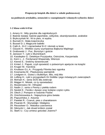 Propozycje książek dla dzieci w szkole podstawowej na podstawie artykułów, zestawień w czasopismach i własnych wyborów dzieci 1-2 klasa wiek 6-8 lat 1. Amery H.: Mity greckie dla najmłodszych 2. Baśnie świata: baśnie japońskie, celtyckie, skandynawskie, arabskie 3. Brykczyński M.: Ni to pies, ni wydra. 4. Burnett H.: Mała księżniczka 5. Bussel D.:L Magiczne baletki 6. Cath A.: 8+2 i ciężarówka/ 8+2 i domek w lesie 7. Giżycki K.: Wielkie czyny szympansa Bajbuna Mądrego 8. Grabowski J.: Puc, Bursztyn i goście 9. Jansson T.: cykl o Muminkach 10. Kasdepke G.: Detektyw Pozytywka, Ostrożnie, Kacperiada 11. Kern L. J.: Ferdynand Wspaniały, Wiersze 12. Kiereś E.: Srebrny dzwoneczek 13. Kmieć J.: Papuk, czyli opowieść o potwornym apetycie na książki 14. Kruger M.: Karolcia 15. Knuttson G.L.A.: Przygody Filonka bez ogonka 16. Kownacka M.: Plastusiowy pamiętnik 17. Lindgren A.: Dzieci z Bullerbyn, Mio, mój Mio 18. Lofting H.: cykl o przygodach Dr Dolittla i jego mówiących zwierzętach 19. McKain K.: seria SOS dla zwierząt 20. Majger K. Misiek, co ty opowiadasz 21. Musierowicz M.: Hihopter 22. Nadin J.: seria o Penny z piekła rodem 23. Nesbit E.: Feniks i dywan oraz kolejne części cyklu 24. Olech J. Pompon w rodzinie Fisiów 25. Onichimowska A.: Najwyższa góra świata 26. Papuzińska J.: Asiunia 27. Pawlak R.: Czaruś, pies z charakterem 28. Pisarski R.: Wyrwidąb i Waligóra 29. Reusslwer O.: Malutka czarownica 30. Sikirycki I.: Jak drwal królem został 31. Stark U.: Czy umiesz gwizdać Joanno? 3-4 klasa wiek 8 – 10 lat 1. Amicis E.: Serce 2. Burnett E.H.: Tajemniczy ogród 3. Caroll L.: Alicja w krainie czarów 4. Dahl R.: Matylda 5. Jansonn T.: cykl o Muminkach 6. Jaworczakowa A.:Oto jest Kasia 7. Kipling R.: Księga dżungli 8. Knight E.: Lassie, wróć! 9. Lindgren A.: Bracia Lwie Serce, Ronja, córka zbójnika 10. Lewis C.S.: cykl Opowieści z Narnii 11. Masiuk O.: Lenka, Fryderyk i podróże 12. Milne A.A:Chatka Puchatka 13. Montgomery L.M.: seria Ania z Zielonego Wzgórza 14. Onichimowska A.: Dzień czekolady 15. Rowling K.J.: cykl przygód Harrego Pottera 16. Sempe, Goscinny: cykl o Mikołajku 17. Strzałkowskja M.: Rady nie od parady 18. Tolkien J.R.: Hobbit 19. Twain M.: Przygody Tomka Sawyera, Królewicz i żebrak 20. Witek R.: Klub latający ciotek 5-6 klasa wiek 10-13 lat 1. Beręsewicz P.: A niech to czekolada 2. Dickens Ch.: Oliwer Twist 3. Doyle A.C.: Przygody Sherlocka Holmesa 4. Ende M.: Momo, Nie kończąca się opowieść 5. Flanagan J.: Zwiadowcy 6. Gaarder J.: Magiczna biblioteka Bibbi Boken, Przepowiednia Jokera, Hej! Czy jest tu kto? 7. Grabowski A.: Wojna na pięknym brzegu 8. Kosik R.: cykl Felix, Net i Nika 9. Le Guin, Ursula: cykl Czarnoksiężnik z Archipelagu 10. Lee H.: Zabić drozda 11. Makowiecki W.: Przygody Meliklesa Greka 12. Makuszyński K.: Szatan z siódmej klasy 13. Mull B.: Baśniobór 14. Musierowicz M.: cykl Jeżycjada 15. Nienacki Z.: cykl o przygodach Pana Samochodzika 16. Niziurski E.: Siódme wtajemniczenie, Sposób na Alcybiadesa, Szkolny lud, Okulla i ja, Klub włóczykijów i inne 17. Papuzińska M.: Wszystko jest możliwe 18. Paterson K.: Most do Terabithi 19. Roth V.: cykl Niezgodna 20. Szklarski A.: cykl o przygodach Tomka Wilmowskiego 21. Simon F.: Koszmarny Karolek 22. Tolkien J.R.R: Władca Pierścieni 23. Widmark M.: Biuro detektywistyczne Lassego i Mai 24. Wojtyszko M.: seria o Brombie 25. Verne J.: W 80 dni dookoła świata, Tajemnicza wyspa i inne pozycje tego autora 26. Zuzak L.: Złodziejka książek