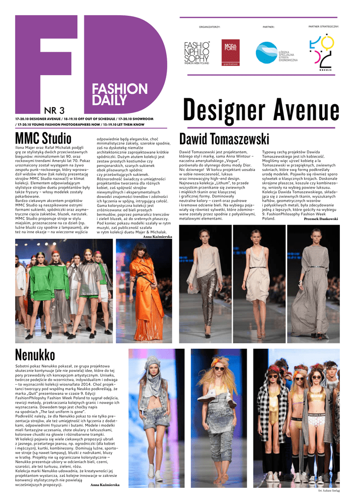 organizatorZY: NR 3 17-20.10 DESIGNER AVENUE / 18-19.10 Off out of schedule / 17-20.10 Showroom / 17-20.10 Young Fashion Photographers NOW / 15-19.10 LET THEM KNOW MMC Studio Ilona Majer oraz Rafał Michalak podjęli grę ze stylistyką dwóch przeciwstawnych biegunów: minimalizmem lat 90. oraz rockowymi trendami Ameryki lat 70. Pokaz urozmaicony został występem na żywo zespołu punk-rockowego, który wprowadził widzów show (tak należy prezentację strojów MMC Studio nazwać!) w klimat kolekcji. Elementem odpowiadającym stylistyce strojów duetu projektantów były także fryzury - włosy modelek zostały pokarbowane. Bardzo ciekawym akcentem projektów MMC Studio są naszpikowane ostrymi formami sukienki, spódniczki oraz asymetryczne cięcia żakietów, bluzek, narzutek. MMC Studio proponuje stroje w stylu miejskim, przeznaczone na co dzień (np. luźne bluzki czy spodnie z lampasami), ale też na inne okazje – na wieczorne wyjścia odpowiednie będą eleganckie, choć minimalistyczne żakiety, szerokie spodnie, zaś na dyskotekę niemalże architektonicznie zaprojektowane krótkie spódniczki. Dużym atutem kolekcji jest zestaw prostych kostiumów czy pensjonarskich, szarych sukienek obok plisowanych spódnic czy prześwitujących sukienek. Różnorodność świadczy o umiejętności projektantów tworzenia dla różnych kobiet, zaś spójność strojów niewymyślnych i eksperymentalnych dowodzi znajomości trendów i zdolności ich łączenia w spójną, intrygującą całość. Gama kolorystyczna kolekcji jest zróżnicowana: od bieli prostych bermudów, poprzez pomarańcz trenczów i zieleń bluzek, aż do srebrnych płaszczy. Pod koniec pokazu modelki szalały w rytm muzyki, zaś publiczność szalała w rytm kolekcji duetu Majer & Michalak. partner: Partner strategiczny: Designer Avenue Dawid Tomaszewski Dawid Tomaszewski jest projektantem, którego styl i markę, sama Anna Wintour naczelna amerykańskiego „Vogue”, porównała do słynnego domu mody Dior. Nic dziwnego! W końcu projektant uosabia w sobie nowoczesność, luksus oraz innowacyjny high-end design. Najnowsza kolekcja „Lithum”, to przede wszystkim przenikanie się zwiewnych i miękkich tkanin oraz klasycznej i graficznej formy. Dominowały neutralne kolory – czerń oraz pudrowe i kremowe odcienie bieli. Na wybiegu pojawiały się również sylwetki, które zdominowane zostały przez spodnie z połyskliwymi, metalowymi elementami. Typową cechą projektów Dawida Tomaszewskiego jest ich kobiecość. Mogliśmy więc ujrzeć kobietę a la Tomaszewski w przepięknych, zwiewnych sukniach, które swą formą podkreślały urodę modelek. Pojawiło się również sporo sylwetek o klasycznych krojach. Doskonale skrojone płaszcze, koszule czy kombinezony, wniosły na wybieg powiew luksusu. Kolekcja Dawida Tomaszewskiego, składająca się z zwiewnych tkanin, wyszukanych haftów, geometrycznych wzorów i połyskliwych metali, była zdecydowanie jedną z lepszych, które gościły na wybiegu 9. FashionPhilosophy Fashion Week Poland. Przemek Dankowski Anna Kaźmierska Nenukko Sobotni pokaz Nenukko pokazał, ze grupa projektowa skutecznie kontynuuje (ale nie powiela) idee, które do tej pory przewodziły ich koncepcjom artystycznym. Uniseks, twórcze podejście do wzornictwa, indywidualizm i odwaga – to wyznaczniki kolekcji wiosna/lato 2014. Choć projektanci tworzący pod wspólną marką Neukko podkreślają, że marka „Quit” prezentowana w czasie 9. Edycji FashionPhilopshy Fashion Week Poland to sygnał odejścia, rewizji metody, przekraczania kolejnych granic i nowego ich wyznaczania. Dowodem tego jest choćby napis na spodniach „The last uniform is gone”. Podkreślić należy, że dla Nenukko pokaz to nie tylko prezentacja strojów, ale też umiejętność ich łączenia z dodatkami, odpowiednimi fryzurami i butami. Modele i modelki mieli fantazyjne uczesania, złote okulary z łańcuszkami, kolorowe chustki na głowie i różnobarwne trampki. W kolekcji pojawia się wiele ciekawych propozycji ubrań z jasnego, przetartego jeansu, np. ogrodniczki (dla kobiet i mężczyzn), kurtki, kombinezony. Dominują luźne, sportowe stroje (są nawet lampasy), bluzki z nadrukami, bluzy w kratkę. Projekty nie są ograniczane kolorystycznie – Nenukko prezentuje ubiory w odcieniach bieli, czerni, szarości, ale też turkusu, zieleni, różu. Kolekcja marki Nenukko udowadnia, że kreatywności jej projektantom wystarcza, zaś kolejne innowacje w zakresie konwencji stylistycznych nie powielają wcześniejszych propozycji. Anna Kaźmierska fot. Łukasz Szeląg 2 Natalia Jaroszewska Natalia Jaroszewska to projektantka, którą magazyn „Elle” uznał jedną z nadziei polskiej mody. Jej wizytówką jest „200% kobiecości”, które cechuje lekkość, ruch oraz najwyższa jakość. Najnowsza kolekcja „Summer of Love” nawiązuje do słynnego Lata Miłości z 1967 r. w Haight-Ashbury. Na kolekcję składają się wygodne, miękkie i ultrakobiece sukienki utrzymane w stylu boho. Proste formy i wysokiej jakości materiały tworzą ze sobą zgrany duet, który doskonale pasuje do szybkiego miejskiego życia. Kolekcja utrzymana w tonacji pudrowego różu została przełamana akcentami czerni. Skórzane detale wzbogacają eteryczne sylwetki i dodają kreacjom buntowniczy charakter. Koronkowe sukienki to alternatywa dla kobiet lubiących delikatne i subtelne faktury. Kulminacyjnym momentem pokazu była prezentacja zwiewnej sukni z piórami znakomicie podkreślająca kobiece kształty. Kolekcję wzbogacała etniczna biżuteria. Najnowsze stroje Natalii Jaroszewskiej podkreślają to co w kobiecie najważniejsze – delikatność, eteryczność oraz subtelność. Kinga Wydrych Michał Szulc Kolekcję wiosna/lato 2014 Michała Szulca najprościej można opisać jako geometryczny minimalizm, który stał się już charakterystyczny dla projektanta. Zdecydowana większość sylwetek została zbudowana na zasadzie figu
