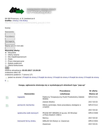 06-300 Przasnysz, ul. B. Joselewicza 6 Grafika : drukuj / nie drukuj http://www.pupprzasnysz.pl/oferta/oferty_pracy/st:1.html Szukaj: Stanowisko: Pracodawca: Wymagania: Ważne od (rrrr-mm-dd): Wyszukaj oferty: - Wszystkie - Oferty lokalne - Dla niepełnosprawnych - Staże - Prace interwencyjne - Roboty publiczne - Oferta konkursowa X ostatnia aktualizacja: 03.03.2017 13:20:28 znaleziono ofert: 62 znaleziono podstron: 7 (strona 1/7) Jesteś na stronie 1 Przejdź do strony 2 Przejdź do strony 3 Przejdź do strony 4 Przejdź do strony 5 Przejdź do strony 6 Uwaga, ogłoszenia otwierają się w wyskakujących okienkach typu "pop-up" Stanowisko logopeda pomocnik mechanika Pracodawca Nr oferty Lokalizacja Ważna od Publiczny Terapeutyczny Punkt Przedszkolny Zabiele Wielkie StPr/17/131 Zabiele Wielkie 2017-03-03 Oferta zamknięta. Dane pracodawcy dostępne w urzędzie StPr/17/112 2017-03-02 opiekun/ka osób starszych kierownik fermy drobiu PFLEGE MIT HERZEN 24 sp.zoo, SK Wrocław ul.Pows.Slaskich 148/11 OfPr/17/049 Niemcy 2017-03-02 GRELAVI SA Olsztyn ul. Zawiersze OfPr/17/055 Zawiersze 2017-03-01 Pracodawca elektryk/elektromechanik Stanowisko Nr oferty SOFIDEL POLAND Ciechanów ul. Mleczarska 31 OfPr/17/054 Ciechanów 2017-03-01 SOFIDEL POLAND Ciechanów ul. Mleczarska 31 OfPr/17/053 Ciechanów 2017-03-01 ABIO spółka z o o wWarszawie ul.Karczewska 18 OfPr/17/052 Ciechanów 2017-03-01 specj.ds rynku nieruchomości ORANGE REAL ESTATE sp. zo o Bydgoszcz ul.Chodkiewicza 61 OfPr/17/051 Ciechanów 2017-03-01 Oferta zamknięta. Dane pracodawcy dostępne w urzędzie StPr/17/125 pracownik papierni/operator konserwator/elektryk sprzedawca na stacji paliw 2017-03-01 kierownik fermy drobiu GRELAVI SA Olsztyn ul.Piłsudskiego 72c OfPr/17/050 Sykstyny 2017-03-01 Jesteś na stronie 1 Przejdź do strony 2 Przejdź do strony 3 Przejdź do strony 4 Przejdź do strony 5 Przejdź do strony 6 - Oferta lokalna - Prace interwencyjne - Roboty publiczne - Staże - Oferta konkursowa - Dla niepełnosprawnych