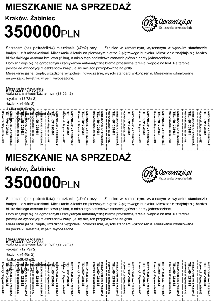 MIESZKANIE NA SPRZEDAŻ Kraków, Żabiniec 350000PLN Sprzedam (bez pośredników) mieszkanie (47m2) przy ul. Żabiniec w kameralnym, wykonanym w wysokim standardzie budynku z 8 mieszkaniami. Mieszkanie 3-letnie na pierwszym piętrze 2-piętrowego budynku. Mieszkanie znajduje się bardzo blisko ścisłego centrum Krakowa (2 km), a mimo tego sąsiedztwo stanowią głównie domy jednorodzinne. Dom znajduje się na ogrodzonym i zamykanym automatyczną bramą przesuwną terenie, wejście na kod. Na terenie posesji do dyspozycji mieszkańców znajduje się miejsce przygotowane na grilla. Mieszkanie jasne, ciepłe, urządzone wygodnie i nowocześnie, wysoki standard wykończenia. Mieszkanie odmalowane na początku kwietnia, w pełni wyposażone. MIESZKANIE NA SPRZEDAŻ TEL.:691228681 0prowizji.pl/ogloszenie/633 MIESZKANIE NA SPRZEDAŻ TEL.:691228681 0prowizji.pl/ogloszenie/633 MIESZKANIE NA SPRZEDAŻ TEL.:691228681 0prowizji.pl/ogloszenie/633 MIESZKANIE NA SPRZEDAŻ TEL.:691228681 0prowizji.pl/ogloszenie/633 MIESZKANIE NA SPRZEDAŻ TEL.:691228681 0prowizji.pl/ogloszenie/633 MIESZKANIE NA SPRZEDAŻ TEL.:691228681 0prowizji.pl/ogloszenie/633 MIESZKANIE NA SPRZEDAŻ TEL.:691228681 0prowizji.pl/ogloszenie/633 MIESZKANIE NA SPRZEDAŻ TEL.:691228681 0prowizji.pl/ogloszenie/633 MIESZKANIE NA SPRZEDAŻ TEL.:691228681 0prowizji.pl/ogloszenie/633 MIESZKANIE NA SPRZEDAŻ TEL.:691228681 0prowizji.pl/ogloszenie/633 MIESZKANIE NA SPRZEDAŻ TEL.:691228681 0prowizji.pl/ogloszenie/633 MIESZKANIE NA SPRZEDAŻ TEL.:691228681 0prowizji.pl/ogloszenie/633 MIESZKANIE NA SPRZEDAŻ TEL.:691228681 0prowizji.pl/ogloszenie/633 MIESZKANIE NA SPRZEDAŻ TEL.:691228681 0prowizji.pl/ogloszenie/633 Mieszkanie składa się z: KONTAKT: 691228681 -salonu z aneksem kuchennym (29,53m2), -sypialni (12,73m2), -łazienki (4,49m2), -balkonu(6,43m2), Dodatkowo do mieszkania przynależy: -piwnica(4,24m2). MIESZKANIE NA SPRZEDAŻ Kraków, Żabiniec 350000PLN Sprzedam (bez pośredników) mieszkanie (47m2) przy ul. Żabiniec w kameralnym, wykonanym w wysokim standardzie budynku z 8 mieszkaniami. Mieszkanie 3-letnie na pierwszym piętrze 2-piętrowego budynku. Mieszkanie znajduje się bardzo blisko ścisłego centrum Krakowa (2 km), a mimo tego sąsiedztwo stanowią głównie domy jednorodzinne. Dom znajduje się na ogrodzonym i zamykanym automatyczną bramą przesuwną terenie, wejście na kod. Na terenie posesji do dyspozycji mieszkańców znajduje się miejsce przygotowane na grilla. Mieszkanie jasne, ciepłe, urządzone wygodnie i nowocześnie, wysoki standard wykończenia. Mieszkanie odmalowane na początku kwietnia, w pełni wyposażone. MIESZKANIE NA SPRZEDAŻ TEL.:691228681 0prowizji.pl/ogloszenie/633 MIESZKANIE NA SPRZEDAŻ TEL.:691228681 0prowizji.pl/ogloszenie/633 MIESZKANIE NA SPRZEDAŻ TEL.:691228681 0prowizji.pl/ogloszenie/633 MIESZKANIE NA SPRZEDAŻ TEL.:691228681 0prowizji.pl/ogloszenie/633 MIESZKANIE NA SPRZEDAŻ TEL.:691228681 0prowizji.pl/ogloszenie/633 MIESZKANIE NA SPRZEDAŻ TEL.:691228681 0prowizji.pl/ogloszenie/633 MIESZKANIE NA SPRZEDAŻ TEL.:691228681 0prowizji.pl/ogloszenie/633 MIESZKANIE NA SPRZEDAŻ TEL.:691228681 0prowizji.pl/ogloszenie/633 MIESZKANIE NA SPRZEDAŻ TEL.:691228681 0prowizji.pl/ogloszenie/633 MIESZKANIE NA SPRZEDAŻ TEL.:691228681 0prowizji.pl/ogloszenie/633 MIESZKANIE NA SPRZEDAŻ TEL.:691228681 0prowizji.pl/ogloszenie/633 MIESZKANIE NA SPRZEDAŻ TEL.:691228681 0prowizji.pl/ogloszenie/633 MIESZKANIE NA SPRZEDAŻ TEL.:691228681 0prowizji.pl/ogloszenie/633 MIESZKANIE NA SPRZEDAŻ TEL.:691228681 0prowizji.pl/ogloszenie/633 Mieszkanie składa się z: KONTAKT: 691228681 -salonu z aneksem kuchennym (29,53m2), -sypialni (12,73m2), -łazienki (4,49m2), -balkonu(6,43m2), Dodatkowo do mieszkania przynależy: -piwnica(4,24m2).