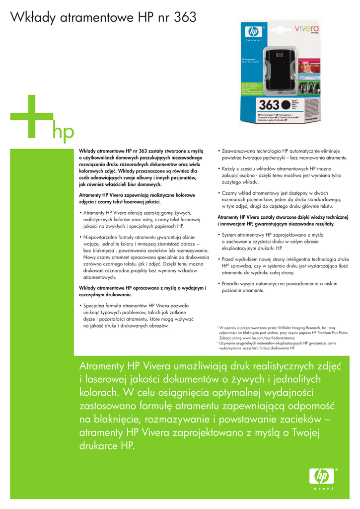 Wkłady atramentowe HP nr 363 Wkłady atramentowe HP nr 363 zostały stworzone z myl o uytkownikach domowych poszukujcych niezawodnego rozwizania druku rónorodnych dokumentów oraz wielu kolorowych zdjć. Wkłady przeznaczone s równie dla osób odnawiajcych swoje albumy i innych pasjonatów, jak równie włacicieli biur domowych. • Zaawansowana technologia HP automatycznie eliminuje powietrze tworzce pcherzyki – bez marnowania atramentu. Atramenty HP Vivera zapewniaj realistyczne kolorowe zdjcia i czarny tekst laserowej jakoci. • Czarny wkład atramentowy jest dostpny w dwóch rozmiarach pojemników, jeden do druku standardowego, w tym zdjć, drugi do czstego druku głównie tekstu. • Atramenty HP Vivera oferuj szerok gam ywych, realistycznych kolorów oraz ostry, czarny tekst laserowej jakoci na zwykłych i specjalnych papierach HP. Atramenty HP Vivera zostały stworzone dziki wiedzy technicznej i innowacjom HP, gwarantujcym niezawodne rezultaty. • Niepowtarzalne formuły atramentu gwarantuj olniewajce, jednolite kolory i mniejsz ziarnistoć obrazu – bez blaknicia1, powstawania zacieków lub rozmazywania. Nowy czarny atrament opracowano specjalnie do drukowania zarówno czarnego tekstu, jak i zdjć. Dziki temu mona drukować rónorodne projekty bez wymiany wkładów atramentowych. Wkłady atramentowe HP opracowano z myl o wydajnym i oszczdnym drukowaniu. • Specjalna formuła atramentów HP Vivera pozwala uniknć typowych problemów, takich jak zatkane dysze i pozostałoci atramentu, które mog wpływać na jakoć druku i drukowanych obrazów. • Kady z szeciu wkładów atramentowych HP mona zakupić osobno - dziki temu moliwa jest wymiana tylko zuytego wkładu. • System atramentowy HP zaprojektowano z myl o zachowaniu czystoci druku w całym okresie eksploatacyjnym drukarki HP. • Przed wydrukiem nowej strony inteligentna technologia druku HP2 sprawdza, czy w systemie druku jest wystarczajca iloć atramentu do wydruku całej strony. • Ponadto wysyła automatyczne powiadomienia o niskim poziomie atramentu. 1 2 W oparciu o przeprowadzone przez Wilhelm Imaging Research, Inc. testy odpornoci na blaknicie pod szkłem, przy uyciu papieru HP Premium Plus Photo. Zobacz stron www.hp.com/eur/faderesistance Uywanie oryginalnych materiałów eksploatacyjnych HP gwarantuje pełne wykorzystanie wszystkich funkcji drukowania HP. Atramenty HP Vivera umoliwiaj druk realistycznych zdjć i laserowej jakoci dokumentów o ywych i jednolitych kolorach. W celu osignicia optymalnej wydajnoci zastosowano formuł atramentu zapewniajc odpornoć na blaknicie, rozmazywanie i powstawanie zacieków – atramenty HP Vivera zaprojektowano z myl o Twojej drukarce HP. Wkłady atramentowe HP nr 363 Specyfikacja produktu Numer produktu Opis Numer wyboru Wymiary (dł. x szer. x głb.) Masa C8719EE Duy czarny wkład atramentowy HP nr 363 363 140 x 112 x 44 mm 70g C8721EE Czarny wkład atramentowy HP nr 363 363 140 x 112 x 44 mm 50g C8771EE Błkitny wkład atramentowy HP nr 363 363 140 x 114 x 36 mm 40g C8772EE Purpurowy wkład atramentowy HP nr 363 363 140 x 114 x 36 mm 40g C8773EE ółty wkład atramentowy HP nr 363 363 140 x 114 x 36 mm 40g C8774EE Jasnobłkitny wkład atramentowy HP nr 363 363 140 x 114 x 36 mm 40g C8775EE Jasnopurpurowy wkład atramentowy HP nr 363 363 140 x 114 x 36 mm 40g Informacje na temat wydajnoci znajduj si na stronie www.hp.com/pageyield Wkłady atramentowe s przeznaczone do sprzeday wyłcznie w krajach UE i EFTA oraz w BG, RO, MD, TR, AL, BIH, YU, MK, HR. © 2005 Hewlett-Packard Development Company, L.P. Specyfikacje zawarte w tym dokumencie mog bez uprzedzenia ulec zmianie. Wszystkie gwarancje udzielane w odniesieniu do produktów i usług HP okrelone zostały w owiadczeniach gwarancyjnych załczanych do kadego produktu i usługi. aden zapis niniejszego dokumentu nie moe być uwaany za dodatkow gwarancj. HP nie ponosi odpowiedzialnoci za błdy techniczne lub drukarskie w niniejszym dokumencie. Wicej informacji na temat materiałów eksploatacyjnych HP mona uzyskać pod adresem www.hp.pl 5983-2807PLE, 08/2005