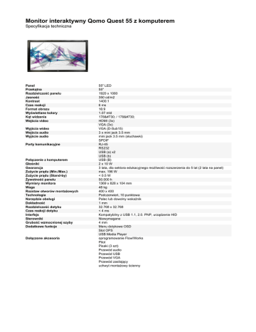 Monitor interaktywny Qomo Quest 55 z komputerem Specyfikacja techniczna Panel Przekątna Rozdzielczość panelu Jasność Kontrast Czas reakcji Format obrazu Wyświetlane kolory Kąt widzenia Wejścia video Wyjścia wideo Wejścia audio Wyjście audio Porty komunikacyjne Połączenie z komputerem Głośniki Gwarancja Zużycie prądu (Min./Max.) Zużycie prądu (Stand-by) Żywotność panelu Wymiary monitora Waga Rozstaw otworów montażowych Technologia Narzędzie obsługi Dokładność Rozdzielczość dotyku Czas reakcji dotyku Interfejs Sterowniki Grubość wzmocnionej szyby Dodatkowe funkcje Dołączone akcesoria 55" LED 55" 1920 x 1080 350 cd/m2 1400:1 6 ms 16:9 1.07 mld 178˚ / 178˚ HDMI (3x) VGA (3x) VGA (D-Sub15) 3 x mini jack 3.5 mm mini jack 3.5 mm (słuchawki) SPDIF RJ-45 RS232 USB (a) x2 USB (b) USB (B) 2 x 10 W 3 lata, dla sektora edukacyjnego możliwość rozszerzenia do 5 lat (2 lata na panel) max. 196 W < 0.5 W 50.000 h 1369 x 828 x 104 mm 48 kg 400 x 400 Podczerwień, 10 punktowa Palec lub dowolny wskaźnik 1 mm 32.768 x 32.768 < 4 ms Kompatybilny z USB 1.1, 2.0. PNP, urządzenie HID Niewymagane 4 mm Menu dotykowe OSD Slot OPS USB Media Player oprogramowanie Flow!Works Pilot Pisaki (3 szt) Przewód audio Przewód USB Przewód VGA Przewód zasilający uchwyt montażowy ścienny