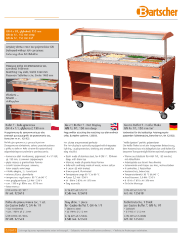 GN 4 x 1/1, głębokość 150 mm GN 4x 1/1, 150 mm deep GN 4x 1/1, 150 mm tief Artykuły dostarczane bez pojemników GN Delivered without GN-containers Lieferung ohne GN-Behälter Pasująca półka do przesuwania tac, szerokość 1460 mm Matching tray slide, width 1460 mm Passende Tablettrutsche, Breite 1460 mm składana ... tiltable ... abklappbar ... Bufet T - lada grzewcza GN 4 x 1/1, głębokość 150 mm Gastro Buffet T - Hot Display GN 4x 1/1, 150 mm deep Gastro Buffet T - Heiße Theke GN 4x 1/1, 150 mm tief Przygotowany do zamocowania po obu stronach pasującej półki do przesuwania tac, Bartscher nr art. 125503. Prepared for attaching the matching tray slide on both sides, Bartscher code-no. 125503. Vorbereitet für die beidseitige Anbringung der passenden Tablettrutsche, Bartscher Art.-Nr. 125503. Perfekcyjna prezentacja gorących potraw Zintegrowane oświetlenie, osłona przeciwkaszlowa z półką na talerze. Koła skrętne dla optymalizacji odpowiedniego ustawienia w pomieszczeniu. Hot dishes are presented perfectly The hot-display is optimally equipped with integrated lighting, cough protection, shelving and wheels for easy mobility. “Heiße Speisen” perfekt präsentieren Die Heiße Theke ist mit der integrierten Beleuchtung, dem Hustenschutz mit Ablagefunktion und Rollen für bequeme Transportmöglichkeiten optimal ausgestattet. • komora ze stali nierdzewnej, pojemność: 4 x 1/1 GN, gł. 150 mm, z zaworem odpływowym • płyta robocza z granitu Rosa Porinno • ścianki boczne i korpus z drewna, kolor orzecha włoskiego • 4 kółka skrętne, 2 z hamulcami • osłona szklana, oświetlenie • temperatura regulowana: 30 °C do 90 °C • moc przyłączeniowa: 3,0 kW / 230 V • szer. 1510 x gł. 870 x wys. 1370 mm • łatwy montaż GTIN 4015613573717 • Basin made of stainless steel, for 4 GN 1/1, 150 mm deep, with drain-tap • Worktop made of granite Rosa Porrino • Side walls and body made of wood, walnut colour • 4 castors (2 with brakes) • Sneeze guard, illuminated • Temperature range 30 °C to 90 °C • Power: 3,0 kW / 230 V • W 1510 x D 870 x H 1370 mm • Easy assembly • Wanne aus Edelstahl für 4 GN 1/1, 150 mm tief, mit Ablaufhahn • Arbeitsplatte aus Granit Rosa Porrino • Seitenwände und Korpus aus Holz, walnussfarben • 4 Lenkrollen, 2 feststellbar • Hustenschutz, beleuchtet • Temperaturbereich 30 °C bis 90 °C • Anschlusswert: 3,0 kW / 230 V • B 1510 x T 870 x H 1370 mm • Einfache Montage GTIN 4015613573717 GTIN 4015613573717 Półka do przesuwania tac, 1 szt. do Gastro Bufet T, GN 4x 1/1 Tray slide, 1 piece for Gastro Buffet T, GN 4x 1/1 Tablettrutsche, 1 Stück zur Gastro Buffet T, GN 4x 1/1 • stal nierdzewna • szer. 1460 x gł. 312 mm • Stainless steel • W 1460 x D 312 mm • Edelstahl • B 1460 x T 312 mm GTIN 4015613570846 GTIN 4015613570846 GTIN 4015613570846 Nr art. 125618 Nr art. 125503 02/2013 Code-No. 125618 Code-No. 125503 Art.-Nr. 125618 Art.-Nr. 125503 Zastrzega się prawo wprowadzania zmian technicznych. • Subject to technical modifications and errors. • Technische Änderungen vorbehalten.