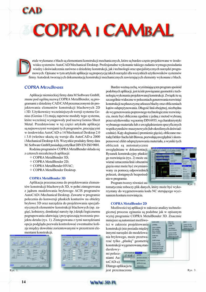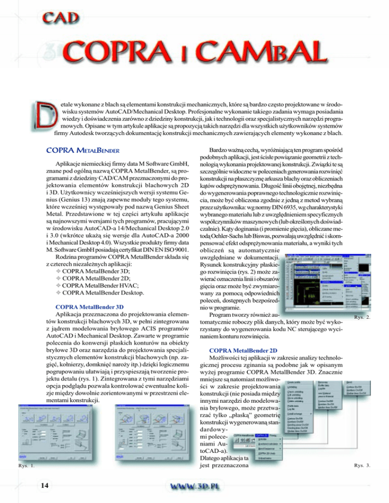 etale wykonane z blach s¹ elementami konstrukcji mechanicznych, które s¹ bardzo czêsto projektowane w rodowisku systemów AutoCAD/Mechanical Desktop. Profesjonalne wykonanie takiego zadania wymaga posiadania wiedzy i dowiadczenia zarówno z dziedziny konstrukcji, jak i technologii oraz specjalistycznych narzêdzi programowych. Opisane w tym artykule aplikacje s¹ propozycj¹ takich narzêdzi dla wszystkich u¿ytkowników systemów firmy Autodesk tworz¹cych dokumentacjê konstrukcji mechanicznych zawieraj¹cych elementy wykonane z blach. COPRA METALBENDER Aplikacje niemieckiej firmy data M Software GmbH, znane pod ogóln¹ nazw¹ COPRA MetalBender, s¹ programami z dziedziny CAD/CAM przeznaczonymi do projektowania elementów konstrukcji blachowych 2D i 3D. U¿ytkownicy wczeniejszych wersji systemu Genius (Genius 13) znaj¹ zapewne modu³y tego systemu, które wczeniej wystêpowa³y pod nazw¹ Genius Sheet Metal. Przedstawione w tej czêci artyku³u aplikacje s¹ najnowszymi wersjami tych programów, pracuj¹cymi w rodowisku AutoCAD-a 14/Mechanical Desktop 2.0 i 3.0 (wkrótce uka¿¹ siê wersje dla AutoCAD-a 2000 i Mechanical Desktop 4.0). Wszystkie produkty firmy data M. Software GmbH posiadaj¹ certyfikat DIN EN ISO 9001. Rodzina programów COPRA MetalBender sk³ada siê z czterech niezale¿nych aplikacji: ± COPRA MetalBender 3D; ± COPRA MetalBender 2D; ± COPRA MetalBender HVAC; ± COPRA MetalBender Desktop. COPRA MetalBender 3D Aplikacja przeznaczona do projektowania elementów konstrukcji blachowych 3D, w pe³ni zintegrowana z j¹drem modelowania bry³owego ACIS programów AutoCAD i Mechanical Desktop. Zawarte w programie polecenia do konwersji p³askich konturów na obiekty bry³owe 3D oraz narzêdzia do projektowania specjalistycznych elementów konstrukcji blachowych (np. zagiêæ, ko³nierzy, domkniêæ naro¿y itp.) dziêki logicznemu pogrupowaniu u³atwiaj¹ i przyspieszaj¹ tworzenie projektu detalu (rys. 1). Zintegrowana z tymi narzêdziami opcja podgl¹du pozwala kontrolowaæ ewentualne kolizje miêdzy dowolnie zorientowanymi w przestrzeni elementami konstrukcji. Rys. 1. 14 Bardzo wa¿n¹ cech¹, wyró¿niaj¹c¹ ten program sporód podobnych aplikacji, jest cis³e powi¹zanie geometrii z technologi¹ wykonania projektowanej konstrukcji. Zwi¹zki te s¹ szczególnie widoczne w poleceniach generowania rozwiniêæ konstrukcji na p³aszczyznê arkusza blachy oraz obliczeniach k¹tów odsprê¿ynowania. D³ugoæ linii obojêtnej, niezbêdna do wygenerowania poprawnego technologicznie rozwiniêcia, mo¿e byæ obliczona zgodnie z jedn¹ z metod wybran¹ przez u¿ytkownika: wg normy DIN 6935, wg charakterystyki wybranego materia³u lub z uwzglêdnieniem specyficznych wspó³czynników maszynowych (lub okrelonych dowiadczalnie). K¹ty doginania (i promienie giêcia), obliczane metod¹ Oehler-Sachs lub Biswas, pozwalaj¹ uwzglêdniæ i skompensowaæ efekt odsprê¿ynowania materia³u, a wyniki tych obliczeñ s¹ automatycznie uwzglêdniane w dokumentacji. Rysunek konstrukcyjny p³askiego rozwiniêcia (rys. 2) mo¿e zawieraæ oznaczenia linii i obszarów giêcia oraz mo¿e byæ zwymiarowany za pomoc¹ odpowiednich poleceñ, dostêpnych bezporednio w programie. Program tworzy równie¿ automatycznie roboczy plik danych, który mo¿e byæ wykorzystany do wygenerowania kodu NC steruj¹cego wycinaniem konturu rozwiniêcia. COPRA MetalBender 2D Mo¿liwoci tej aplikacji w zakresie analizy technologicznej procesu zginania s¹ podobne jak w opisanym wy¿ej programie COPRA MetalBender 3D. Znacznie mniejsze s¹ natomiast mo¿liwoci w zakresie projektowania konstrukcji (nie posiada miêdzy innymi narzêdzi do modelowania bry³owego, mo¿e przetwarzaæ tylko p³ask¹ geometriê konstrukcji wygenerowan¹ standardowymi poleceniami AutoCAD-a). Dlatego aplikacja ta jest przeznaczona Rys. 2. Rys. 3. Rys. 4 Rys. 5. Rys. 6. g³ównie do projektowania i analizy technologicznej niezbyt skomplikowanych konstrukcji blachowych, takich jak profile giête lub proste elementy typu skrzynkowego. Sk³ada siê ona z trzech podstawowych modu³ów dostêpnych np. z odpowiednich sekcji menu rozwijanego (rys. 3): Unfolder grupuje miêdzy innymi polecenia zwi¹zane z obliczeniami d³ugoci linii obojêtnej i rozwiniêcia wg normy DIN 6935, wg charakterystyki wybranego materia³u lub z uwzglêdnieniem specyficznych wspó³czynników maszynowych (lub okrelonych dowiadczalnie). Overband calculator zawiera polecenia obliczeñ k¹tów doginania i odsprê¿ynowania oraz promieni giêcia metod¹ Oehler-Sachs lub Biswas oraz wizualizacji doginania dla pojedynczych ³uków lub ca³ego profilu (rys. 4). Bend-Sequencer grupuje miêdzy innymi polecenia do obliczeñ liczby kroków zginania, które musz¹ byæ wykonane w celu uzyskania wymaganego kszta³tu profilu. COPRA MetalBender HVAC Aplikacja jest przeznaczona do parametrycznego projektowania i generowania rozwiniêæ typowych elementów i po³¹czeñ konstrukcji blachowych stosowanych w instalacjach ogrzewania, wentylacji i klimatyzacji HVAC (Heating, Ventilation, Air Conditioning). Obs³uga programu jest bardzo prosta i sk³ada siê z nastêpuj¹cych kroków: ± Wybór rodzaju elementu lub po³¹czenia z okna dialogowego lub menu (rys. 5). ± Okrelenie wartoci parametrów geometrycznych dla wybranego typu elementu oraz wybór innych opcji dostêpnych we w³aciwym dla wskazanego elementu oknie dialogowym, np. w³¹czenie generowania kodu NC, rysowanie wymiarów w charakterystycznych punktach rozwiniêcia itp. (rys. 6) ± Wstawienie rysunku wybranego elementu lub po³¹czenia oraz zwi¹zanych z nim rysunków rozwiniêæ (rys. 7). Rys. 7. COPRA MetalBender Desktop Najnowsza i najbardziej zaawansowana aplikacja firmy data M Software GmbH, przeznaczona do parametrycznego projektowania elementów konstrukcji blachowych 3D (w pe³ni zintegrowana z parametrycznym j¹drem modelowania bry³owego ACIS programu Mechanical Desktop). Po- siada pe³ny zestaw poleceñ konstrukcyjnych o