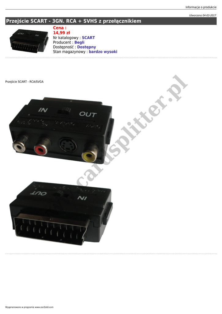 Informacje o produkcie Utworzono 04-03-2017 Przejście SCART - 3GN. RCA + SVHS z przełącznikiem Cena : 14,99 zł Nr katalogowy : SCART Producent : Begli Dostępność : Dostępny Stan magazynowy : bardzo wysoki w w w .c ar d sp lit te r .p l Przejście SCART - RCA/SVGA Wygenerowano w programie www.oscGold.com