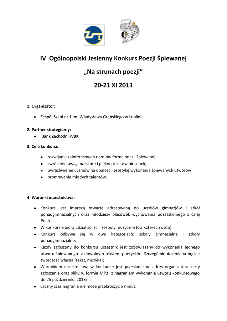 IV Ogólnopolski Jesienny Konkurs Poezji Śpiewanej „Na strunach poezji” 20-21 XI 2013 1. Organizator: Zespół Szkół nr 1 im. Władysława Grabskiego w Lublinie 2. Partner strategiczny: Bank Zachodni WBK 3. Cele konkursu: rozwijanie zainteresowań uczniów formą poezji śpiewanej; zwrócenie uwagi na istotę i piękno tekstów piosenek; uwrażliwienie uczniów na dbałość i estetykę wykonania śpiewanych utworów; promowanie młodych talentów. 4. Warunki uczestnictwa: Konkurs jest imprezą otwartą adresowaną do uczniów gimnazjów i szkół ponadgimnazjalnych oraz młodzieży placówek wychowania pozaszkolnego z całej Polski; W konkursie biorą udział soliści i zespoły muzyczne (do czterech osób); Konkurs odbywa się w dwu kategoriach: szkoły gimnazjalne i szkoły ponadgimnazjalne; Każdy zgłoszony do konkursu uczestnik jest zobowiązany do wykonania jednego utworu śpiewanego z dowolnym tekstem poetyckim. Szczególnie doceniana będzie twórczość własna (tekst, muzyka); Warunkiem uczestnictwa w konkursie jest przesłanie na adres organizatora karty zgłoszenia oraz pliku w formie MP3 z nagraniem wykonania utworu konkursowego do 25 października 2013r. ; Łączny czas nagrania nie może przekroczyć 5 minut. 5. Kryteria oceny: dobór repertuaru (wybór i dobór utworów); zgodność charakteru muzyki i poezji; ogólne wrażenie artystyczne; inwencja twórcza; forma prezentacji. 6. Przebieg konkursu: Do 25.10.2013r. należy przesłać kartę zgłoszenia i plik w formacie MP3 z nagraniem utworu kandydata; Karty zgłoszenia przyjmowane będą w następujący sposób:  listownie na adres: Zespół Szkół nr 1 im. Władysława Grabskiego ul. Podwale 11 ,20-117 Lublin z dopiskiem “IV Ogólnopolski Jesienny konkurs poezji śpiewanej”  e-mail: [email protected] Po przesłuchaniu przesłanych nagrań uczestników jury zakwalifikuje do finału konkursu, który odbędzie się 20 listopada 2013r. w Zespole Szkół nr 1 im. Władysława Grabskiego w Lublinie ul. Podwale 11; Uczestników zakwalifikowanych do finału organizator powiadomi do 10.11.2013r.; Do 15 listopada 2013 r. finaliści powinni potwierdzić udział oraz przesłać podkład muzyczny w formie pliku MP3 (listownie lub na adres e-mail podane powyżej); Finał konkursu odbędzie się: 20 listopada 2013r. o godzinie 12:00 w auli Zespołu Szkół nr 1 im. Władysława Grabskiego w Lublinie; Ogłoszenie wyników konkursu i Koncert Laureatów odbędzie się 21 listopada o godzinie 11.00 w Teatrze Starym w Lublinie. 7.Informacje dodatkowe: Nagrody są przewidziane za zajęcie I, II, III miejsca; Wszyscy finaliści IV Ogólnopolskiego Jesiennego Konkursu Poezji Śpiewanej otrzymają dyplomy; Organizatorzy zapewniają uczestnikom zamiejscowym i jednemu opiekunowi bezpłatny nocleg i wyżywienie. Koordynatorem konkursu jest Pani Iwona Smyk, która udziela wszelkich informacji związanych z konkursem, adres e-mail: [email protected]
