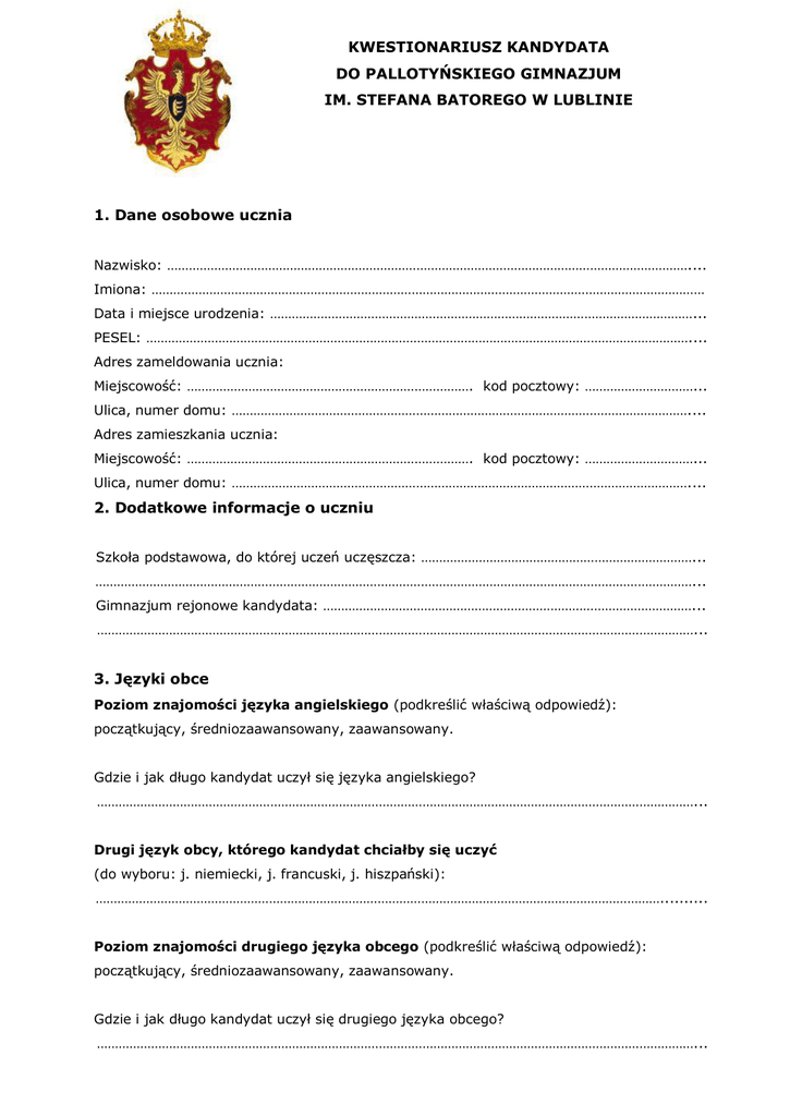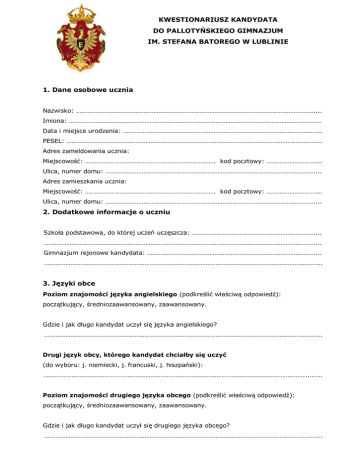 KWESTIONARIUSZ KANDYDATA DO PALLOTYŃSKIEGO GIMNAZJUM IM. STEFANA BATOREGO W LUBLINIE 1. Dane osobowe ucznia Nazwisko: ……………………………………………………………………………………………………………………………….... Imiona: ……………………………………………………………………………………………………………………………………… Data i miejsce urodzenia: ………………………………………………………………………………………………………... PESEL: …………………………………………………………………………………………………………………………………….... Adres zameldowania ucznia: Miejscowość: ……………………………………………………………………. kod pocztowy: …………………………... Ulica, numer domu: ……………………………………………………………………………………………………………….... Adres zamieszkania ucznia: Miejscowość: ……………………………………………………………………. kod pocztowy: …………………………... Ulica, numer domu: ……………………………………………………………………………………………………………….... 2. Dodatkowe informacje o uczniu Szkoła podstawowa, do której uczeń uczęszcza: …………………………………………………………………... …………………………………………………………………………………………………………………………………………………... Gimnazjum rejonowe kandydata: …………………………………………………………………………………………... …………………………………………………………………………………………………………………………………………………... 3. Języki obce Poziom znajomości języka angielskiego (podkreślić właściwą odpowiedź): początkujący, średniozaawansowany, zaawansowany. Gdzie i jak długo kandydat uczył się języka angielskiego? …………………………………………………………………………………………………………………………………………………... Drugi język obcy, którego kandydat chciałby się uczyć (do wyboru: j. niemiecki, j. francuski, j. hiszpański): ………………………………………………………………………………………………………………………………………….......... Poziom znajomości drugiego języka obcego (podkreślić właściwą odpowiedź): początkujący, średniozaawansowany, zaawansowany. Gdzie i jak długo kandydat uczył się drugiego języka obcego? …………………………………………………………………………………………………………………………………………………... 4. Osiągnięcia ucznia (szkolne i pozaszkolne: konkursy, turnieje, zawody sportowe, inne): …………………………………………………………………………………………………………………………………………………… …………………………………………………………………………………………………………………………………………………… …………………………………………………………………………………………………………………………………………………… …………………………………………………………………………………………………………………………………………………… ………………………………………………………………………………………………………………………………………........... 5. Krótka charakterystyka kandydata Dokończ podane zdania: a) Interesuję się ………………………………………………………………………………………………………….……. ………………………………………………………………………………………………………………………………….……. ………………………………………………………………………………………………………………………………………. b) Lubię ……………………………………………………………………………………………………………………………… ………………………………………………………………………………………………………………………………….……. ………………………………………………………………………………………………………………………………………. c) Nie lubię ……………………………………………………………………………………………………………………….. …………………………………………………………………………………………………………………………………….…. ………………………………………………………………………………………………………………………………………. d) W czasie wolnym …………………………………………………………………………………………………….……. ………………………………………………………………………………………………………………………………….……. ………………………………………………………………………………………………………………………………………. e) Moje mocne strony ………………………………………………………………………………………