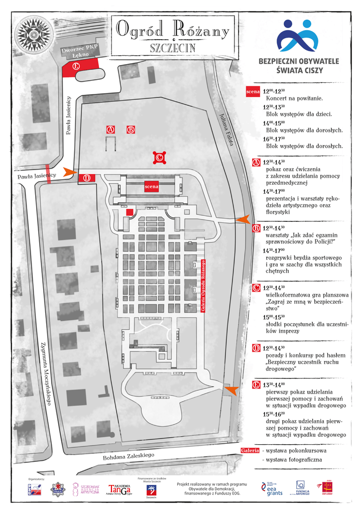 Ogród Różany SZCZECIN c PKP Dworze Łękno E A Koncert na powitanie. 1230-1330 Blok występów dla dzieci. 1400-1500 Blok występów dla dorosłych. 1630-1730 Blok występów dla dorosłych. a alat na F Julia Pawła Jasienicy scena 1200-1230 B C Pawła Jasienicy A 1230-1430 pokaz oraz ćwiczenia z zakresu udzielania pomocy przedmedycznej 1430-1700 prezentacja i warsztaty rękodzieła artystycznego oraz florystyki D scena B 1230-1430 Galeria Ogrodu Różanego warsztaty „Jak zdać egzamin sprawnościowy do Policji?” 1430-1700 rozgrywki brydża sportowego i gra w szachy dla wszystkich chętnych C 1230-1430 wielkoformatowa gra planszowa „Zagraj ze mną w bezpieczeństwo” 1500-1530 słodki poczęstunek dla uczestników imprezy Zygmunta D 1230-1430 iego Moczyńsk porady i konkursy pod hasłem „Bezpieczny uczestnik ruchu drogowego” E 1330-1400 pierwszy pokaz udzielania pierwszej pomocy i zachowań w sytuacji wypadku drogowego 1530-1620 drugi pokaz udzielania pierwszej pomocy i zachowań w sytuacji wypadku drogowego iego Bohdana Zalesk Organizatorzy: Finansowane ze środków Miasta Szczecin Galeria - wystawa pokonkursowa - wystawa fotograficzna Projekt realizowany w ramach programu Obywatele dla Demokracji, finansowanego z Funduszy EOG.