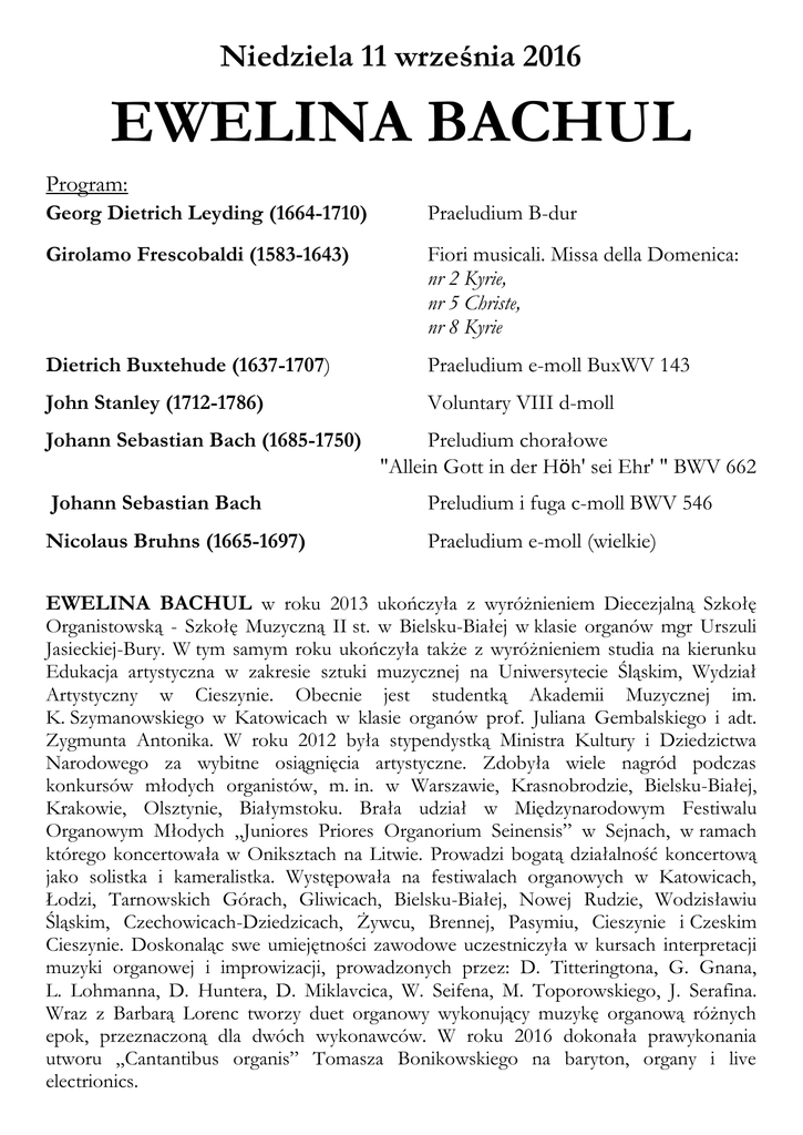 Niedziela 11 września 2016 EWELINA BACHUL Program: Georg Dietrich Leyding (1664-1710) Praeludium B-dur Girolamo Frescobaldi (1583-1643) Fiori musicali. Missa della Domenica: nr 2 Kyrie, nr 5 Christe, nr 8 Kyrie Dietrich Buxtehude (1637-1707) Praeludium e-moll BuxWV 143 John Stanley (1712-1786) Voluntary VIII d-moll Johann Sebastian Bach (1685-1750) Preludium chorałowe "Allein Gott in der Hӧh' sei Ehr' " BWV 662 Johann Sebastian Bach Preludium i fuga c-moll BWV 546 Nicolaus Bruhns (1665-1697) Praeludium e-moll (wielkie) EWELINA BACHUL w roku 2013 ukończyła z wyróżnieniem Diecezjalną Szkołę Organistowską - Szkołę Muzyczną II st. w Bielsku-Białej w klasie organów mgr Urszuli Jasieckiej-Bury. W tym samym roku ukończyła także z wyróżnieniem studia na kierunku Edukacja artystyczna w zakresie sztuki muzycznej na Uniwersytecie Śląskim, Wydział Artystyczny w Cieszynie. Obecnie jest studentką Akademii Muzycznej im. K. Szymanowskiego w Katowicach w klasie organów prof. Juliana Gembalskiego i adt. Zygmunta Antonika. W roku 2012 była stypendystką Ministra Kultury i Dziedzictwa Narodowego za wybitne osiągnięcia artystyczne. Zdobyła wiele nagród podczas konkursów młodych organistów, m. in. w Warszawie, Krasnobrodzie, Bielsku-Białej, Krakowie, Olsztynie, Białymstoku. Brała udział w Międzynarodowym Festiwalu Organowym Młodych „Juniores Priores Organorium Seinensis” w Sejnach, w ramach którego koncertowała w Oniksztach na Litwie. Prowadzi bogatą działalność koncertową jako solistka i kameralistka. Występowała na festiwalach organowych w Katowicach, Łodzi, Tarnowskich Górach, Gliwicach, Bielsku-Białej, Nowej Rudzie, Wodzisławiu Śląskim, Czechowicach-Dziedzicach, Żywcu, Brennej, Pasymiu, Cieszynie i Czeskim Cieszynie. Doskonaląc swe umiejętności zawodowe uczestniczyła w kursach interpretacji muzyki organowej i improwizacji, prowadzonych przez: D. Titteringtona, G. Gnana, L. Lohmanna, D. Huntera, D. Miklavcica, W. Seifena, M. Toporowskiego, J. Serafina. Wraz z Barbarą Lorenc tworzy duet organowy wykonujący muzykę organową różnych epok, przeznaczoną dla dwóch wykonawców. W roku 2016 dokonała prawykonania utworu „Cantantibus organis” Tomasza Bonikowskiego na baryton, organy i live electrionics.