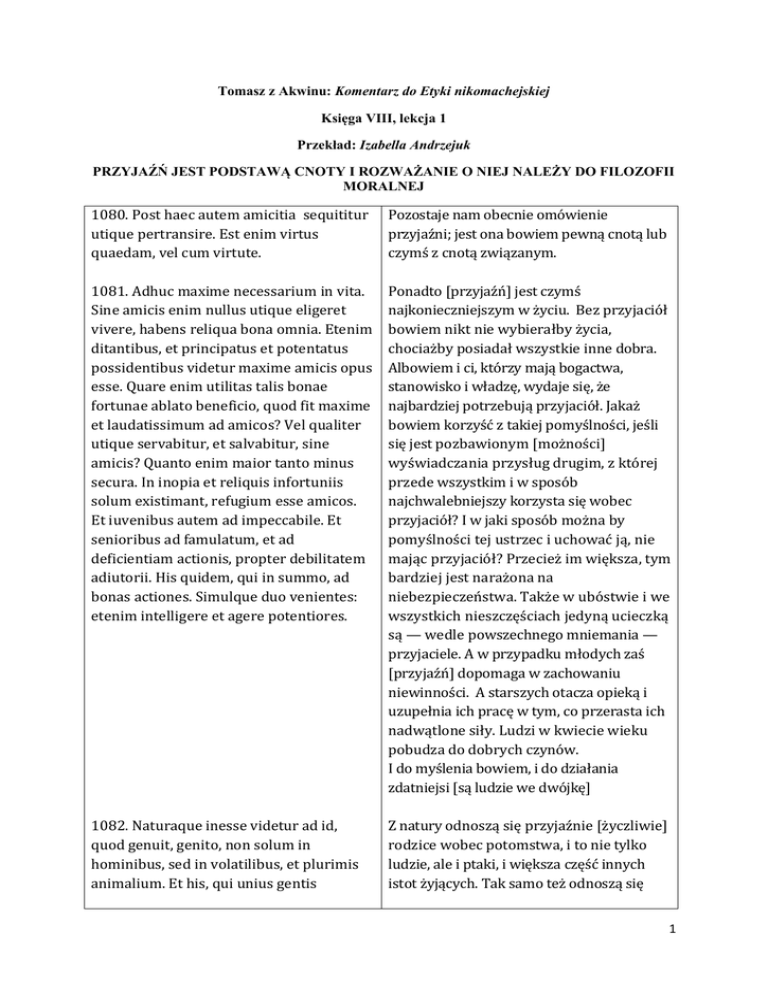 Tomasz z Akwinu: Komentarz do Etyki nikomachejskiej Księga VIII, lekcja 1 Przekład: Izabella Andrzejuk PRZYJAŹŃ JEST PODSTAWĄ CNOTY I ROZWAŻANIE O NIEJ NALEŻY DO FILOZOFII MORALNEJ 1080. Post haec autem amicitia sequititur utique pertransire. Est enim virtus quaedam, vel cum virtute. Pozostaje nam obecnie omówienie przyjaźni; jest ona bowiem pewną cnotą lub czymś z cnotą związanym. 1081. Adhuc maxime necessarium in vita. Sine amicis enim nullus utique eligeret vivere, habens reliqua bona omnia. Etenim ditantibus, et principatus et potentatus possidentibus videtur maxime amicis opus esse. Quare enim utilitas talis bonae fortunae ablato beneficio, quod fit maxime et laudatissimum ad amicos? Vel qualiter utique servabitur, et salvabitur, sine amicis? Quanto enim maior tanto minus secura. In inopia et reliquis infortuniis solum existimant, refugium esse amicos. Et iuvenibus autem ad impeccabile. Et senioribus ad famulatum, et ad deficientiam actionis, propter debilitatem adiutorii. His quidem, qui in summo, ad bonas actiones. Simulque duo venientes: etenim intelligere et agere potentiores. Ponadto [przyjaźń] jest czymś najkonieczniejszym w życiu. Bez przyjaciół bowiem nikt nie wybierałby życia, chociażby posiadał wszystkie inne dobra. Albowiem i ci, którzy mają bogactwa, stanowisko i władzę, wydaje się, że najbardziej potrzebują przyjaciół. Jakaż bowiem korzyść z takiej pomyślności, jeśli się jest pozbawionym [możności] wyświadczania przysług drugim, z której przede wszystkim i w sposób najchwalebniejszy korzysta się wobec przyjaciół? I w jaki sposób można by pomyślności tej ustrzec i uchować ją, nie mając przyjaciół? Przecież im większa, tym bardziej jest narażona na niebezpieczeństwa. Także w ubóstwie i we wszystkich nieszczęściach jedyną ucieczką są — wedle powszechnego mniemania — przyjaciele. A w przypadku młodych zaś [przyjaźń] dopomaga w zachowaniu niewinności. A starszych otacza opieką i uzupełnia ich pracę w tym, co przerasta ich nadwątlone siły. Ludzi w kwiecie wieku pobudza do dobrych czynów. I do myślenia bowiem, i do działania zdatniejsi [są ludzie we dwójkę] 1082. Naturaque inesse videtur ad id, quod genuit, genito, non solum in hominibus, sed in volatilibus, et plurimis animalium. Et his, qui unius gentis Z natury odnoszą się przyjaźnie [życzliwie] rodzice wobec potomstwa, i to nie tylko ludzie, ale i ptaki, i większa część innych istot żyjących. Tak samo też odnoszą się 1 adinvicem, et maxime hominibus. Unde et philanthropos laudamus. Videbit autem utique aliquis, et in erroribus, ut familiare omnis homo omni homini et amicum. wobec siebie osobniki tego samego gatunku, a przede wszystkim ludzie [między sobą]. Stąd chwalimy tych, co są przyjaciółmi swych bliźnich. Ktokolwiek zwróci z pewnością uwagę na błędy [innych] tak, jakby był spokrewniony z każdym człowiekiem i dla każdego był przyjacielem. 1083. Videtur autem civitates continere amicitia. Et legis positores magis circa ipsam student, quam iustitiam. Concordia enim simile aliquid amicitiae videtur esse; hanc autem maxime appetunt et contentionem inimieam existentem expellunt. Wydaje się też, że istotą więzów łączących państwa jest przyjaźń. Także i prawodawcy bardziej się o nią troszczą niż o sprawiedliwość. Zgoda bowiem zdaje się być podobną do przyjaźni, a o zgodę najbardziej zabiegają [prawodawcy], pragnąc ile możności usunąć spory i kłótnie, które są objawem wrogości. I ludziom, którzy żyją w przyjaźni, nie trzeba wcale sprawiedliwości. Ludzie natomiast, którzy są sprawiedliwi, potrzebują przyjaźni. I wydaje się, że sprawiedliwi są najbardziej wobec siebie przyjaźni. [Przyjaźń] jest jednak nie tylko czymś koniecznym, ale też czymś dobrym. Chwalimy bowiem tych, co skłonni są do zawierania przyjaźni. A i wydaje się, że posiadanie wielkiej ilości przyjaciół jest czymś dobrym. Wszak są tacy nawet, którzy sądzą, że ludzie dobrzy to tyle, co przyjaciele. Niemało jest sporów, które toczą się dokoła przyjaźni. Niektórzy bowiem uważają ją za rodzaj podobieństwa, a tych, co do siebie podobni — za przyjaciół. Stąd powiedzenia takie, jak: „swój do swego" lub „kawka do kawki", i inne tego typu [przysłowia]. Inni [mówią] przeciwnie, że wszyscy tacy ludzie odnoszą się do sobie na zasadzie przeciwności. 1084. Et amicis quidem existentibus nihil opus est iustitia. Iusti autem existentes indigent amicitia. Et iustorum quidem maxime amicabile esse videtur. 1085. Non solum autem necessarium est, sed et bonum. Philophilos enim laudamus. Philiaque videtur aliquid bonorum esse. Et quidam eosdem exstimant viros bonos esse et amicos. (C. II) 1086. Dubitantur autem de ipsa non pauca. Hi quidem enim quamdam similitudinem ponunt ipsam, et similes amicos. Unde simile aiunt ad simile, et coloium ad coloium, et quaecumque talia. Hi autem e contra contrarietatem singulos omnes tales adinvicem aiunt esse. 1087. Et de his ipsis superius quaerunt, et naturalius. Euripides quidem dicens desiderare quidem pluviam terram Sprawy te są też przedmiotem głębszych i bardziej przyrodniczych rozważań. Eurypides na przykład mówi, że wyschnięta 2 siccatam. Desiderare autem venerabile caelum impletum pluvia cadere in terram. Et Heraclitus contrarium conferens, et ex differentibus optimam harmoniam, et omnia secundum litem fieri. E contrario autem his alii, et Empedocles. Simile enim, simile appetit 1088. Naturalia quidem igitur quaestionum relinquuntur. Non enim propria praesentis intentionis. Quaecumque autem sunt humana et convenientia ad mores et passiones hic intendamus. Puta utrum in omnibus sit amicitia, vel num possibile malos existentes amicos esse. Et utrum una species amicitiae est, vel plures ziemia miłuje deszcz, a wyniosły nieboskłon, nabrzmiały deszczem, zniża się miłośnie ku ziemi. A Heraklit — że pożyteczne jest pr
