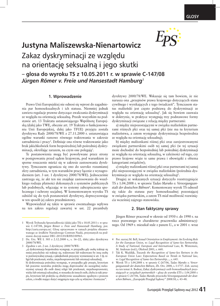 GLOSY Justyna Maliszewska-Nienartowicz Zakaz dyskryminacji ze względu na orientację seksualną i jego skutki – glosa do wyroku TS z 10.05.2011 r. w sprawie C-147/08 Jürgen Römer v. Freie und Hansestadt Hamburg1 1. Wprowadzenie Prawo Unii Europejskiej nie odnosi się wprost do zagadnienia par homoseksualnych i ich statusu. Niemniej jednak zawiera regulacje prawne dotyczące zwalczania dyskryminacji ze względu na orientację seksualną. Przede wszystkim na podstawie art. 13 Traktatu ustanawiającego Wspólnotę Europejską (dalej jako TWE, obecnie art. 19 Traktatu o funkcjonowaniu Unii Europejskiej, dalej jako TFUE) przyjęta została dyrektywa Rady 2000/78/WE z 27.11.2000 r. ustanawiająca ogólne warunki ramowe równego traktowania w zakresie zatrudnienia i pracy2. Definiuje ona równe traktowanie jako brak jakichkolwiek form bezpośredniej lub pośredniej dyskryminacji, określając zarazem, na czym one polegają3. Te postanowienia mogą być powoływane przez strony w postępowaniu przed sądem krajowym, pod warunkiem że sporne roszczenie mieści się w zakresie zastosowania dyrektywy. Tymczasem ogranicza się ono do szeroko rozumianej sfery zatrudnienia, w tym warunków pracy łącznie z wynagrodzeniem (art. 3 ust. 1 dyrektywy 2000/78/WE). Jednocześnie zastrzega się, że akt ten nie znajduje zastosowania do wszelkiego rodzaju płatności dokonanych z systemów publicznych lub podobnych, włączając w to systemy zabezpieczenia społecznego i ochrony socjalnej. W komentowanym wyroku TS odniósł się do tych postanowień dyrektywy, doprecyzowując w ten sposób jej zakres przedmiotowy. Wypowiedział się także w sprawie ewentualnego wpływu na ten zakres regulacji zawartej w ust. 22 preambuły 1 Wyrok Trybunału Sprawiedliwości (dalej jako TS) z 10.05.2011 r. w sprawie C-147/08, Jürgen Römer v. Freie und Hansestadt Hamburg, por. http://curia.europa.eu/. Glosę opracowano w ramach projektu sfinansowanego ze środków Narodowego Centrum Nauki, przyznanych na podstawie decyzji numer DEC-2011/01/B/HS5/00965. 2 Dz. Urz. WE L 303 z 2.12.2000 r., s. 16–22, dalej jako dyrektywa 2000/78/WE. 3 Zgodnie z art. 2 ust. 2 dyrektywy 2000/78/WE: „a) dyskryminacja bezpośrednia występuje, w przypadku gdy osobę traktuje się mniej przychylnie niż traktuje się, traktowano lub traktowano by inną osobę w porównywalnej sytuacji, z jakiejkolwiek przyczyny wymienionej w art. 1 (tj. religii lub przekonań, wieku, niepełnosprawności lub orientacji seksualnej), b) dyskryminacja pośrednia występuje, w przypadku gdy przepis, kryterium lub pozornie neutralna praktyka mogą doprowadzić do szczególnej niekorzystnej sytuacji dla osób danej religii lub przekonań, niepełnosprawności, wieku lub orientacji seksualnej, w stosunku do innych osób, chyba że taki przepis, kryterium lub praktyka są obiektywnie uzasadnione zgodnym z prawem celem, a środki mające służyć osiągnięciu tego celu są właściwe i konieczne”. dyrektywy 2000/78/WE. Wskazuje się tam bowiem, że nie narusza ona „przepisów prawa krajowego dotyczących stanu cywilnego i wynikających z tego świadczeń”. Tymczasem status małżeński jest często podstawą do dyskryminacji ze względu na orientację seksualną4. Jak się bowiem zauważa w doktrynie, w praktyce występują trzy podstawowe formy dyskryminacji związane z relacją między partnerami: a) między niepozostającymi w związku małżeńskim partnerami różnych płci oraz tej samej płci (nie ma tu kryterium małżeństwa, a zatem występuje dyskryminacja bezpośrednia ze względu na orientację seksualną); b) między małżonkami różnej płci oraz zarejestrowanymi związkami partnerskimi osób tej samej płci (w tej sytuacji może dochodzić do bezpośredniej lub pośredniej dyskryminacji ze względu na orientację seksualną, w zależności od tego, czy prawo krajowe wiąże te same prawa i obowiązki z obiema kategoriami związków); c) między małżonkami różnej płci oraz partnerami tej samej płci niepozostającymi w związku małżeńskim (pośrednia dyskryminacja ze względu na orientację seksualną)5. Drugiej ze wskazanych sytuacji dotyczyło rozstrzygnięcie TS z 1.04.2008 r. w sprawie Tadao Maruko v. Versorgungsanstalt der deutschen Bühnen6. Komentowany wyrok TS odnosił się także do statusu pary homoseksualnej pozostającej w związku partnerskim, a zatem TS miał możliwość rozwinięcia wcześniej zajętego stanowiska. 2. Stan faktyczny sprawy Jürgen Römer pracował w okresie od 1950 r. do 1990 r. na rzecz pozwanego w charakterze pracownika administracyjnego. Od 1969 r. mieszkał stale z panem U., a w 2001 r. wraz 4 Por. szerzej M. Bell, Sexual Orientation in Employment: An Evolving Role for the European Union, w: Legal Recognition of Same-Sex Partnership. A Study of National, European and International Law, R. Wintemute, M. Andenæs (red.), Oksford 2001, s. 660. 5 Tak K. Waaldijk, Towards the Recognition of Same-Sex Partners in the European Union Law: Expectations Based on Trends in National law, w: Legal Recognition of Same-Sex Partnership…, s. 645. 6 Wyrok TS z 1.04.2008 r. w sprawie C-267/06, Tadao Maruko v. Versorgungsanstalt der deutschen Bühnen, Zb. Orz. 2008, s. I-1757. Zob. szerzej na ten temat A. Bodnar, Zakaz dyskryminacji osób homoseksualnych pozostających w związkach partnerskich – glosa do wyroku ETS z 1.04.2008 r. w sprawie C-267/06, Tadao Maruko przeciwko Versorgungsanstalt der deutschen Bühnen, „Europejski Przegląd Sądowy” 2008/10, s. 43–48. Europejski Przegląd Sądowy maj 2012 41 GLOSY z partnerem zawarł, zgodnie z przepisami niemieckimi, zarejestrowany związek partnerski. Jürgen Römer poinformował o tym swojego pracodawcę w październiku 2001 r., a miesiąc później zażądał przeliczenia wypłacanej mu emerytury uzupełniającej poprzez zastosowanie korzystniejszego potrącenia z wynagrodzenia przewidzianego w przypadku III/0 klasy podatkowej ze skutkiem od 1.11.2001 r. (daw
