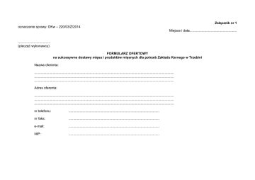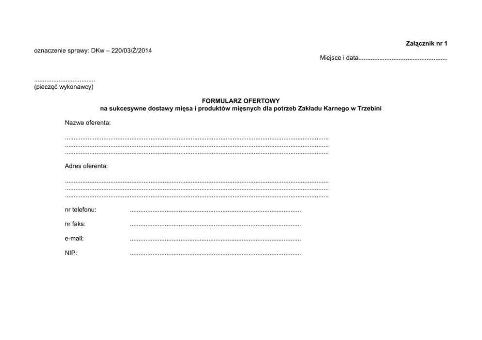 Załącznik nr 1 oznaczenie sprawy: DKw – 220/03/Ż/2014 Miejsce i data................................................... ................................... (pieczęć wykonawcy) FORMULARZ OFERTOWY na sukcesywne dostawy mięsa i produktów mięsnych dla potrzeb Zakładu Karnego w Trzebini Nazwa oferenta: ....................................................................................................................................................... ....................................................................................................................................................... ....................................................................................................................................................... Adres oferenta: ....................................................................................................................................................... ....................................................................................................................................................... ....................................................................................................................................................... nr telefonu: .................................................................................................. nr faks: .................................................................................................. e-mail: .................................................................................................. NIP: .................................................................................................. Informacja o podwykonawcach Zgodnie z żądaniem zamawiającego informuję, że: - Zamówienie zostanie zrealizowane w całości bez udziału podwykonawców.** - Następująca część zamówienia zostanie powierzona podwykonawcom:** ............................................................................................................................................................................................................................................ ** niepotrzebne skreślić pod rygorem odrzucenia oferty Uwaga!!! Ofertę należy złożyć na całość przedmiotu zamówienia, zamawiający nie dopuszcza składania ofert częściowych. Przedmiot zamówienia Ilość Cena brutto za 1 kg Wartość brutto 1 2 3 4 boczek wędzony 730 kg podgardle wędzone 730 kg kości wędzone 730 kg porcje drobiowe rosołowe 730 kg pasztet cielęcy 170 kg parówki cielęce 170 kg polędwica drobiowa 170 kg szynka drobiowa 170 kg baleron drobiowy 170 kg kiełbasa drobiowa 170 kg kabanos drobiowy 170 kg parówki wieprzowe cienkie 790 kg parówki drobiowe cienkie 790 kg pasztetowa wieprzowa 790 kg pasztetowa drobiowa 790 kg salceson wieprzowy włoski 790 kg salceson wieprzowy brunszwicki 790 kg mielonka wieprzowa 790 kg mielonka drobiowa 790 kg kiełbasa wieprzowa mortadela 790 kg kiełbasa wieprzowa zwyczajna 790 kg kiełbasa wieprzowa kanapkowa 790 kg kiełbasa wieprzowa lunszmit 790 kg kiełbasa wieprzowa regionalna 790 kg kiełbasa wieprzowa węgierska 790 kg mięso drobiowe gulaszowe 730 kg mięso wieprzowe gulaszowe 730 kg mięso mielone drobiowe 730 kg mięso mielone wieprzowe 730 kg schab wieprzowy z kością 730 kg schab wieprzowy bez kości 730 kg łopatka wieprzowa z kością 730 kg łopatka wieprzowa bez kości 730 kg karczek wieprzowy z kością 730 kg karczek wieprzowy bez kości 730 kg mięso wieprzowe od szynki z kością 730 kg mięso wieprzowe od szynki bez kości 730 kg kaszanka wieprzowa 730 kg wątroba wieprzowa 730 kg ćwiartka tylna świeża z kurczaka 730 kg filet z piersi kurczaka świeży 730 kg wątróbka drobiowa 730 kg żołądki drobiowe 730 kg serduszka drobiowe 730 kg flaki wołowe gotowane 730 kg Cena oferty: .............................................. (podpis wykonawcy lub osoby upoważnionej do reprezentowania wykonawcy)