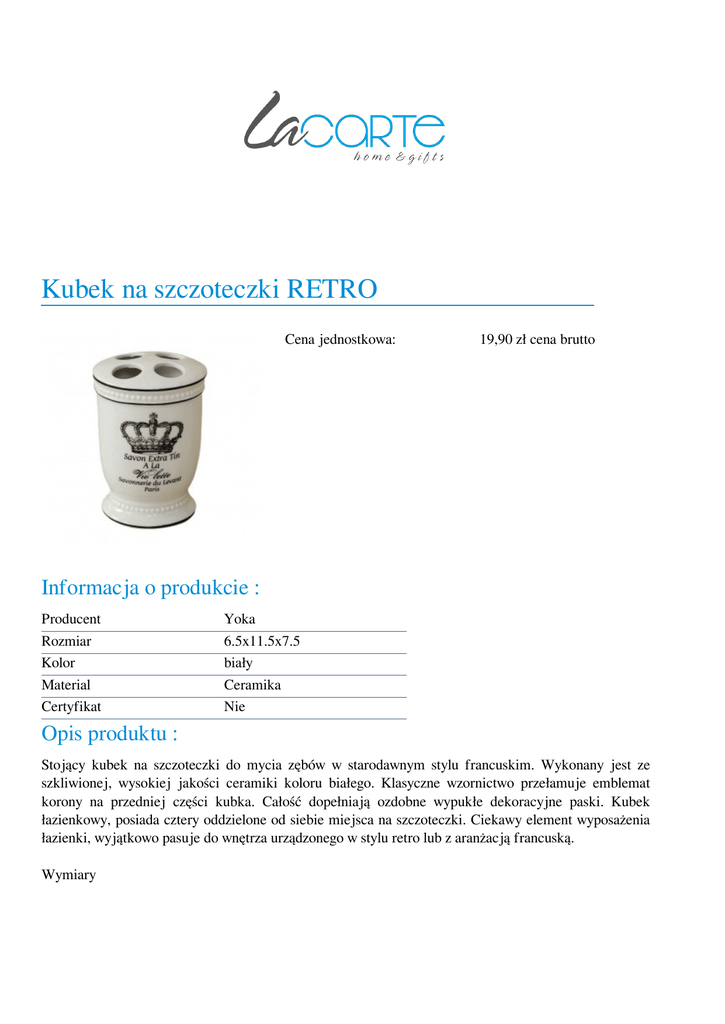 Kubek na szczoteczki RETRO Cena jednostkowa: 19,90 zł cena brutto Informacja o produkcie : Producent Rozmiar Kolor Material Certyfikat Yoka 6.5x11.5x7.5 biały Ceramika Nie Opis produktu : Stojący kubek na szczoteczki do mycia zębów w starodawnym stylu francuskim. Wykonany jest ze szkliwionej, wysokiej jakości ceramiki koloru białego. Klasyczne wzornictwo przełamuje emblemat korony na przedniej części kubka. Całość dopełniają ozdobne wypukłe dekoracyjne paski. Kubek łazienkowy, posiada cztery oddzielone od siebie miejsca na szczoteczki. Ciekawy element wyposażenia łazienki, wyjątkowo pasuje do wnętrza urządzonego w stylu retro lub z aranżacją francuską. Wymiary Długość:6.5 cm Szerokość:7.5 cm Wysokość:11.5 cm Powered by TCPDF (www.tcpdf.org)