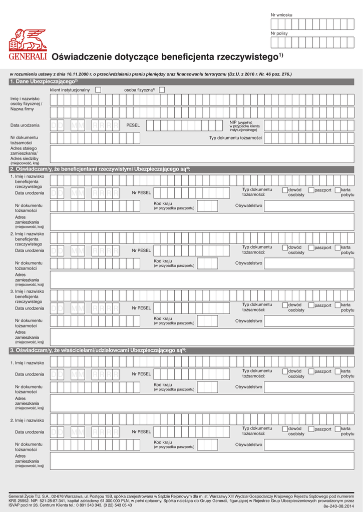 Nr wniosku Nr polisy OÊwiadczenie dotyczàce beneficjenta rzeczywistego1) w rozumieniu ustawy z dnia 16.11.2000 r. o przeciwdziałaniu praniu pieni´dzy oraz finansowaniu terroryzmu (Dz.U. z 2010 r. Nr. 46 poz. 276.) 1. Dane Ubezpieczajàcego2) klient instytucjonalny osoba fizyczna3) Imi´ i nazwisko osoby fizycznej / Nazwa firmy Data urodzenia DD MM RRRR NIP (wypełniç w przypadku klienta instytucjonalnego) PESEL Nr dokumentu to˝samoÊci Adres stałego zamieszkania/ Adres siedziby Typ dokumentu to˝samoÊci (miejscowoÊç, kraj) 2. OÊwiadczam/y, ˝e beneficjentami rzeczywistymi Ubezpieczajàcego sà4): 1. Imi´ i nazwisko beneficjenta rzeczywistego Data urodzenia DD MM RRRR Typ dokumentu to˝samoÊci: Nr PESEL Kod kraju Nr dokumentu to˝samoÊci (w przypadku paszportu) dowód osobisty paszport karta pobytu dowód osobisty paszport karta pobytu dowód osobisty paszport karta pobytu dowód osobisty paszport karta pobytu dowód osobisty paszport karta pobytu Obywatelstwo Adres zamieszkania (miejscowoÊç, kraj) 2. Imi´ i nazwisko beneficjenta rzeczywistego Data urodzenia DD MM RRRR Typ dokumentu to˝samoÊci: Nr PESEL Kod kraju Nr dokumentu to˝samoÊci (w przypadku paszportu) Obywatelstwo Adres zamieszkania (miejscowoÊç, kraj) 3. Imi´ i nazwisko beneficjenta rzeczywistego Data urodzenia DD MM RRRR Typ dokumentu to˝samoÊci: Nr PESEL Kod kraju Nr dokumentu to˝samoÊci (w przypadku paszportu) Obywatelstwo Adres zamieszkania (miejscowoÊç, kraj) 3. OÊwiadczam/y, ˝e właÊcicielami/udziałowcami Ubezpieczajàcego sà5): 1. Imi´ i nazwisko Data urodzenia DD MM RRRR Typ dokumentu to˝samoÊci: Nr PESEL Kod kraju Nr dokumentu to˝samoÊci (w przypadku paszportu) Obywatelstwo Adres zamieszkania (miejscowoÊç, kraj) 2. Imi´ i nazwisko Data urodzenia Nr dokumentu to˝samoÊci DD MM RRRR Typ dokumentu to˝samoÊci: Nr PESEL Kod kraju (w przypadku paszportu) Obywatelstwo Adres zamieszkania (miejscowoÊç, kraj) Generali ˚ycie T.U. S.A., 02-676 Warszawa, ul. Post´pu 15B, spółka zarejestrowana w Sàdzie Rejonowym dla m. st. Warszawy XIII Wydział Gospodarczy Krajowego Rejestru Sàdowego pod numerem KRS 25952. NIP: 521-28-87-341, kapitał zakładowy 61.000.000 PLN, w pełni opłacony. Spółka nale˝àca do Grupy Generali, figurujàcej w Rejestrze Grup Ubezpieczeniowych prowadzonym przez ISVAP pod nr 26. Centrum Klienta tel.: 0 801 343 343, (0 22) 543 05 43 8e-240-08.2014 3. Imi´ i nazwisko Data urodzenia DD MM RRRR Typ dokumentu to˝samoÊci: Nr PESEL Kod kraju Nr dokumentu to˝samoÊci (w przypadku paszportu) dowód osobisty paszport karta pobytu Obywatelstwo Adres zamieszkania (miejscowoÊç, kraj) 4. Nazwa osoby prawnej KRS REGON NIP REGON NIP REGON NIP Siedziba spółki (miejscowoÊç, kraj) 5. Nazwa osoby prawnej KRS Siedziba spółki (miejscowoÊç, kraj) 6. Nazwa osoby prawnej KRS Siedziba spółki (miejscowoÊç, kraj) 4. OÊwiadczam, ˝e poinformowałem Beneficjenta Rzeczywistego o przekazaniu jego danych osobowych Generali ˚ycie T.U. S.A. z siedzibà w Warszawie, ul. Post´pu 15 B, w celu identyfikacji, a tak˝e poinformowałem Beneficjenta Rzeczywistego o przysługujàcym mu prawie dost´pu do tych danych i prawie do ich poprawiania. MiejscowoÊç dnia Podpisy przedstawicieli Ubezpieczajàcego Beneficjent rzeczywisty to: a) osoba fizyczna lub osoby fizyczne, które sà właÊcicielami osoby prawnej lub sprawujà kontrol´ nad klientem albo majà wpływ na osob´ fizycznà, w imieniu której przeprowadzana jest transakcja lub prowadzona jest działalnoÊç, b) osoba fizyczna lub osoby fizyczne, które sà udziałowcami lub akcjonariuszami lub posiadajà prawo głosu na zgromadzeniu wspólników w wysokoÊci powy˝ej 25% w tej osobie prawnej, w tym za pomocà pakietów akcji na okaziciela, z wyjàtkiem spółek, których papiery wartoÊciowe sà w obrocie zorganizowanym, podlegajàcych lub stosujàcych przepisy prawa Unii Europejskiej w zakresie ujawniania informacji, a tak˝e podmiotów Êwiadczàcych usługi finansowe na terytorium paƒstwa członkowskiego Unii Europejskiej albo paƒstwa równowa˝nego - w przypadku osób prawnych, c) osoba fizyczna lub osoby fizyczne, które sprawujà kontrol´ nad co najmniej 25% majàtku - w przypadku podmiotów, którym powierzono administrowanie wartoÊciami majàtkowymi oraz rozdzielanie takich wartoÊci, z wyjàtkiem podmiotów wykonujàcych czynnoÊci, o których mowa w art. 69 ust. 2 pkt 4 ustawy z dnia 29 lipca 2005 r. o obrocie instrumentami finansowymi (czynnoÊci polegajàce na zarzàdzaniu portfelami, w skład których wchodzi jeden lub wi´ksza liczba instrumentów finansowych), 2) prosz´ zaznaczyç kogo dotyczy formularz, 3) w przypadku Ubezpieczajàcego - osoby fizycznej - formularz nale˝y wype∏niç w przypadkach, kiedy z okolicznoÊci wynika, ˝e osoba ta jest kontrolowana przez innà osob´ fizycznà np. w przypadku klienta niepe∏noletniego/ubezw∏asnowolnionego, 4) OÊwiadczenie ma na celu ustalenie to˝samoÊci beneficjenta rzeczywistego, 5) OÊwiadczenie ma na celu ustalenie struktury własnoÊci osoby prawnej (prosz´ wypełniç w przypadku klienta instytucjonalnego). 1) UWAGA! Składanie oÊwiadczeƒ, o których mowa w polu nr 2 i nr 3 nie jest konieczne o ile dotyczy: a) spółek, których papiery wartoÊciowe sà w obrocie zorganizowanym, podlegajàcych lub stosujàcych przepisy prawa Unii Europejskiej w zakresie ujawniania informacji, b) podmiotów Êwiadczàcych usługi finansowe na terytorium paƒstwa członkowskiego Unii Europejskiej. 5. D ane dotyczàce przedstawiciela ustawowego osoby niepełnoletniej (wypełniç tylko w przypadku, gdy dane przedstawiciela ustawowego sà inne ni˝ dane beneficjenta rzeczywistego wskazanego powy˝ej) Imi´ i nazwisko przedstawiciela ustawowego Data urodzenia DD MM RRRR Typ dokumentu to˝samoÊci PESEL Kod kraju Nr dokumentu to˝samoÊci (w przypadku paszportu) Obywatelstwo Adres stałego zamieszkania Ulica, nr domu, nr mieszkania Poczta Kod pocztowy MiejscowoÊç Kr