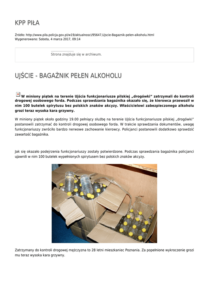 KPP PIŁA Źródło: http://www.pila.policja.gov.pl/w19/aktualnosci/95647,Ujscie-Bagaznik-pelen-alkoholu.html Wygenerowano: Sobota, 4 marca 2017, 09:14 Strona znajduje się w archiwum. UJŚCIE - BAGAŻNIK PEŁEN ALKOHOLU W miniony piątek na terenie Ujścia funkcjonariusze pilskiej „drogówki” zatrzymali do kontroli drogowej osobowego forda. Podczas sprawdzania bagażnika okazało się, że kierowca przewoził w nim 100 butelek spirytusu bez polskich znaków akcyzy. Właścicielowi zabezpieczonego alkoholu grozi teraz wysoka kara grzywny. W miniony piątek około godziny 19.00 pełniący służbę na terenie Ujścia funkcjonariusze pilskiej „drogówki” postanowili zatrzymać do kontroli drogowej osobowego forda. W trakcie sprawdzania dokumentów, uwagę funkcjonariuszy zwróciło bardzo nerwowe zachowanie kierowcy. Policjanci postanowili dodatkowo sprawdzić zawartość bagażnika. Jak się okazało podejrzenia funkcjonariuszy zostały potwierdzone. Podczas sprawdzania bagażnika policjanci ujawnili w nim 100 butelek wypełnionych spirytusem bez polskich znaków akcyzy. Zatrzymany do kontroli drogowej mężczyzna to 28 letni mieszkaniec Poznania. Za popełnione wykroczenie grozi mu teraz wysoka kara grzywny. Ocena: 0/5 (0) Tweetnij