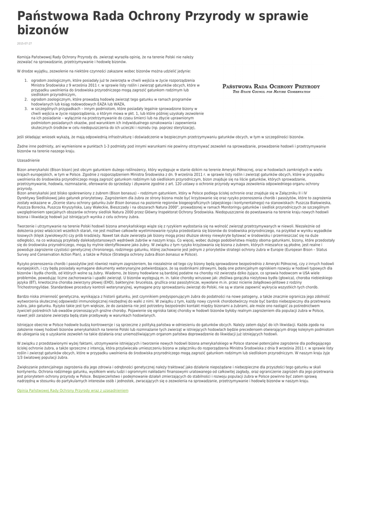Państwowa Rada Ochrony Przyrody w sprawie bizonów 2015-07-27 Komisja Państwowej Rady Ochrony Przyrody ds. zwierząt wyraziła opinię, że na terenie Polski nie należy zezwalać na sprowadzanie, przetrzymywanie i hodowlę bizonów. W drodze wyjątku, zezwolenie na niektóre czynności zakazane wobec bizonów można udzielić jedynie: 1. ogrodom zoologicznym, które posiadały już te zwierzęta w chwili wejścia w życie rozporządzenia Ministra Środowiska z 9 września 2011 r. w sprawie listy roślin i zwierząt gatunków obcych, które w przypadku uwolnienia do środowiska przyrodniczego mogą zagrozić gatunkom rodzimym lub siedliskom przyrodniczym, 2. ogrodom zoologicznym, które prowadzą hodowlę zwierząt tego gatunku w ramach programów hodowlanych lub ksiąg rodowodowych EAZA lub WAZA, 3. w szczególnych przypadkach – innym podmiotom, które posiadały legalnie sprowadzone bizony w chwili wejścia w życie rozporządzenia, o którym mowa w pkt. 1, lub które później uzyskały zezwolenie na ich posiadanie – wyłącznie na przetrzymywanie do czasu śmierci lub na zbycie uprawnionym podmiotom posiadanych okazów, pod warunkiem ich indywidualnego oznakowania i zapewnienia skutecznych środków w celu niedopuszczenia do ich ucieczki i rozrodu (np. poprzez sterylizację), jeśli składając wniosek wykażą, że mają odpowiednią infrastrukturę i doświadczenie w bezpiecznym przetrzymywaniu gatunków obcych, w tym w szczególności bizonów. Żadne inne podmioty, ani wymienione w punktach 1-3 podmioty pod innymi warunkami nie powinny otrzymywać zezwoleń na sprowadzanie, prowadzenie hodowli i przetrzymywanie bizonów na terenie naszego kraju. Uzasadnienie Bizon amerykański (Bison bison) jest obcym gatunkiem dużego roślinożercy, który występuje w stanie dzikim na terenie Ameryki Północnej, oraz w hodowlach zamkniętych w wielu krajach europejskich, w tym w Polsce. Zgodnie z rozporządzeniem Ministra Środowiska z dn. 9 września 2011 r. w sprawie listy roślin i zwierząt gatunków obcych, które w przypadku uwolnienia do środowiska przyrodniczego mogą zagrozić gatunkom rodzimym lub siedliskom przyrodniczym, bizon znajduje się na liście gatunków, których sprowadzanie, przetrzymywanie, hodowla, rozmnażanie, oferowanie do sprzedaży i zbywanie zgodnie z art. 120 ustawy o ochronie przyrody wymaga zezwolenia odpowiedniego organu ochrony przyrody. Bizon amerykański jest blisko spokrewniony z żubrem (Bison bonasus) – rodzimym gatunkiem, który w Polsce podlega ścisłej ochronie oraz znajduje się w Załączniku II i IV Dyrektywy Siedliskowej jako gatunek priorytetowy. Zagrożeniem dla żubra ze strony bizona może być krzyżowanie się oraz ryzyko przenoszenia chorób i pasożytów, które to zagrożenia zostały wskazane w „Ocenie stanu ochrony gatunku żubr Bison bonasus na poziomie regionów biogeograficznych (alpejskiego i kontynentalnego) na stanowiskach: Puszcza Białowieska, Puszcza Borecka, Puszcza Knyszyńska, Lasy Wałeckie, Bieszczady i na obszarach Natura 2000”, prowadzonej w ramach Monitoringu gatunków i siedlisk przyrodniczych ze szczególnym uwzględnieniem specjalnych obszarów ochrony siedlisk Natura 2000 przez Główny Inspektorat Ochrony Środowiska. Niedopuszczenie do powstawania na terenie kraju nowych hodowli bizona i likwidację hodowli już istniejących wynika z celu ochrony żubra. Tworzenie i utrzymywanie na terenie Polski hodowli bizona amerykańskiego wiąże się z ryzykiem wydostania się na wolność zwierząt przetrzymywanych w niewoli. Niezależnie od dołożenia przez właścicieli wszelkich starań, nie jest możliwe całkowite wyeliminowanie ryzyka przedostania się bizonów do środowiska przyrodniczego, na przykład w wyniku wypadków losowych (klęsk żywiołowych) czy prób kradzieży. Nawet tak duże zwierzęta jak bizony mogą przez dłuższe okresy niewykryte bytować w środowisku i przemieszczać się na duże odległości, na co wskazują przykłady dalekodystansowych wędrówek żubrów w naszym kraju. Co więcej, wobec dużego podobieństwa między oboma gatunkami, bizony, które przedostały się do środowiska przyrodniczego, mogą by mylnie identyfikowane jako żubry. W związku z tym ryzyko krzyżowania się bizona z żubrem, których mieszańce są płodne, jest realne i powoduje zagrożenie czystości genetycznej chronionego, rodzimego gatunku, której zachowanie jest jednym z priorytetów strategii ochrony żubra w Europie (European Bison – Status Survey and Conservation Action Plan), a także w Polsce (Strategia ochrony żubra Bison bonasus w Polsce). Ryzyko przenoszenia chorób i pasożytów jest również realnym zagrożeniem, bo niezależnie od tego czy bizony będą sprowadzone bezpośrednio z Ameryki Północnej, czy z innych hodowli europejskich, i czy będą posiadały wymagane dokumenty weterynaryjne potwierdzające, że są osobnikami zdrowymi, będą one potencjalnym ogniskiem rozwoju w hodowli typowych dla bizonów i bydła chorób, od których wolne są żubry. Wiadomo, że bizony hodowlane są bardziej podatne na choroby niż zwierzęta dziko żyjące, co sprawia hodowcom w USA wiele problemów, powodując liczne zachorowania i upadki zwierząt. U bizonów występują m. in. takie choroby wirusowe jak: złośliwa gorączka nieżytowa bydła (głowica), choroba niebieskiego języka (BT), krwotoczna choroba zwierzyny płowej (EHD), bakteryjne: bruceloza, gruźlica oraz pasożytnicze, wywołane m.in. przez nicienie żołądkowo-jelitowe z rodziny Trichostrongylidae. Standardowe procedury kontroli weterynaryjnej, wymagane przy sprowadzaniu zwierząt do Polski, nie są w stanie zapewnić wykrycia wszystkich tych chorób. Bardzo niska zmienność genetyczna, wynikająca z historii gatunku, jest czynnikiem predysponującym żubra do podatności na nowe patogeny, a także znacznie ogranicza jego zdolność wytworzenia skutecznej odpowiedzi immunologicznej niezbędnej do walki z nimi. W zw