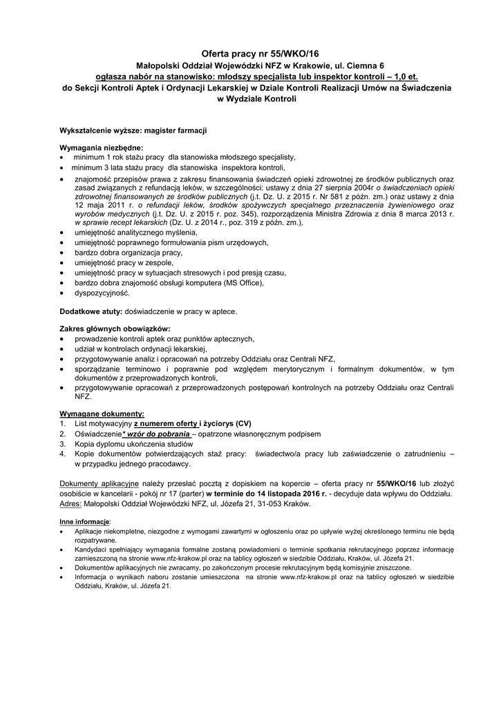 Oferta pracy nr 55/WKO/16 Małopolski Oddział Wojewódzki NFZ w Krakowie, ul. Ciemna 6 ogłasza nabór na stanowisko: młodszy specjalista lub inspektor kontroli – 1,0 et. do Sekcji Kontroli Aptek i Ordynacji Lekarskiej w Dziale Kontroli Realizacji Umów na Świadczenia w Wydziale Kontroli Wykształcenie wyższe: magister farmacji Wymagania niezbędne: minimum 1 rok stażu pracy dla stanowiska młodszego specjalisty, minimum 3 lata stażu pracy dla stanowiska inspektora kontroli, znajomość przepisów prawa z zakresu finansowania świadczeń opieki zdrowotnej ze środków publicznych oraz zasad związanych z refundacją leków, w szczególności: ustawy z dnia 27 sierpnia 2004r o świadczeniach opieki zdrowotnej finansowanych ze środków publicznych (j.t. Dz. U. z 2015 r. Nr 581 z późn. zm.) oraz ustawy z dnia 12 maja 2011 r. o refundacji leków, środków spożywczych specjalnego przeznaczenia żywieniowego oraz wyrobów medycznych (j.t. Dz. U. z 2015 r. poz. 345), rozporządzenia Ministra Zdrowia z dnia 8 marca 2013 r. w sprawie recept lekarskich (Dz. U. z 2014 r., poz. 319 z późn. zm.), umiejętność analitycznego myślenia, umiejętność poprawnego formułowania pism urzędowych, bardzo dobra organizacja pracy, umiejętność pracy w zespole, umiejętność pracy w sytuacjach stresowych i pod presją czasu, bardzo dobra znajomość obsługi komputera (MS Office), dyspozycyjność. Dodatkowe atuty: doświadczenie w pracy w aptece. Zakres głównych obowiązków: prowadzenie kontroli aptek oraz punktów aptecznych, udział w kontrolach ordynacji lekarskiej, przygotowywanie analiz i opracowań na potrzeby Oddziału oraz Centrali NFZ, sporządzanie terminowo i poprawnie pod względem merytorycznym i formalnym dokumentów, w tym dokumentów z przeprowadzonych kontroli, przygotowywanie opracowań z przeprowadzonych postępowań kontrolnych na potrzeby Oddziału oraz Centrali NFZ. Wymagane dokumenty: 1. List motywacyjny z numerem oferty i życiorys (CV) 2. Oświadczenie* wzór do pobrania – opatrzone własnoręcznym podpisem 3. Kopia dyplomu ukończenia studiów 4. Kopie dokumentów potwierdzających staż pracy: świadectwo/a pracy lub zaświadczenie o zatrudnieniu – w przypadku jednego pracodawcy. Dokumenty aplikacyjne należy przesłać pocztą z dopiskiem na kopercie – oferta pracy nr 55/WKO/16 lub złożyć osobiście w kancelarii - pokój nr 17 (parter) w terminie do 14 listopada 2016 r. - decyduje data wpływu do Oddziału. Adres: Małopolski Oddział Wojewódzki NFZ, ul. Józefa 21, 31-053 Kraków. Inne informacje: Aplikacje niekompletne, niezgodne z wymogami zawartymi w ogłoszeniu oraz po upływie wyżej określonego terminu nie będą rozpatrywane. Kandydaci spełniający wymagania formalne zostaną powiadomieni o terminie spotkania rekrutacyjnego poprzez informację zamieszczoną na stronie www.nfz-krakow.pl oraz na tablicy ogłoszeń w siedzibie Oddziału, Kraków, ul. Józefa 21. Dokumentów aplikacyjnych nie zwracamy, po zakończonym procesie rekrutacyjnym będą komisyjnie zniszczone. Informacja o wynikach naboru zostanie umieszczona na stronie www.nfz-krakow.pl oraz na tablicy ogłoszeń w siedzibie Oddziału, Kraków, ul. Józefa 21.