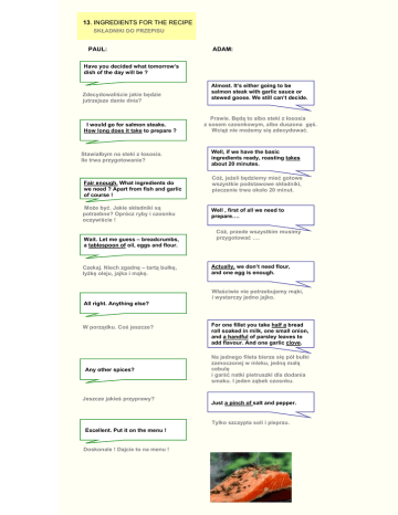 13. INGREDIENTS FOR THE RECIPE SKŁADNIKI DO PRZEPISU PAUL: ADAM: Have you decided what tomorrow’s dish of the day will be ? Zdecydowaliście jakie będzie jutrzejsze danie dnia? I would go for salmon steaks. How long does it take to prepare ? Stawiałbym na steki z łososia. Ile trwa przygotowanie? Fair enough. What ingredients do we need ? Apart from fish and garlic of course ! Może być. Jakie składniki są potrzebne? Oprócz ryby i czosnku oczywiście ! Wait. Let me guess – breadcrumbs, a tablespoon of oil, eggs and flour. Czekaj. Niech zgadnę – tartą bułkę, łyżkę oleju, jajka i mąkę. Almost. It’s either going to be salmon steak with garlic sauce or stewed goose. We still can’t decide. Prawie. Będą to albo steki z łososia z sosem czosnkowym, albo duszona gęś. Wciąż nie możemy się zdecydować. Well, if we have the basic ingredients ready, roasting takes about 20 minutes. Cóż, jeżeli będziemy mieć gotowe wszystkie podstawowe składniki, pieczenie trwa około 20 minut. Well , first of all we need to prepare…. Cóż, przede wszystkim musimy przygotować …. Actually, we don’t need flour, and one egg is enough. Właściwie nie potrzebujemy mąki, i wystarczy jedno jajko. All right. Anything else? W porządku. Coś jeszcze? Any other spices? Jeszcze jakieś przyprawy? For one fillet you take half a bread roll soaked in milk, one small onion, and a handful of parsley leaves to add flavour. And one garlic clove. Na jednego fileta bierze się pół bułki zamoczonej w mleku, jedną małą cebulę i garść natki pietruszki dla dodania smaku. I jeden ząbek czosnku. Just a pinch of salt and pepper. Tylko szczypta soli i pieprzu. Excellent. Put it on the menu ! Doskonale ! Dajcie to na menu ! NOTES: 1. it takes – to trwa, to zabiera (czas) it takes me (you, him, etc.) – to zabiera mnie (tobie, jemu, etc.) How long does it take (you) to…. – Ile (tobie) zabiera ….. Np. How long does it take you to prepare dinner ? It takes me about 40 minutes. 2. Fair enough – w porządku, może być, nie ma sprawy. - zwrot używany gdy zgadzamy się na coś, co mówi druga osoba. A: I’d rather have a day off on Tuesday his week. B: Fair enough. (A: Wolałbym mieć dzień wolny we wtorek w tym tygodniu. B: W porządku ) 3. Units of measurement (patrz Chart VI ) 4. Actually / In fact / As a matter of fact = właściwie, tak naprawdę HOW MUCH DO YOU REMEMBER? - STEP 1 PAUL: ADAM: Have you decided what tomorrow’s dish of the day will be ? Zdecydowaliście jakie będzie jutrzejsze danie dnia? I would go for salmon steaks. 1. to prepare? Stawiałbym na steki z łososia. Ile trwa przygotowanie? 2. . What ingredients do we need ? Apart from fish and garlic of course ! Może być. Jakie składniki są potrzebne? Oprócz ryby i czosnku oczywiście ! Wait. Let me guess – breadcrumbs, a 3. oil, eggs and flour. Czekaj. Niech zgadnę – tartą bułkę, łyżkę oleju, jajka i mąkę. Almost. It’s either going to be salmon steak with garlic sauce or stewed goose. We still can’t decide. Prawie. Będą to albo steki z łososia z sosem czosnkowym, albo duszona gęś. Wciąż nie możemy się zdecydować. Well, if we have the basic ingredients ready, roasting 1. about 20 minutes. . Cóż, jeżeli będziemy mieć gotowe wszystkie podstawowe składniki, pieczenie trwa około 20 minut. Well , first of all we need to prepare…. Cóż, przede wszystkim musimy przygotować …. 4. we don’t need flour, and one egg is enough. Właściwie nie potrzebujemy mąki, i wystarczy jedno jajko. All right. Anything else? W porządku. Coś jeszcze? Any other spices? Jeszcze jakieś przyprawy? For one fillet you take 3. bread roll soaked in milk, one small onion, and 3. of parsley leaves to add flavour. And one garlic clove. Na jednego fileta bierze się pół bułki zamoczonej w mleku, jedną małą cebulę i garść natki pietruszki dla dodania smaku. I jeden ząbek czosnku. Just 3. salt and pepper. Tylko szczypta soli i pieprzu. Excellent. Put it on the menu ! Doskonale ! Dajcie to na menu ! HOW MUCH DO YOU REMEMBER? - STEP 2 – Adam’s part PAUL: ADAM: Have you decided what tomorrow’s dish of the day will be ? I would go for salmon steaks. How long does it take to prepare ? Fair enough. What ingredients do we need ? Apart from fish and garlic of course ! Wait. Let me guess – breadcrumbs, a tablespoon of oil, eggs and flour. Prawie. Będą to albo steki z łososia z sosem czosnkowym, albo duszona gęś. Wciąż nie możemy się zdecydować. Cóż, jeżeli będziemy mieć gotowe wszystkie podstawowe składniki, pieczenie trwa około 20 minut. Cóż, przede wszystkim musimy przygotować …. Właściwie nie potrzebujemy mąki, i wystarczy jedno jajko. All right. Anything else? Any other spices? Na jednego fileta bierze się pół bułki zamoczonej w mleku, jedną małą cebulę i garść natki pietruszki dla dodania smaku. I jeden ząbek czosnku. Excellent. Put it on the menu ! Tylko szczypta soli i pieprzu. HOW MUCH DO YOU REMEMBER? - STEP 3 – Paul’s part PAUL: Zdecydowaliście jakie będzie jutrzejsze danie dnia? ADAM: Almost. It’s either going to be salmon steak with garlic sauce or stewed goose. We still can’t decide. Stawiałbym na steki z łososia. Ile trwa przygotowanie? Well, if we have the basic ingredients ready, roasting takes about 20 minutes. Może być. Jakie składniki są potrzebne? Oprócz ryby i czosnku oczywiście ! Well , first of all we need to prepare…. Czekaj. Niech zgadnę – tartą bułkę, łyżkę oleju, jajka i mąkę. Actually, we don’t need flour and one egg is enough. W porządku. Coś jeszcze? For one fillet you take half a bread roll soaked in milk, one small onion, and a handful of parsley leaves to add flavour. And one garlic clove. Jeszcze jakieś przyprawy? Doskonale ! Dajcie to na menu ! Just a pinch of salt and pepper.