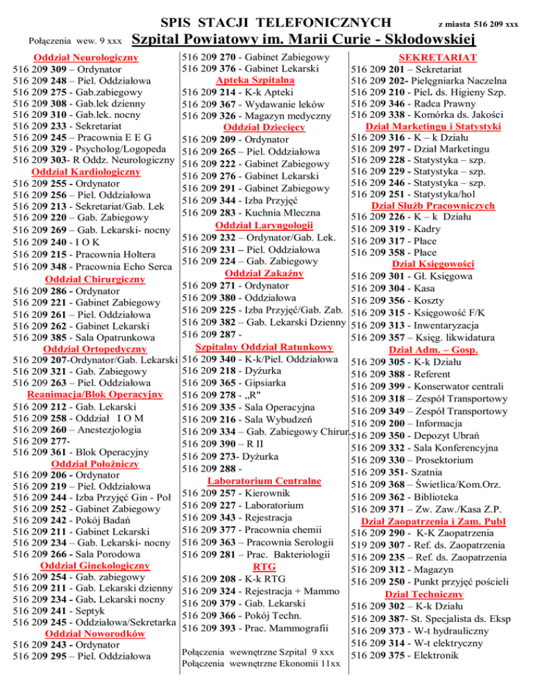 SPIS STACJI TELEFONICZNYCH Połączenia wew. 9 xxx z miasta 516 209 xxx Szpital Powiatowy im. Marii Curie - Skłodowskiej Oddział Neurologiczny 516 209 309 – Ordynator 516 209 248 – Piel. Oddziałowa 516 209 275 - Gab.zabiegowy 516 209 308 - Gab.lek dzienny 516 209 310 - Gab.lek. nocny 516 209 233 - Sekretariat 516 209 245 – Pracownia E E G 516 209 329 - Psycholog/Logopeda 516 209 303- R Oddz. Neurologiczny Oddział Kardiologiczny 516 209 255 - Ordynator 516 209 256 – Piel. Oddziałowa 516 209 213 - Sekretariat/Gab. Lek 516 209 220 – Gab. Zabiegowy 516 209 269 – Gab. Lekarski- nocny 516 209 240 - I O K 516 209 215 - Pracownia Holtera 516 209 348 - Pracownia Echo Serca Oddział Chirurgiczny 516 209 286 - Ordynator 516 209 221 - Gabinet Zabiegowy 516 209 261 – Piel. Oddziałowa 516 209 262 - Gabinet Lekarski 516 209 385 - Sala Opatrunkowa Oddział Ortopedyczny 516 209 207-Ordynator/Gab. Lekarski 516 209 321 - Gab. Zabiegowy 516 209 263 – Piel. Oddziałowa Reanimacja/Blok Operacyjny 516 209 212 - Gab. Lekarski 516 209 258 - Oddział I O M 516 209 260 – Anestezjologia 516 209 277516 209 361 - Blok Operacyjny Oddział Położniczy 516 209 206 - Ordynator 516 209 219 – Piel. Oddziałowa 516 209 244 - Izba Przyjęć Gin - Poł 516 209 252 - Gabinet Zabiegowy 516 209 242 - Pokój Badań 516 209 211 - Gabinet Lekarski 516 209 234 – Gab. Lekarski- nocny 516 209 266 - Sala Porodowa Oddział Ginekologiczny 516 209 254 - Gab. zabiegowy 516 209 211 - Gab. Lekarski dzienny 516 209 234 - Gab. Lekarski nocny 516 209 241 - Septyk 516 209 245 - Oddziałowa/Sekretarka Oddział Noworodków 516 209 243 - Ordynator 516 209 295 – Piel. Oddziałowa 516 209 270 - Gabinet Zabiegowy SEKRETARIAT 516 209 376 - Gabinet Lekarski 516 209 201 – Sekretariat Apteka Szpitalna 516 209 202- Pielęgniarka Naczelna 516 209 214 - K-k Apteki 516 209 210 - Piel. ds. Higieny Szp. 516 209 346 - Radca Prawny 516 209 367 - Wydawanie leków 516 209 338 - Komórka ds. Jakości 516 209 326 - Magazyn medyczny Dział Marketingu i Statystyki Oddział Dziecięcy 516 209 316 - K – k Działu 516 209 209 - Ordynator 516 209 297 - Dział Marketingu 516 209 265 – Piel. Oddziałowa 516 209 228 - Statystyka – szp. 516 209 222 - Gabinet Zabiegowy 516 209 229 - Statystyka – szp. 516 209 276 - Gabinet Lekarski 516 209 246 - Statystyka – szp. 516 209 291 - Gabinet Zabiegowy 516 209 251 - Statystyka/hol 516 209 344 - Izba Przyjęć Dział Służb Pracowniczych 516 209 283 - Kuchnia Mleczna 516 209 226 - K – k Działu Oddział Laryngologii 516 209 319 - Kadry 516 209 232 – Ordynator/Gab. Lek. 516 209 317 - Płace 516 209 231 – Piel. Oddziałowa 516 209 358 - Płace 516 209 224 – Gab. Zabiegowy Dział Księgowości Oddział Zakaźny 516 209 301 - Gł. Księgowa 516 209 271 - Ordynator 516 209 304 - Kasa 516 209 380 - Oddziałowa 516 209 356 - Koszty 516 209 225 - Izba Przyjęć/Gab. Zab. 516 209 315 - Księgowość F/K 516 209 382 – Gab. Lekarski Dzienny 516 209 313 - Inwentaryzacja 516 209 287 516 209 357 – Księg. likwidatura Szpitalny Oddział Ratunkowy Dział Adm. – Gosp. 516 209 340 - K-k/Piel. Oddziałowa 516 209 305 - K-k Działu 516 209 218 - Dyżurka 516 209 388 - Referent 516 209 365 - Gipsiarka 516 209 399 - Konserwator centrali 516 209 278 - „R" 516 209 318 – Zespół Transportowy 516 209 335 - Sala Operacyjna 516 209 349 – Zespół Transportowy 516 209 216 - Sala Wybudzeń 516 209 200 – Informacja 516 209 334 – Gab. Zabiegowy Chirur.516 209 350 - Depozyt Ubrań 516 209 390 – R II 516 209 332 - Sala Konferencyjna 516 209 273- Dyżurka 516 209 330 – Prosektorium 516 209 288 516 209 351- Szatnia Laboratorium Centralne 516 209 368 – Świetlica/Kom.Orz. 516 209 257 - Kierownik 516 209 362 - Biblioteka 516 209 227 - Laboratorium 516 209 371 – Zw. Zaw./Kasa Z.P. 516 209 343 - Rejestracja Dział Zaopatrzenia i Zam. Publ 516 209 377 - Pracownia chemii 516 209 290 - K-K Zaopatrzenia 516 209 363 – Pracownia Serologii 519 209 307 - Ref. ds. Zaopatrzenia 516 209 281 – Prac. Bakteriologii 516 209 235 – Ref. ds. Zaopatrzenia RTG 516 209 312 - Magazyn 516 209 208 - K-k RTG 516 209 250 - Punkt przyjęć pościeli 516 209 324 - Rejestracja + Mammo Dział Techniczny 516 209 379 - Gab. Lekarski 516 209 302 – K-k Działu 516 209 366 - Pokój Techn. 516 209 387- St. Specjalista ds. Eksp 516 209 393 - Prac. Mammografii 516 209 373 - W-t hydrauliczny Połączenia wewnętrzne Szpital 9 xxx Połączenia wewnętrzne Ekonomii 11xx 516 209 314 - W-t elektryczny 516 209 375 - Elektronik z miasta 516 850 0 xx II Budynek Szpitalny ul. Ekonomii 4 516 209 386 - Insp. Ppoż/ Insp. BHP 516 209 374 – Sterylizacja Połączenia wew. 11 xx Sekcja Informatyczna Do szpitala wew. 9 xxx 516 209 372 - K-k Sekcji Oddz. Wewnętrzny I 516 209 337 - Sekcja informatyczna 516 850 020 - Gabinet zabiegowy 516 850 041 – Piel. Oddziałowa PORADNIE I PRACOWNIE 516 850 042 - Gab. Lekarski nocny 516 209 333 – Poradnia Chorób Nacz. 516 850 043 - Gab. Lekarski dzienny 516 209 383 - Poradnia Urologiczna 516 850 044 - Ordynator 516 209 383 - Poradnia Chirurgiczna 516 850 026 - Erka 516 209 354 - Poradnia Chir. Szczęk. 516 850 046 - Kuchnia oddziałowa 516 209 272 - Poradnia Onkolog./Rej. Oddział Wewnętrzny II 516 209 342 - Poradnia Onkologiczna 516 850 049 - Ordynator 516 209 236 – Por. Laryngologiczna 516 850 027 - Gabinet lekarski 516 209 381 – Por. Chor. Zakaźnych 516 850 028 - Gabinet lekarski nocny 516 209 378 – Por. Ginekologiczna 516 850 023 - Gabinet zabiegowy 516 209 230 – Por. Gastroskopowa 516 850 054 – Piel. Oddziałowa 516 209 268 - Rehabilitacja 516 850 045 - Sekretariat 516 209 311 – Por. Kardiologiczna 516 850 040 - Kuchnia oddziałowa 516 209 341- Rejestr. + Prac. EKG 516 850 029 - Pokój socjalny 516 209 267 - Poradnia Zakładowa Oddział Rehabilitacji 516 209 280 – Pracownik Socjalny 516 850 032 - Ordynator 516 209 364 - Pracownia U S G 516 850 051 – Piel. Oddziałowa 516 850 024 - 