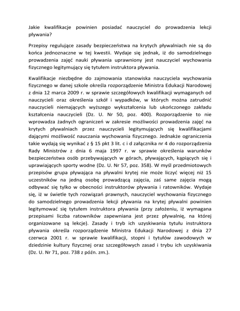 Jakie kwalifikacje powinien posiadać nauczyciel do prowadzenia lekcji pływania? Przepisy regulujące zasady bezpieczeństwa na krytych pływalniach nie są do końca jednoznaczne w tej kwestii. Wydaje się jednak, iż do samodzielnego prowadzenia zajęć nauki pływania uprawniony jest nauczyciel wychowania fizycznego legitymujący się tytułem instruktora pływania. Kwalifikacje niezbędne do zajmowania stanowiska nauczyciela wychowania fizycznego w danej szkole określa rozporządzenie Ministra Edukacji Narodowej z dnia 12 marca 2009 r. w sprawie szczegółowych kwalifikacji wymaganych od nauczycieli oraz określenia szkół i wypadków, w których można zatrudnić nauczycieli niemających wyższego wykształcenia lub ukończonego zakładu kształcenia nauczycieli (Dz. U. Nr 50, poz. 400). Rozporządzenie to nie wprowadza żadnych ograniczeń w zakresie możliwości prowadzenia zajęć na krytych pływalniach przez nauczycieli legitymujących się kwalifikacjami dającymi możliwość nauczania wychowania fizycznego. Jednakże ograniczenia takie wydają się wynikać z § 15 pkt 3 lit. c i d załącznika nr 4 do rozporządzenia Rady Ministrów z dnia 6 maja 1997 r. w sprawie określenia warunków bezpieczeństwa osób przebywających w górach, pływających, kąpiących się i uprawiających sporty wodne (Dz. U. Nr 57, poz. 358). W myśl przedmiotowych przepisów grupa pływająca na pływalni krytej nie może liczyć więcej niż 15 uczestników na jedną osobę prowadzącą zajęcia, zaś same zajęcia mogą odbywać się tylko w obecności instruktorów pływania i ratowników. Wydaje się, iż w świetle tych rozwiązań prawnych, nauczyciel wychowania fizycznego do samodzielnego prowadzenia lekcji pływania na krytej pływalni powinien legitymować się tytułem instruktora pływania (przy założeniu, iż wymagana przepisami liczba ratowników zapewniana jest przez pływalnię, na której organizowane są lekcje). Zasady i tryb ich uzyskiwania tytułu instruktora pływania określa rozporządzenie Ministra Edukacji Narodowej z dnia 27 czerwca 2001 r. w sprawie kwalifikacji, stopni i tytułów zawodowych w dziedzinie kultury fizycznej oraz szczegółowych zasad i trybu ich uzyskiwania (Dz. U. Nr 71, poz. 738 z późn. zm.). Jestem nauczycielem edukacji wczesnoszkolnej. Moja klasa ma w tym roku w ramach zajęć wf. basen. Ma to być zabawa w wodzie (dzieci w 2 klasie uczyły się pływać). Na basenie jest tylko ratownik, nie ma instruktora pływania. Dyrektor zarządził, że ja jako nauczyciel mam prowadzić zabawy w wodzie. Chciałabym wiedzieć, czy normują to jakieś akty prawne? Ja nie pływam, nie mam żadnych uprawnień i mam ogromne obawy co do tego, czy powinnam wchodzić na pływalnię z klasą i organizować dzieciom zabawy w wodzie. ODPOWIEDŹ Nauczyciel edukacji wczesnoszkolnej nie posiada kwalifikacji do prowadzenia zajęć w ramach wychowania fizycznego na basenie i nie ma tu znaczenia, czy chodzi o naukę pływania, czy o gry i zabawy w wodzie – są to niewątpliwie szczególne zajęcia, z którymi związany jest wyższy stopień zagrożenia dla dzieci. W przedstawionej sprawie chodzi przede wszystkim o bezpieczeństwo uczniów, które to powinno stanowić dobro nadrzędne i wspólny mianownik dla jakichkolwiek rozważań w tej kwestii. Odpowiednie kwalifikacje do prowadzenia tego typu zajęć posiada, przy spełnieniu innych uwarunkowań (o których będzie mowa poniżej), nauczyciel wychowania fizycznego. Zgodnie z określającym standardy kształcenia dla kierunku wychowanie fizyczne załącznikiem nr 113 do Rozporządzenia Ministra Nauki i Szkolnictwa Wyższego z dnia 12 lipca 2007 r. w sprawie standardów kształcenia dla poszczególnych kierunków oraz poziomów kształcenia, a także trybu tworzenia i warunków, jakie musi spełniać uczelnia, by prowadzić studia międzykierunkowe oraz makrokierunki (DzU z 2007 r. nr 164, poz. 1166, z późn. zm.), przyszli nauczyciele wychowania fizycznego w ramach treści i efektów kształcenia poznają takie zagadnienia, jak: – pływanie – ćwiczenia i zabawy w wodzie jako środek wspierający rozwój psychofizyczny człowieka, – technika wykonania oraz metodyka nauczania podstawowych stylów pływackich, – zasady bezpieczeństwa w czasie ćwiczeń, zabaw i imprez pływackich, – elementy ratownictwa wodnego, – wybrane elementy współczesnych sportów pływackich. Ustalenie kwestii stosownych kwalifikacji do prowadzenia tego typu zajęć wymaga jeszcze przyjrzenia się innym wymogom ustalonym w zakresie bezpieczeństwa dzieci przez przepisy powszechnie obowiązujące. W dalszej kolejności należy zatem sięgnąć do załącznika nr 4 Rozporządzenia Rady Ministrów z dnia 6 maja 1997 r. w sprawie określenia warunków bezpieczeństwa osób przebywających w górach, pływających, kąpiących się i uprawiających sporty wodne (DzU z 1997 r. nr 57, poz. 358), które określają szczegółowe warunki bezpieczeństwa osób korzystających z kąpielisk i pływalni. Zgodnie z zasadami wskazanymi w § 15 pkt 3 lit c oraz d to regulamin basenu powinien w swojej treści przesądzać m.in., o tym że: – zajęcia na pływalni krytej mogą odbywać się tylko w obecności instruktorów pływania i ratowników, – grupa pływająca na pływalni krytej nie może liczyć więcej niż 15 uczestników na jedną osobę prowadzącą zajęcia. Reasumując, nauczyciel edukacji wczesnoszkolnej nie ma uprawnień do prowadzenia zajęć na basenie w ramach zajęć z wychowania fizycznego. Niezbędne kwalifikacje w tym zakresie wydaje się posiadać nauczyciel wychowania fizycznego, z tym że muszą być przy tym spełnione inne wymogi określone w przepisach powszechnie obowiązujących – obecność instruktorów pływania i ratowników. Innymi słowy, nawet nauczyciel wychowania fizycznego legitymujący się tytułem instruktora pływania nie może samodzielnie prowadzić zajęć na basenie z dziećmi (np. pod nieob