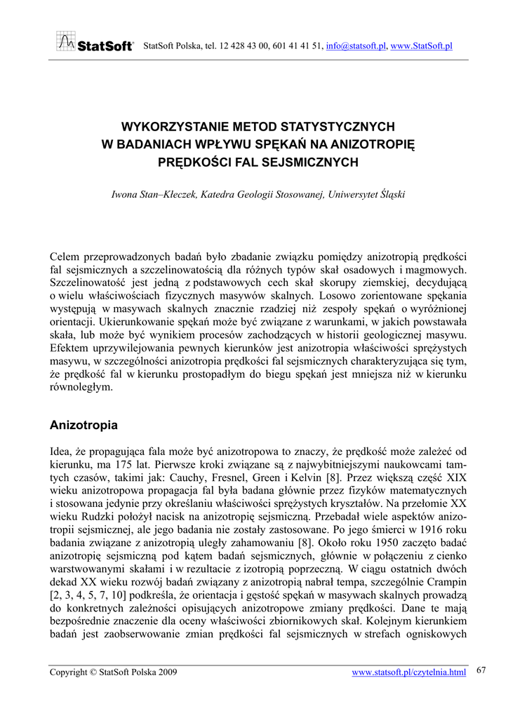 StatSoft Polska, tel. 12 428 43 00, 601 41 41 51, [email protected], www.StatSoft.pl WYKORZYSTANIE METOD STATYSTYCZNYCH W BADANIACH WPŁYWU SPĘKAŃ NA ANIZOTROPIĘ PRĘDKOŚCI FAL SEJSMICZNYCH Iwona Stan–Kłeczek, Katedra Geologii Stosowanej, Uniwersytet Śląski Celem przeprowadzonych badań było zbadanie związku pomiędzy anizotropią prędkości fal sejsmicznych a szczelinowatością dla różnych typów skał osadowych i magmowych. Szczelinowatość jest jedną z podstawowych cech skał skorupy ziemskiej, decydującą o wielu właściwościach fizycznych masywów skalnych. Losowo zorientowane spękania występują w masywach skalnych znacznie rzadziej niż zespoły spękań o wyróżnionej orientacji. Ukierunkowanie spękań może być związane z warunkami, w jakich powstawała skała, lub może być wynikiem procesów zachodzących w historii geologicznej masywu. Efektem uprzywilejowania pewnych kierunków jest anizotropia właściwości sprężystych masywu, w szczególności anizotropia prędkości fal sejsmicznych charakteryzująca się tym, że prędkość fal w kierunku prostopadłym do biegu spękań jest mniejsza niż w kierunku równoległym. Anizotropia Idea, że propagująca fala może być anizotropowa to znaczy, że prędkość może zależeć od kierunku, ma 175 lat. Pierwsze kroki związane są z najwybitniejszymi naukowcami tamtych czasów, takimi jak: Cauchy, Fresnel, Green i Kelvin [8]. Przez większą część XIX wieku anizotropowa propagacja fal była badana głównie przez fizyków matematycznych i stosowana jedynie przy określaniu właściwości sprężystych kryształów. Na przełomie XX wieku Rudzki położył nacisk na anizotropię sejsmiczną. Przebadał wiele aspektów anizotropii sejsmicznej, ale jego badania nie zostały zastosowane. Po jego śmierci w 1916 roku badania związane z anizotropią uległy zahamowaniu [8]. Około roku 1950 zaczęto badać anizotropię sejsmiczną pod kątem badań sejsmicznych, głównie w połączeniu z cienko warstwowanymi skałami i w rezultacie z izotropią poprzeczną. W ciągu ostatnich dwóch dekad XX wieku rozwój badań związany z anizotropią nabrał tempa, szczególnie Crampin [2, 3, 4, 5, 7, 10] podkreśla, że orientacja i gęstość spękań w masywach skalnych prowadzą do konkretnych zależności opisujących anizotropowe zmiany prędkości. Dane te mają bezpośrednie znaczenie dla oceny właściwości zbiornikowych skał. Kolejnym kierunkiem badań jest zaobserwowanie zmian prędkości fal sejsmicznych w strefach ogniskowych Copyright © StatSoft Polska 2009 www.statsoft.pl/czytelnia.html 67 StatSoft Polska, tel. 12 428 43 00, 601 41 41 51, [email protected], www.StatSoft.pl przed trzęsieniami ziemi, związanych z ewolucją nieciągłości istniejących w masywach skalnych tych obszarów. Obserwacje doświadczalne stanowiły podstawę do tworzenia modeli teoretycznych weryfikowanych następnie przez nowe prace doświadczalne. Rachunek tensorowy Określenie zależności pomiędzy anizotropią spękań a anizotropią prędkości fal sejsmicznych możliwe jest dzięki zastosowaniu rachunku tensorowego. Umożliwia on uwzględnienie zarówno geometrii, jak i orientacji spękań przez wprowadzenie tensora spękań, którego składowe zależą od obu tych czynników. Rachunek tensorowy można zastosować również do opisu kierunkowych rozkładów prędkości fal sejsmicznych. Tensory prędkości, wyznaczone na podstawie pomiarów prędkości fal, odwzorowują anizotropię sejsmiczną i pozwalają obliczyć prędkość w dowolnie wybranym kierunku. Badając związek pomiędzy anizotropią prędkości fal sejsmicznych a szczelinowatością, brane były pod uwagę tylko spękania prostopadłe do warstwowania. Pozwoliło to na obliczenie dwuwymiarowego tensora spękań i tensora prędkości w płaszczyźnie równoległej do powierzchni warstwy [9, 11, 12, 13]. Zastosowanie rachunku tensorowego umożliwia uwzględnienie zarówno geometrii, jak i orientacji spękań przez wprowadzenie tensora spękań, którego składowe zależą od obu tych czynników. Tensor spękań k-tego rzędu zdefiniowany jest następująco: Fˆij ...l = EAij ...l , Aij ...l jest iloczynem kartezjańskim k-tego rzędu wektora n reprezentującego orientację spękania przez siebie. Aby wyznaczyć tensor spękań, musimy znać postać rozkładu statystycznego rozmiarów i orientacji spękań, reprezentowanego przez funkcję E(a,c, n ), która powinna być symetryczna względem n : r r E (a, c, n ) = Ε(a, c,− n ). Tensor spękań dla spękania o kształcie monety można obliczyć, korzystając z wyrażenia: Fˆi , j ...l = π 4 a max cmax ∫ 0 r 2 ( )da dc dΩ , a c n n ... n E a , c , n i j l ∫∫ 0Ω gdzie a jest średnicą spękania, c jego rozwarciem. Całkowanie prowadzi się po pełnym kącie bryłowym Ω. Tensor spękań rzędu zerowego opisuje gęstość spękań, bez uwzględnienia ich kierunków, natomiast tensor drugiego rzędu stanowi pierwsze przybliżenie dla opisu anizotropii spękań. Rachunek tensorowy można zastosować również do opisu kierunkowych rozkładów prędkości fal sejsmicznych. Tensory prędkości wyznaczone na podstawie pomiarów prędkości fal w niektórych kierunkach odwzorowują anizotropię sejsmiczną i pozwalają obliczyć prędkość w dowolnie wybranym kierunku. Tensor prędkości, w przypadku pomiarów sejsmiki refrakcyjnej, może być obliczany z pomiarów prędkości w N niezależnych 68 www.statsoft.pl/czytelnia.html Copyright © StatSoft Polska 2009 StatSoft Polska, tel. 12 428 43 00, 601 41 41 51, [email protected], www.StatSoft.pl kierunkach. Składowe tensora są obliczane z układu równań przy wykorzystaniu metody najmniejszych kwadratów: 2 ⎛ vp ⎞ ⎜⎜ ⎟⎟ = Vl1l2 ...lk ⋅ ml(1 p ) m (l p ) ...m (l p ) 2 k ⎝ v0 ⎠ p=1,2 …N Metodyka przeprowadzonych badań W celu określenia związku pomiędzy anizotropią prędkości fal sejsmicznych a szczelinowatością zostały