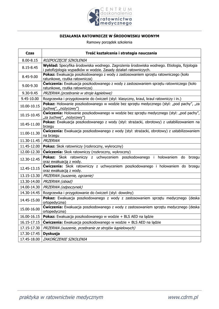 DZIAŁANIA RATOWNICZE W ŚRODOWISKU WODNYM Ramowy porządek szkolenia Czas 8.00-8.15 8.15-8.45 8.45-9.00 9.00-9.30 Treść kształcenia i strategia nauczania ROZPOCZĘCIE SZKOLENIA Wykład: Specyfika środowiska wodnego. Zagrożenia środowiska wodnego. Etiologia, fizjologia i patofizjologia wypadków w wodzie. Zasady działań ratowniczych. Pokaz: Ewakuacja poszkodowanego z wody z zastosowaniem sprzętu ratowniczego (koło ratunkowe, rzutka ratownicza) Ćwiczenia: Ewakuacja poszkodowanego z wody z zastosowaniem sprzętu ratowniczego (koło ratunkowe, rzutka ratownicza) 9.30-9.45 PRZERWA (przebranie w stroje kąpielowe) 9.45-10.00 Rozgrzewka i przygotowanie do ćwiczeń (styl: klasyczny, kraul, kraul ratowniczy i in.) Pokaz: Holowanie poszkodowanego w wodzie bez sprzętu medycznego (styl: „pod pachy”, „za żuchwę”, „nożycowy”) Ćwiczenia: Holowanie poszkodowanego w wodzie bez sprzętu medycznego (styl: „pod pachy”, „za żuchwę”, „nożycowy”) Pokaz: Ewakuacja poszkodowanego z wody (styl: strażacki, obrotowy) z ustabilizowaniem na brzegu Ćwiczenia: Ewakuacja poszkodowanego z wody (styl: strażacki, obrotowy) z ustabilizowaniem na brzegu 10.00-10.15 10.15-10.45 10.45-11.00 11.00-11.30 11.30-11.45 PRZERWA 11.45-12.00 Pokaz: Skok ratowniczy (rozkroczny, wykroczny) 12.00-12.30 Ćwiczenia: Skok ratowniczy (rozkroczny, wykroczny) Pokaz: Skok ratowniczy z uchwyceniem poszkodowanego i holowaniem do brzegu 12.30-12.45 oraz ewakuacją z wody. Ćwiczenia: Skok ratowniczy z uchwyceniem poszkodowanego i holowaniem do brzegu 12.45-13.15 oraz ewakuacją z wody. 13.15-13.30 PRZERWA (suszenie, ogrzanie) 13.30-14.00 PRZERWA (obiad) 14.00-14.30 PRZERWA (odpoczynek) 14.30-14.45 Rozgrzewka i przygotowanie do ćwiczeń (styl: dowolny) Pokaz: Ewakuacja poszkodowanego z wody z zastosowaniem sprzętu medycznego (deska 14.45-15.00 ortopedyczna) Ćwiczenia: Ewakuacja poszkodowanego z wody z zastosowaniem sprzętu medycznego (deska 15.00-16.00 ortopedyczna) 16.00-16.15 Pokaz: Ewakuacja poszkodowanego w wodzie + BLS AED na lądzie 16.15-17.15 Ćwiczenia: Ewakuacja poszkodowanego w wodzie + BLS AED na lądzie 17.15-17.30 PRZERWA (suszenie, przebranie ze strojów kąpielowych) 17.30-17.45 Dyskusja 17.45-18.00 ZAKOŃCZENIE SZKOLENIA