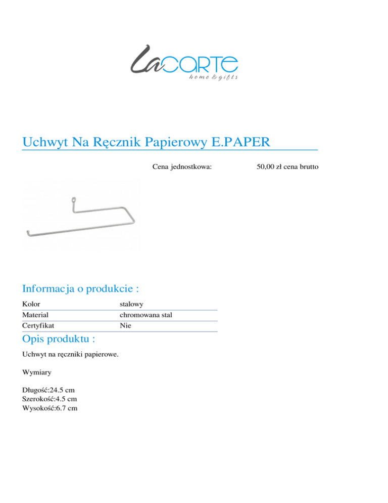 Uchwyt Na Ręcznik Papierowy E.PAPER Cena jednostkowa: Informacja o produkcie : Kolor Material Certyfikat Opis produktu : Uchwyt na ręczniki papierowe. Wymiary Długość:24.5 cm Szerokość:4.5 cm Wysokość:6.7 cm Powered by TCPDF (www.tcpdf.org) stalowy chromowana stal Nie 50,00 zł cena brutto