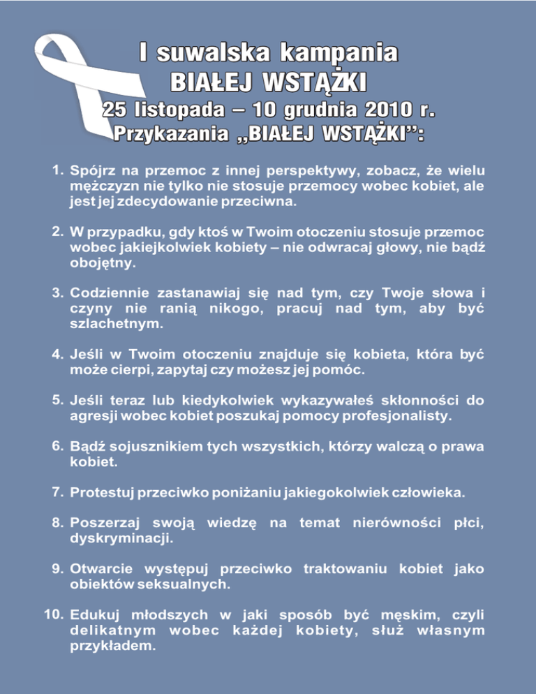 I suwalska kampania BIA£EJ WST¥¯KI 25 listopada – 10 grudnia 2010 r. Przykazania „BIA£EJ WST¥¯KI”: 1. Spójrz na przemoc z innej perspektywy, zobacz, ¿e wielu mê¿czyzn nie tylko nie stosuje przemocy wobec kobiet, ale jest jej zdecydowanie przeciwna. 2. W przypadku, gdy ktoœ w Twoim otoczeniu stosuje przemoc wobec jakiejkolwiek kobiety – nie odwracaj g³owy, nie b¹dŸ obojêtny. 3. Codziennie zastanawiaj siê nad tym, czy Twoje s³owa i czyny nie rani¹ nikogo, pracuj nad tym, aby byæ szlachetnym. 4. Jeœli w Twoim otoczeniu znajduje siê kobieta, która byæ mo¿e cierpi, zapytaj czy mo¿esz jej pomóc. 5. Jeœli teraz lub kiedykolwiek wykazywa³eœ sk³onnoœci do agresji wobec kobiet poszukaj pomocy profesjonalisty. 6. B¹dŸ sojusznikiem tych wszystkich, którzy walcz¹ o prawa kobiet. 7. Protestuj przeciwko poni¿aniu jakiegokolwiek cz³owieka. 8. Poszerzaj swoj¹ wiedzê na temat nierównoœci p³ci, dyskryminacji. 9. Otwarcie wystêpuj przeciwko traktowaniu kobiet jako obiektów seksualnych. 10. Edukuj m³odszych w jaki sposób byæ mêskim, czyli delikatnym wobec ka¿dej kobiety, s³u¿ w³asnym przyk³adem.