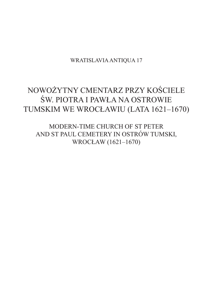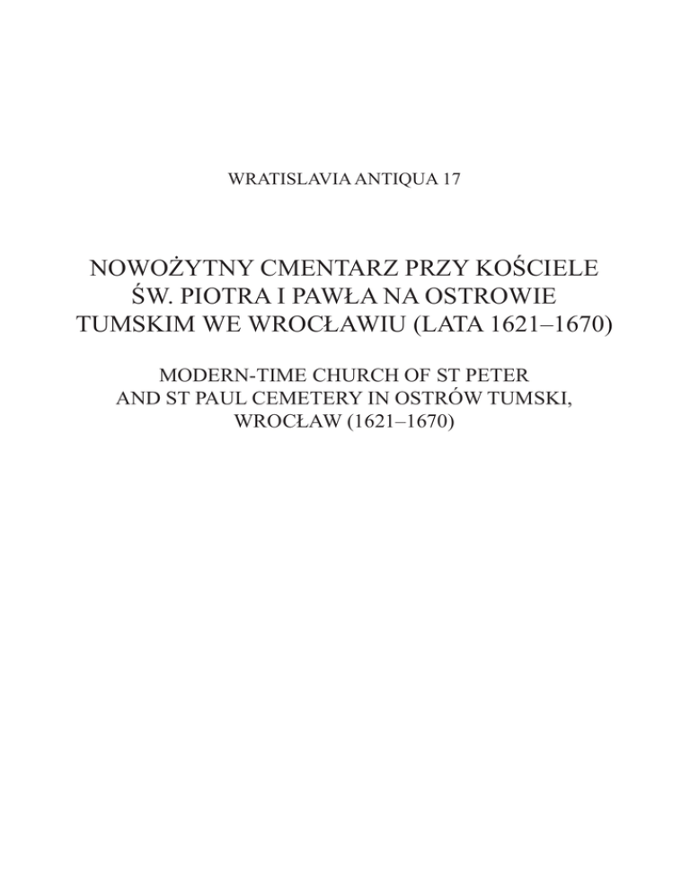 WRATISLAVIA ANTIQUA 17 NOWOŻYTNY CMENTARZ PRZY KOŚCIELE ŚW. PIOTRA I PAWŁA NA OSTROWIE TUMSKIM WE WROCŁAWIU (LATA 1621–1670) MODERN-TIME CHURCH OF ST PETER AND ST PAUL CEMETERY IN OSTRÓW TUMSKI, WROCŁAW (1621–1670) ZESPÓŁ DO BADAŃ ŚREDNIOWIECZNEGO I NOWOŻYTNEGO WROCŁAWIA RESEARCH TEAM FOR STUDIES ON MEDIEVAL AND EARLY MODERN WROCŁAW WRATISLAVIA ANTIQUA STUDIA Z DZIEJÓW WROCŁAWIA STUDIES ON THE HISTORY OF WROCŁAW 17 Komitet Redakcyjny Edited by Krzysztof Wachowski Jan Klápště Stephan Krabath Marta Młynarska-Kaletynowa Jerzy Piekalski UNIWERSYTET WROCŁAWSKI Instytut Archeologii NOWOŻYTNY CMENTARZ PRZY KOŚCIELE ŚW. PIOTRA I PAWŁA NA OSTROWIE TUMSKIM WE WROCŁAWIU (LATA 1621–1670) MODERN-TIME CHURCH OF ST PETER AND ST PAUL CEMETERY IN OSTRÓW TUMSKI, WROCŁAW (1621–1670) REDAKCJA ALEKSANDRA PANKIEWICZ WROCŁAW 2012 Recenzent: Krzysztof Wachowski Opracowanie redakcyjne i korekta: Karol Bykowski Tłumaczenie na j. angielski: Marlena Ryl-Zalewska, Karolina Pajzert Opracowanie techniczne i skład komputerowy: Marek J. Battek Projekt okładki: Barbara Kaczmarek Rycina na okładce: Plan Wrocławia z 1652 r. Weinerów według reprodukcji J. Partscha z 1826 r. (za: Wrocław na planach XVI–XX wiek, Wrocław 1999) ISBN 978-83-61416-88-3 Uniwersytet Wrocławski Instytut Archeologii Wydanie książki dofinansowano ze środków Ministra Kultury i Dziedzictwa Narodowego © Copyright by Uniwersytet Wrocławski Wrocław 2012 Nakład: 200 egz. Druk i oprawa: Wrocławska Drukarnia Naukowa PAN im. St. Kulczyńskiego, Sp. z o.o. 53-505 Wrocław, ul. Lelewela 4 4 SPIS TREŚCI Aleksandra Pankiewicz Wstęp ........................................................................................................................................................7 I. NOWOŻYTNY CMENTARZ PRZY KOŚCIELE ŚW. PIOTRA I PAWŁA NA OSTROWIE TUMSKIM WE WROCŁAWIU Aleksandra Pankiewicz, Kamila Marcinkiewicz Cmentarz przy kościele św. Piotra i Pawła we Wrocławiu ....................................................................13 Magdalena Wojcieszak Cmentarz św. Piotra i Pawła na Ostrowie Tumskim w świetle ksiąg parafialnych................................47 Aleksandra Pankiewicz, Jacek Witkowski Dewocjonalia barokowe odkryte na cmentarzysku przy kościele św. Piotra i Pawła na Ostrowie Tumskim we Wrocławiu.........................................................................................................................49 Barbara Kwiatkowska, Natalia Szymczak Analiza antropologiczna kości ludzkich z badań przy kościele św. Piotra i Pawła na Ostrowie Tumskim we Wrocławiu.........................................................................................................................69 II. ŻYCIE WOKÓŁ CMENTARZA – KULTURA MATERIALNA MIESZKAŃCÓW OSTROWA TUMSKIEGO W ŚREDNIOWIECZU I OKRESIE NOWOŻYTNYM Jakub Sawicki Elementy stroju i pasa oraz fragmenty opraw ksiąg z ul. Katedralnej 4 we Wrocławiu ........................97 Paweł Duma Numizmaty z badań przy kościele św. Piotra i Pawła na Ostrowie Tumskim we Wrocławiu ............ 111 Jakub Sawicki Stracony Czas. Fragment XVI-wiecznego norymberskiego zegarka dyptykowego z Wrocławia .......119 Maksym Mackiewicz Nowożytna ceramika artystyczna z badań archeologicznych przy kościele św. Piotra i Pawła na Ostrowie Tumskim we Wrocławiu ..................................................................................................129 Joanna Chudziak, Fajki ceramiczne z ul. Katedralnej 4 we Wrocławiu ....................................................161 Krzysztof Jaworski Obróbka surowca kościanego w średniowieczu i czasach nowożytnych w zachodniej części Ostrowa Tumskiego we Wrocławiu. Materiały z posesji przy ul. Katedralnej 4 .................................165 5 Aleksander Chrószcz, Maciej Janeczek Wstępna ocena szczątków kostnych zwierząt ze stanowiska archeologicznego przy ul. Katedralnej 4 na Ostrowie Tumskim we Wrocławiu ..............................................................205 Ewa Lisowska Średniowieczne i nowożytne wyroby z kamienia odkryte podczas badań przy ulicy Katedralnej 4 we Wrocławiu ......................................................................................................................................223 Piotr Gunia Charakterystyka petrograficzna zabytków kamiennych pochodzących z badań archeologicznych przy ulicy Katedralnej 4 we Wrocławiu ...............................................................................................239 Aleksandra Pankiewicz Podsumowanie......................................................................................................................................255 Aleksandra Pankiewicz Summary ..............................................................................................................................................259 6