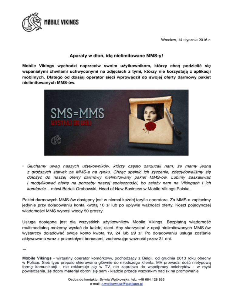 Wrocław, 14 stycznia 2016 r. Aparaty w dłoń, idą nielimitowane MMS-y! Mobile Vikings wychodzi naprzeciw swoim użytkownikom, którzy chcą podzielić się wspaniałymi chwilami uchwyconymi na zdjęciach z tymi, którzy nie korzystają z aplikacji mobilnych. Dlatego od dzisiaj operator sieci wprowadził do swojej oferty darmowy pakiet nielimitowanych MMS-ów. - Słuchamy uwag naszych użytkowników, którzy często zarzucali nam, że mamy jedną z droższych stawek za MMS-a na rynku. Chcąc spełnić ich życzenie, zdecydowaliśmy się dołożyć do naszej oferty darmowy nielimitowany pakiet MMS-ów. Lubimy zaskakiwać i modyfikować ofertę na potrzeby naszej społeczności, bo zależy nam na Vikingach i ich komforcie— mówi Bartek Grabowski, Head of New Business w Mobile Vikings Polska. Pakiet darmowych MMS-ów dostępny jest w niemal każdej taryfie operatora. Za MMS-a zapłacimy jedynie przy doładowaniu konta kwotą 10 zł lub po upływie ważności oferty. Koszt pojedynczej wiadomości MMS wynosi wtedy 50 groszy. Usługa dostępna jest dla wszystkich użytkowników Mobile Vikings. Bezpłatną wiadomość multimedialną możemy wysłać do każdej sieci. Aby skorzystać z opcji nielimitowanych MMS-ów wystarczy doładować swoje konto kwotą 19, 24 lub 29 zł. Po doładowaniu usługa zostanie aktywowana wraz z pozostałymi bonusami, zachowując ważność przez 31 dni. — Mobile Vikings - wirtualny operator komórkowy, pochodzący z Belgii, od grudnia 2013 roku obecny w Polsce. Sieć typu prepaid skierowana głównie do młodszego klienta. MV prowadzi dość nietypową formę komunikacji - nie reklamuje się w TV, nie zaprasza do współpracy celebrytów - w myśl powiedzenia, że dobry materiał obroni się sam - kładzie przede wszystkim nacisk na promowanie Osoba do kontaktu: Sylwia Wojtkowska, tel.: +48 664 128 863 e-mail: [email protected] atrakcyjnej oferty, wśród której dużą popularnością cieszy się akcja „Rok za free”. Marka wypracowała swój własny format „Vikingowie Internetu”, w którym główne postacie zostały odegrane przez najpopularniejszych polskich youtuberów: ReZigiusza, MultiGameplayGuy’a i Masterczułka. MV współpracuje także z Chujową Panią Domu, realizując wspólnie trasę spotkań z bohaterką pod nazwą „ChPD on tour”. Osoba do kontaktu: Sylwia Wojtkowska, tel.: +48 664 128 863 e-mail: [email protected]