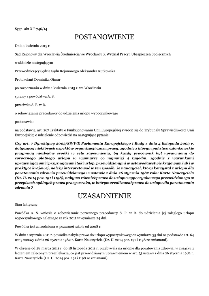Sygn. akt X P 746/14 POSTANOWIENIE Dnia 1 kwietnia 2015 r. Sąd Rejonowy dla Wrocławia Śródmieścia we Wrocławiu X Wydział Pracy i Ubezpieczeń Społecznych w składzie następującym Przewodniczący Sędzia Sądu Rejonowego Aleksandra Rutkowska Protokolant Dominika Otmar po rozpoznaniu w dniu 1 kwietnia 2015 r. we Wrocławiu sprawy z powództwa A. S. przeciwko S. P. w R. o zobowiązanie pracodawcy do udzielenia urlopu wypoczynkowego postanawia: na podstawie, art. 267 Traktatu o Funkcjonowaniu Unii Europejskiej zwrócić się do Trybunału Sprawiedliwości Unii Europejskiej o udzielenie odpowiedzi na następujące pytanie: Czy art. 7 Dyrektywy 2003/88/WE Parlamentu Europejskiego i Rady z dnia 4 listopada 2003 r. dotyczącej niektórych aspektów organizacji czasu pracy, zgodnie z którym państwa członkowskie przyjmują niezbędne środki w celu zapewnienia, by każdy pracownik był uprawniony do corocznego płatnego urlopu w wymiarze co najmniej 4 tygodni, zgodnie z warunkami uprawniającymi i przyznającymi taki urlop, przewidzianymi w ustawodawstwie krajowym lub i w praktyce krajowej, należy interpretować w ten sposób, że nauczyciel, który korzystał z urlopu dla poratowania zdrowia przewidzianego w ustawie z dnia 26 stycznia 1982 roku Karta Nauczyciela (Dz. U. 2014 poz. 191 i 1198), nabywa również prawo do urlopu wypoczynkowego przewidzianego w przepisach ogólnych prawa pracy w roku, w którym zrealizował prawo do urlopu dla poratowania zdrowia ? UZASADNIENIE Stan faktyczny: Powódka A. S. wniosła o zobowiązanie pozwanego pracodawcy S. P. w R. do udzielenia jej zaległego urlopu wypoczynkowego należnego za rok 2011 w wymiarze 24 dni. Powódka jest zatrudniona w pozwanej szkole od 2008 r. W dniu 1 stycznia 2011 r. powódka nabyła prawo do urlopu wypoczynkowego w wymiarze 35 dni na podstawie art. 64 ust 3 ustawy z dnia 26 stycznia 1982 r. Karta Nauczyciela (Dz. U. 2014 poz. 191 i 1198 ze zmianami). W okresie od 28 marca 2011 r. do 18 listopada 2011 r. przebywała na urlopie dla poratowania zdrowia, w związku z leczeniem zaleconym przez lekarza, co jest przewidzianym uprawnieniem w art. 73 ustawy z dnia 26 stycznia 1982 r. Karta Nauczyciela (Dz. U. 2014 poz. 191 i 1198 ze zmianami). W dniu 27 kwietnia 2012 r. powódka zwróciła się do pracodawcy o udzielenie jej zaległego urlopu wypoczynkowego, w związku z jego niewykorzystaniem w 2011 roku z uwagi na urlop dla poratowania zdrowia. Pracodawca odmówił udzielenia tego urlopu powołując się na fakt przebywania przez powódkę na urlopie dla poratowania zdrowia. Pracodawca wskazał, że w 2011 r. był ustalony plan urlopów i urlop dla poratowania zdrowia przyznany powódce, pokrył się z urlopem wypoczynkowym – tym samym urlop dla poratowania zdrowia, zdaniem pracodawcy „pochłonął” urlop wypoczynkowy. Uzasadnienie złożenia wniosku o wydanie orzeczenie w trybie prejudycjalnym. Wydanie orzeczenia w trybie prejudycjalnym ma kluczowe znaczenie w rozwiązaniu zagadnienia dotyczącego tzw. pochłonięcia urlopu wypoczynkowego przez urlop dla poratowania zdrowia wynikającego z pragmatyki służbowej nauczycieli, jaką jest ustawa z dnia 26 stycznia 1982 r. Karta Nauczyciela (Dz. U. 2014 poz. 191 i 1198 ze zmianami). Powyższe kwestie regulują następujące przepisy krajowe: 1) Art. 64 ust 3 ustawy z dnia 26 stycznia 1982 r. Karta Nauczyciela (Dz. U. 2014 poz. 191 i 1198), który zakłada, że nauczycielom zatrudnionym w szkołach, w których nie są przewidziane ferie szkolne, przysługuje prawo do urlopu wypoczynkowego w wymiarze 35 dni roboczych w czasie ustalonym w planie urlopów; 2) Art. 64 ust 5a. ustawy z dnia 26 stycznia 1982 r. Karta Nauczyciela ( Dz.U. 2014 poz.191i 1198), który stanowi, że nauczyciel zatrudniony w szkole, w której nie są przewidziane ferie szkolne, w przypadku nawiązania lub ustania stosunku pracy w trakcie roku kalendarzowego, ma prawo do urlopu wypoczynkowego w wymiarze proporcjonalnym do okresu przepracowanego, zgodnie z odrębnymi przepisami – określonymi w art. 165 i 166 ustawy z dnia 26 czerwca 1974 r. Kodeks Pracy ( Dz. U. z 1974 nr 24 poz. 141 z późn. zm), wskazującymi, że jeżeli pracownik nie może rozpocząć urlopu w ustalonym terminie z przyczyn usprawiedliwiających nieobecność w pracy, a w szczególności z powodu: 1. czasowej niezdolności do pracy wskutek choroby, 2. odosobnienia w związku z chorobą zakaźną, 3. powołania na ćwiczenia wojskowe albo na przeszkolenie wojskowe na czas do 3 miesięcy, 4. urlopu macierzyńskiego, pracodawca jest obowiązany przesunąć urlop lub jego część na termin późniejszy. Przepisy te nie regulują przypadku, w którym pracownik- nauczyciel uzyskał prawo do urlopu dla poratowania zdrowia. Sąd Najwyższy w wyroku z dnia 10 lutego 1988 r., III PZP 4/88 (LEX nr 55402), wskazał jednoznacznie, że urlop dla poratowania zdrowia jest odmianą urlopu pracowniczego, najbardziej zbliżoną w swej konstrukcji i celu do urlopu wypoczynkowego, stąd nie można z obydwu tych instytucji korzystać w tym samym czasie, ani też uzupełniająco wykorzystać w późniejszym terminie, bowiem urlop wypoczynkowy został skonsumowany przez urlop dla poratowania zdrowia. Charakterystyka urlopu dla poratowania zdrowia Charakter prawny urlopu dla poratowania zdrowia jest unormowany w art. 73 . ustawy z dnia 26 stycznia 1982 r. Karta Nauczyciela ( Dz.U. 2014 poz.191 i 1198). Celem wykorzystania tej instytucji jest poprawa stanu zdrowia nauczyciela w następstwie przeprowadzonego leczenia i zaleconego przez lekarza ubezpieczenia zdrowotnego. Urlop ten nie jest świadczeniem o charakterze ubezpieczeniowym, związanym z zaistnieniem prawnie chronionego ryzyka czasowej lub długotrwałej utraty zdolności do pracy wskutek choroby. Nie jest quasi zasiłkiem chorobowym, ani quasi świadczeniem rehabilitacyjnym, ani tym bardziej quasi rentą okresową. Jest świadczeniem pracowniczym, przysługującym w ramach stosunku pracy łącząc