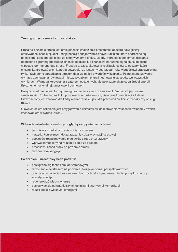 Trening antystresowy i sztuka relaksacji Praca na poziomie stresu jest umiejętnością znalezienia przestrzeni, obszaru największej efektywności osobistej. Jest umiejętnością podejmowania decyzji i działań, które obarczone są napięciem i stresem, ale niosą za sobą wymierne efekty. Osoby, które stale podejmują działania obarczone ogromną odpowiedzialnością osobistą lub finansową narażone są na skutki uboczne w postaci permanentnego stresu. Frustracje, czas, skuteczna realizacja celów to obszary, które chcemy kontrolować a ich kontrola powoduje, że jesteśmy postrzegani jako wartościowi pracownicy na rynku. Świadome zarządzanie stresem daje wolność i otwartość w działaniu. Pełne zaangażowanie wymaga zachowania równowagi między wydatkami energii i odnową jej zasobów we wszystkich wymiarach. Wymaga korzystania z czterech oddzielnych, ale powiązanych ze sobą źródeł energii: fizycznej, emocjonalnej, umysłowej i duchowej. Powyższe szkolenie jest formą treningu radzenia sobie z obszarami, które decydują o naszej skuteczności. To trening na kilku poziomach: umysłu, emocji, ciała oraz komunikacji z ludźmi. Przeznaczony jest zarówno dla kadry menadżerskiej, jak i dla pracowników linii sprzedaży czy obsługi Klienta. Głównym celem szkolenia jest przygotowanie uczestników do kierowania w sposób świadomy swoich zachowaniem w sytuacji stresu. W trakcie szkolenia uczestnicy pogłębią swoją wiedzę na temat: technik oraz metod radzenia sobie ze stresem narzędzi koniecznych do zarządzania sobą w sytuacji stresowej sposobów rozpoznawania przejawów stresu oraz przyczyn wpływu samooceny na radzenie sobie ze stresem procesów i zasad pracy na poziomie stresu techniki relaksacyjnych Po szkoleniu uczestnicy będą potrafili: posługiwać się technikami antystresowymi radzić sobie ze stresem na poziomie „bieżącym” oraz „perspektywicznym” pracować w napięciu bez skutków ubocznych takich jak: uzależnienia, pomyłki, choroby somatyczne itp. regenerować własną energię posługiwać się najważniejszymi technikami asertywnej komunikacji radzić sobie z własnymi emocjami Grupa docelowa Szkolenie dedykowane jest dla osób, które w codziennym życiu często stykają się ze stresującymi sytuacjami. Dla menadżerów i pracowników działów obsługi Klienta i reklamacji poddawanych dużej presji, a pragnących zarządzać swoim stresem poprzez używanie sprawdzonych metod. Dla osób rozpoczynających pracę zainteresowanych skutecznym zarządzaniem swoim emocjami oraz wszystkich zainteresowanych rozwojem osobistym. Program szkolenia Szczegółowy zakres szkolenia zostanie dopasowany do specyfiki firmy, branży oraz potrzeb Klienta. Metody pracy Szkolenie ma charakter warsztatowy. Ponad 80% czasu przeznaczone jest na ćwiczenia angażujące wszystkich uczestników w celu wypracowania i przećwiczenia konkretnych umiejętności. W trakcie szkolenia odwołujemy się do zasad efektywnego uczenia się dorosłych. Wykorzystane zostaną następujące metody pracy: burza mózgów, ćwiczenia indywidualne i grupowe, testy, gry symulacyjne, analizy case study, psychodrama. Charakter szkolenia Otwarte lub wewnętrzne realizowane w grupie od 4-16 osób lub według indywidualnych ustaleń. Czas trwania Od 2 do 6 dni. Każdy z modułów szkoleniowych trwa 90 minut. Szkolenie odbywa się w godzinach 9-17 lub w uzgodnionych indywidualnie z Klientem. Materiały szkoleniowe Materiały szkoleniowe są podsumowaniem i uzupełnieniem materiału omawianego w trakcie szkolenia. Uczestnicy otrzymują je w formie drukowanej. Miejsce realizacji szkolenia W siedzibie Klienta lub w miejscu przez niego wskazanym. Raport poszkoleniowy Po realizacji szkolenia przygotowywany jest raport zawierający podsumowanie szkolenia, najważniejsze wnioski, rekomendacje dotyczące działań na przyszłość. Wsparcie szkoleniowe W ciągu miesiąca po szkoleniu zapraszamy do kontaktu, zadawania pytań odnośnie zagadnień realizowanych na szkoleniu. Wyślij zapytanie, a przedstawimy Ci szkolenie dostosowane do specyfiki i potrzeb Twojej firmy! Zapraszamy do kontaktu, tel. 22/ 839 55 99 wew. 225 MCS sp. z o.o. sp. k., ul. Czerska 14, 00-732 Warszawa [email protected], www.mcs.edu.pl