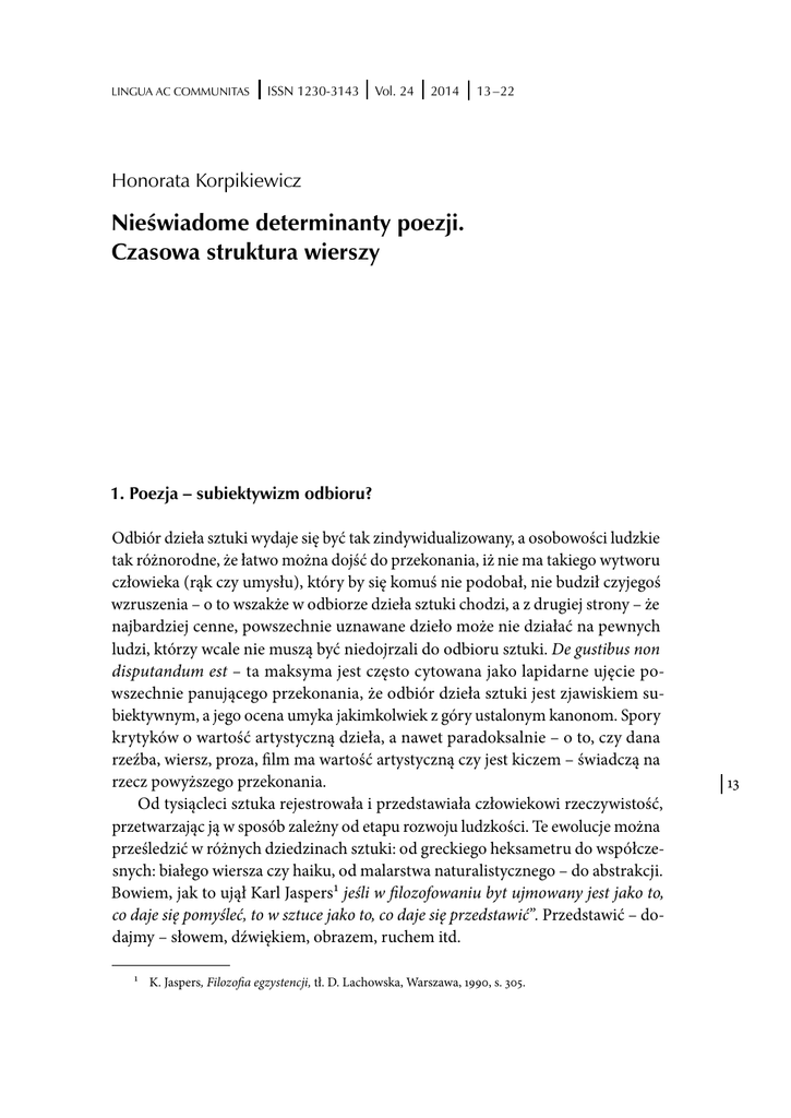 LINGUA AC COMMUNITAS ISSN 1230-3143 Vol. 24 2014 13 – 22 Honorata Korpikiewicz Nieświadome determinanty poezji. Czasowa struktura wierszy 1. Poezja – subiektywizm odbioru? Odbiór dzieła sztuki wydaje się być tak zindywidualizowany, a osobowości ludzkie tak różnorodne, że łatwo można dojść do przekonania, iż nie ma takiego wytworu człowieka (rąk czy umysłu), który by się komuś nie podobał, nie budził czyjegoś wzruszenia – o to wszakże w odbiorze dzieła sztuki chodzi, a z drugiej strony – że najbardziej cenne, powszechnie uznawane dzieło może nie działać na pewnych ludzi, którzy wcale nie muszą być niedojrzali do odbioru sztuki. De gustibus non disputandum est – ta maksyma jest często cytowana jako lapidarne ujęcie powszechnie panującego przekonania, że odbiór dzieła sztuki jest zjawiskiem subiektywnym, a jego ocena umyka jakimkolwiek z góry ustalonym kanonom. Spory krytyków o wartość artystyczną dzieła, a nawet paradoksalnie – o to, czy dana rzeźba, wiersz, proza, film ma wartość artystyczną czy jest kiczem – świadczą na rzecz powyższego przekonania. Od tysiącleci sztuka rejestrowała i przedstawiała człowiekowi rzeczywistość, przetwarzając ją w sposób zależny od etapu rozwoju ludzkości. Te ewolucje można prześledzić w różnych dziedzinach sztuki: od greckiego heksametru do współczesnych: białego wiersza czy haiku, od malarstwa naturalistycznego – do abstrakcji. Bowiem, jak to ujął Karl Jaspers1 jeśli w filozofowaniu byt ujmowany jest jako to, co daje się pomyśleć, to w sztuce jako to, co daje się przedstawić”. Przedstawić – dodajmy – słowem, dźwiękiem, obrazem, ruchem itd. 1 K. Jaspers, Filozofia egzystencji, tł. D. Lachowska, Warszawa, 1990, s. 305. 13 HONORATA KORPIKIEWICZ Poezja jest tą z dziedzin twórczości, w której, jak się wydaje, najtrudniej o obiektywną ocenę poziomu artystycznego utworu. Opinie krytyków są w tym względzie często rozbieżne, jeśli nawet nie diametralnie różne. Mówimy wtedy o subiektywności ocen, indywidualności wzruszeń. Uznanie wartości estetycznych dzieła jest często uwarunkowane strukturą psychiki krytyka, nastrojem, w jakim się znajduje, konwencją epoki, a nawet…sugestią innych. Jest wiele przykładów krytyków, którzy zasugerowali się nieistniejącymi recenzjami (czy fałszywym informacjami na temat autora utworu) i według nich oceniali otrzymane do recenzji teksty. Tu pozwolę sobie przytoczyć humorystyczny przykład… psa, którego przez 3 lata Elżbieta Mann Borgese (córka Tomasza Manna, laureata Nagrody Nobla) uczyła czytać oraz pisania na maszynie. Elżbieta Mann była pisarką i ekologiem, badaczką zachowań zwierząt. Do swojego eksperymentu wybrała najzdolniejszego psa Arliego (seter angielski, pies). Nie będę wchodziła w szczegóły metodyki eksperymentu, przeprowadzonego i interpretowanego zgodnie z zasadami metodologii. Nauka zaczęła się od rozróżniania najpierw znaków, potem prostych słów. Gdy już umiał „liczyć” do sześciu i czytać słowa: Pies, kot, Arlie, ptak, piłka i kość, Mann uczyła go literować znane wyrazy. Kolejno zapoznała go z elektryczną maszyną do pisania. Nauczył się, że gdy zbliżał nos do klawisza, maszyna zapisywała literę na kartce. Arli nauczył się pisania pod dyktando około sześćdziesięciu słów, przy czym sądzono, że nie rozumie tego, co pisze. Jednak pewne wydarzenie dało asumpt do zastanowienia się, czy tak jest w istocie. Otóż raz Arlie zachorował na rozstrój żołądka i bardzo mu nie szła nauka. Kiedy Mann podyktowała mu: „dobry pies dostaje kość” napisał: „biedny pies biedny pies”. Można więc sądzić, że przynajmniej niektóre słowa nie były dla niego abstrakcją, a skoro je słyszał na co dzień i potrafił napisać, to także użył ich świadomie. Od tego czasu Mann pozwoliła Arliemu pisać, co miał ochotę. Jeden z krótkich tekstów brzmiał: 14 BED A CCAT Cad a baf Bdd af dff Art. Ad Abd ad arrli Bed a ccat2 2 S. Coren, Jak rozmawiać z psem, Doskonalenie sztuki porozumiewania się, tłum. A. Redlicka, Galaktyka, Łódź 2004, s. 198. LINGUA AC COMMUNITAS ISSN 1230-3143 Vol. 24 2014 13 – 22 Jak widać, wersy Arliego zawierały kilka znanych mu słów: cat (ccat), Arli, art, bed. Krótkie teksty, zawierające słowa jemu znane i większość wymyślonych, wysłała znanemu krytykowi literackiemu, który napisał: „wiersze są urocze, wydaje mi się, że widać w nich wyraźne podobieństwo do poezji grupy konkretystów brazylijskich, szkockich i niemieckich. Ciekawe, czy autor ich zna?”3. To na pociechę dla autorów wierszy, nie docenianych przez krytykę... W takiej sytuacji przypuszczenie, że w jakiś sposób można zobiektywizować ocenę twórczości człowieka, co więcej – sąd, iż charakter dzieła może być zdeterminowany przez cechy psychofizyczne, zakodowane w nas w trakcie rozwoju filogenetycznego – musi budzić zrozumiały protest. Pewne kulturowe kanony dotyczące odbioru i oceny dzieł sztuki, zmieniające się na przestrzeni wieków, rozmaite dla różnych społeczności, zdają się potwierdzać tezę o umowności i subiektywności odbioru tego, co uważamy za godne miana sztuki. A jednak okazuje się, że w niektórych przynajmniej przypadkach zarówno forma dzieła jak i jego treść, są zdeterminowane faktem, że człowiek, jako gatunek, rozwijał się w określony sposób. Zaryzykować można pogląd, że sztuka nie jest niezależna i nieskrępowana, ale ograniczona pewnymi ramami, z których jeszcze nie w pełni zdajemy sobie sprawę. Opublikowanie przez T. S. Kuhna4 rozważań na temat wzajemnych zależności między nauką a sztuką zwróciło uwagę na pewne podobieństwa pomiędzy procesem tworzenia nauki i sztuki, a więc na emocjonalność obu procesów, wspólnotę inspiracji czy wartościowania artystycznego. Nauka i sztuka są spowinowacone nie tylko przez zrod