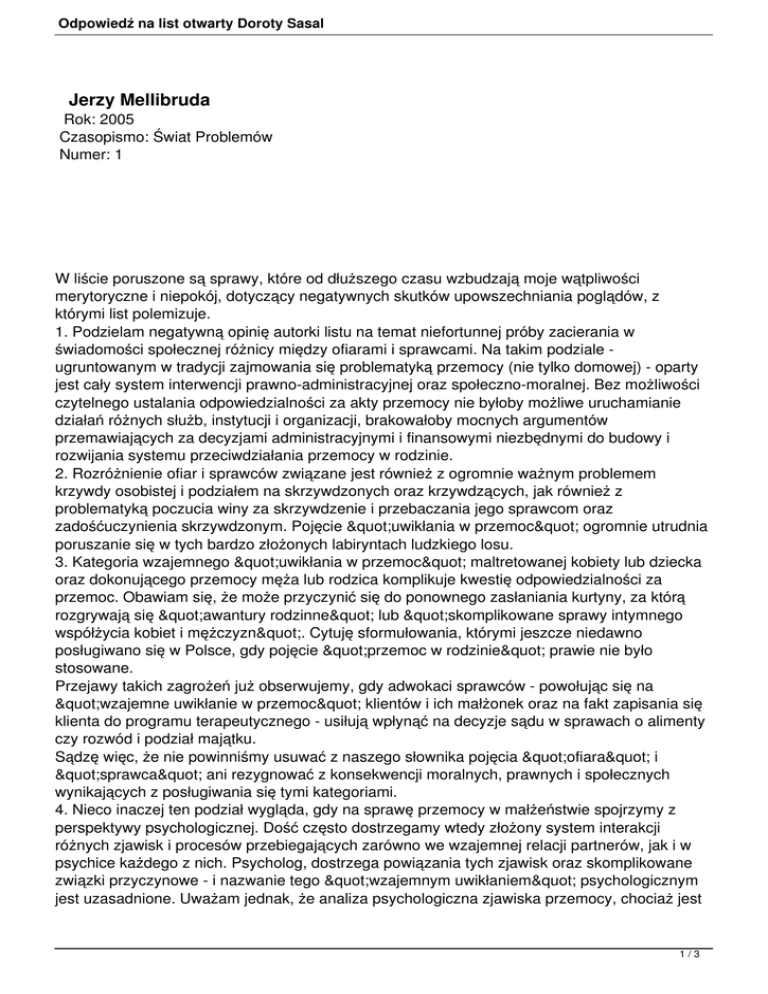Odpowiedź na list otwarty Doroty Sasal Jerzy Mellibruda Rok: 2005 Czasopismo: Świat Problemów Numer: 1 W liście poruszone są sprawy, które od dłuższego czasu wzbudzają moje wątpliwości merytoryczne i niepokój, dotyczący negatywnych skutków upowszechniania poglądów, z którymi list polemizuje. 1. Podzielam negatywną opinię autorki listu na temat niefortunnej próby zacierania w świadomości społecznej różnicy między ofiarami i sprawcami. Na takim podziale ugruntowanym w tradycji zajmowania się problematyką przemocy (nie tylko domowej) - oparty jest cały system interwencji prawno-administracyjnej oraz społeczno-moralnej. Bez możliwości czytelnego ustalania odpowiedzialności za akty przemocy nie byłoby możliwe uruchamianie działań różnych służb, instytucji i organizacji, brakowałoby mocnych argumentów przemawiających za decyzjami administracyjnymi i finansowymi niezbędnymi do budowy i rozwijania systemu przeciwdziałania przemocy w rodzinie. 2. Rozróżnienie ofiar i sprawców związane jest również z ogromnie ważnym problemem krzywdy osobistej i podziałem na skrzywdzonych oraz krzywdzących, jak również z problematyką poczucia winy za skrzywdzenie i przebaczania jego sprawcom oraz zadośćuczynienia skrzywdzonym. Pojęcie "uwikłania w przemoc" ogromnie utrudnia poruszanie się w tych bardzo złożonych labiryntach ludzkiego losu. 3. Kategoria wzajemnego "uwikłania w przemoc" maltretowanej kobiety lub dziecka oraz dokonującego przemocy męża lub rodzica komplikuje kwestię odpowiedzialności za przemoc. Obawiam się, że może przyczynić się do ponownego zasłaniania kurtyny, za którą rozgrywają się "awantury rodzinne" lub "skomplikowane sprawy intymnego współżycia kobiet i mężczyzn". Cytuję sformułowania, którymi jeszcze niedawno posługiwano się w Polsce, gdy pojęcie "przemoc w rodzinie" prawie nie było stosowane. Przejawy takich zagrożeń już obserwujemy, gdy adwokaci sprawców - powołując się na "wzajemne uwikłanie w przemoc" klientów i ich małżonek oraz na fakt zapisania się klienta do programu terapeutycznego - usiłują wpłynąć na decyzje sądu w sprawach o alimenty czy rozwód i podział majątku. Sądzę więc, że nie powinniśmy usuwać z naszego słownika pojęcia "ofiara" i "sprawca" ani rezygnować z konsekwencji moralnych, prawnych i społecznych wynikających z posługiwania się tymi kategoriami. 4. Nieco inaczej ten podział wygląda, gdy na sprawę przemocy w małżeństwie spojrzymy z perspektywy psychologicznej. Dość często dostrzegamy wtedy złożony system interakcji różnych zjawisk i procesów przebiegających zarówno we wzajemnej relacji partnerów, jak i w psychice każdego z nich. Psycholog, dostrzega powiązania tych zjawisk oraz skomplikowane związki przyczynowe - i nazwanie tego "wzajemnym uwikłaniem" psychologicznym jest uzasadnione. Uważam jednak, że analiza psychologiczna zjawiska przemocy, chociaż jest 1/3 Odpowiedź na list otwarty Doroty Sasal mi bliska i istotna, nie powinna odgrywać dominującej roli w funkcjonowaniu systemu przeciwdziałania przemocy w rodzinie. 5. Uważam za nietrafny merytorycznie i niebezpieczny praktycznie pomysł zredukowania problematyki przemocy w rodzinie do psychologicznej analizy wzajemnych interakcji tego, co dzieje się w umyśle, uczuciach oraz reakcjach ofiary i sprawcy przemocy. W szczególności nie wolno aktów przemocy w rodzinie traktować jako zjawiska chorobowego lub zaburzenia psychicznego, chociaż zarówno u ofiar, jak i u sprawców występują zaburzenia emocjonalne. 6. Czym innym jest udzielanie pomocy psychoterapeutycznej osobie, która w dzieciństwie była ofiarą przemocy i po dwudziestu latach z tego powodu zgłasza zaburzenia emocjonalne, a czym innym - osobie, która aktualnie doznaje takiej przemocy w swoim domu. W tym drugim przypadku psychoterapia nie jest odpowiednią formą pomocy, a czasem może nawet powodować negatywne skutki. Dlatego psycholodzy i psychoterapeuci, którzy włączają się do systemu przeciwdziałania przemocy w rodzinie, powinni być szczególnie wrażliwi i uważni, aby analiza psychologiczna interakcji między partnerami związku, w którym dokonywana jest przemoc, nie wypierała tej perspektywy rozumienia przemocy, która pozwala na rozstrzygnięcie problemu odpowiedzialności za przemoc i ustalenia, kto powinien być broniony, chroniony i wspierany. 7. Psychoterapeuci na ogół bardzo pilnują, aby nie angażować się po żadnej stronie konfliktów, w których uczestniczą ich klienci. W systemie przeciwdziałania przemocy istnieje konieczność angażowania się po stronie i w obronie skrzywdzonych ofiar. Często dzieje się to mimo bardzo ograniczonych możliwości weryfikacji, "jak tam naprawdę było, kto pierwszy zaczął i jaki jest stopień wzajemnego uwikłania". Gdyby pracownicy Niebieskiej Linii zaczęli sprawdzać, kto i w jakim stopniu był uwikłany, cała ta praca by się rozsypała. Dlatego, moim zdaniem, psychoterapia ofiar przemocy - rozumiana jako profesjonalna, kliniczna metoda leczenia zaburzeń emocjonalnych - powinna być prowadzona poza systemem przeciwdziałania przemocy w rodzinie. Natomiast pomoc psychologiczna - rozumiana jako udzielanie wsparcia emocjonalnego oraz pomaganie w radzeniu sobie ze stresem i bieżącymi problemami życiowymi - jest bardzo cennym uzupełnieniem systemu interwencji i przeciwdziałania przemocy. Nie wymaga jednak koncentrowania się na "uwikłaniu" i propagowaniu tego podejścia do opisywania zjawiska przemocy. Oczywiście, gdy siadamy twarzą w twarz z osobą skrzywdzoną, nie zwracamy się do niej per "ofiaro" - pomagamy jej wydostawać się z pułapki zagrożenia, bezradności, cierpienia i dezorientacji. Staramy się udzielać jej wsparcia i pomagać w zwiększaniu jej pozytywnych zasobów. 8. Postulat, aby nie zawierać w programach dla sprawców kontraktu na niestosowanie przez nich przemocy, zawarty w poradniku, "Jak p