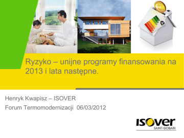 Ryzyko – unijne programy finansowania na 2013 i lata następne. Henryk Kwapisz – ISOVER Forum Termomodernizacji 06/03/2012 Co mówi Recast? 30 czerwca 2011 Lista proponowanych środków i instrumentów 30 czerwca 2014 Aktualizacja listy grudzień 2011:analiza wykorzystania funduszy strukturalnych i środków Europejskiego Banku Inwestycyjnego na efektywność energetyczną w budynkach Page 2 Janvier 2008 30 czerwca 2017 Aktualizacja listy 30 czerwca 2020 Aktualizacja listy Kraj Członkowski Data ostateczna Komisja Data ostateczna Co mówi Recast w kontekście krajowym? • do dnia 30 czerwca 2011 r. państwa członkowskie sporządzają wykaz aktualnych i, w razie potrzeby, proponowanych środków i instrumentów zawierający także środki i instrumenty o charakterze finansowym; mają to być środki inne niż wymagane przepisami niniejszej dyrektywy i promujące cele niniejszej dyrektywy. • wykaz ten może być częścią Krajowego Planu Działań dotyczącego efektywności energetycznej Page 3 Janvier 2008 Co mówi Krajowy Plan Działań (wersja – grudzień 2011) • Instrumenty aktualne: • Ustawa Termomodernizacyjna – 200 mln PLN • NFOŚ dopłaca do kolektorów słonecznych – pozostało około 150 mln • GIS (budynki użyteczności publicznej) – większa część 1 mld PLN wydana • Fundusz Spójności – 41 mln PLN • Inne środki europejskie – 75%-80% wydano • Instrumenty proponowane: • BRAK Page 4 Janvier 2008 Co mówi Recast w kontekście unijnym? • Komisja przedstawia analizę: • Skuteczność funduszy strukturalnych, które zostały już wykorzystane w celu zwiększenia efektywności energetycznej w budynkach, zwłaszcza mieszkaniowych • Efektywność wykorzystania funduszy Europejskiego Banku Inwestycyjnego i innych publicznych instytucji finansowych • Koordynację finansowania unijnego i krajowego oraz innych form wsparcia, mogących służyć pobudzaniu inwestycji w efektywność energetyczną • Przedstawia WNIOSKI • Data: • Miało być – grudzień 2011 • Ma być – pierwsza połowa 2012 Page 5 Janvier 2008 Po co ta analiza? • w kontekście nowej sytuacji ekonomicznej – KRYZYS • w kontekście poszukiwania nowych miejsc pracy • w kontekście nowych ram finansowania unijnego (fundusz spójności) do roku 2020 • w kontekście nowej Dyrektywy w sprawie efektywności energetycznej – 3% renowacji budynków publicznych • w kontekście Mapy Drogowej 2050 dotyczącej energii Page 6 Janvier 2008 W czym problem? Page 7 Janvier 2008 W czym problem? • Potencjał oszczędności energii w budynkach to 65 Mtoe • Wielkość potrzebnych w latach 2012-2020 – 587 mld EUR • Zatem rocznie trzeba zainwestować – 65 mld EUR Page 8 Janvier 2008 Dlaczego teraz? • To co teraz budujemy będzie istnieć co najmniej 50-100 lat •92% budynków z 2005 roku będzie w 2020 •75% budynków z 2005 roku będzie w 2050 • Jak teraz nie zrobimy dobrze to zysk jest niewielki •W ramach działań termomodernizacyjnych od 1993-2003 zużycie ciepła na ogrzewanie obniżono JEDYNIE o 1,9%, bo działania nie są kompleksowe Page 9 Janvier 2008 Dlaczego teraz? • Wg Niemieckiego Banku Rozwoju (Kfw): • Każde 1 EUR zainwestowane w promocję efektywności energetycznej w budynkach daje • 4-5 EUR w formie: • dodatkowych dochodów z podatków • poprawy bezpieczeństwa i zdrowia publicznego • zmniejszenia bezrobocia Page 10 Janvier 2008 Główne bariery rynkowe • Niska cena energii • cena kosztów energii w kosztach wynajmu biura to 1-2% (UK) • cena ogrzewania i prądu w kosztach operacyjnych budynku biurowego wysokiego standardu to 5% (Niemcy) Page 11 Janvier 2008 Główne bariery rynkowe • Ten kto inwestuje i projektuje nie płaci za energię Page 12 Janvier 2008 Główne bariery rynkowe • Ceny energii nie odzwierciedlają wszystkich kosztów środowiskowych i społecznych Koszty takie szacuje się na: 9 - 80 EUR2000/tCO2e Page 13 Janvier 2008 Główne bariery finansowe • Dostępny kapitał jest przeznaczany na inne łatwiej zauważalne priorytety, szczególnie w dobie kryzysu • Jak przeciwdziałać (przykłady): • System bankowy Kfw (Niemcy) • program PolSEFF (Polska) Page 14 Janvier 2008 Główne bariery finansowe • Brak wiarygodnych informacji i niepewność, że inwestycje w oszczędności energii są obarczone dodatkowym ryzykiem • Jak przeciwdziałać (przykład): • UK Green Deal (Wielka Brytania) Page 15 Janvier 2008 Główne bariery finansowe • Mała skala i rozproszenie domowych inwestycji w efektywność energetyczną kreuje wysokie koszty transakcji • Jak przeciwdziałać (przykład): • zobligowanie dostawców energii do promowania działań na rzecz efektywności energetycznej Page 16 Janvier 2008 Główne bariery finansowe - inne • Brak świadomości i wiedzy w sektorze finansowym • Zależność od grantów i dotacji zamiast ustrukturyzowanych form kredytowania Page 17 Janvier 2008 Co dalej? Page 18 Janvier 2008