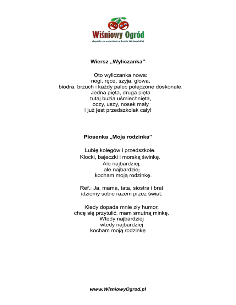 Wiersz „Wyliczanka” Oto wyliczanka nowa: nogi, ręce, szyja, głowa, biodra, brzuch i każdy palec połączone doskonale. Jedna pięta, druga pięta tutaj buzia uśmiechnięta, oczy, uszy, nosek mały I już jest przedszkolak cały! Piosenka „Moja rodzinka” Lubię kolegów i przedszkole. Klocki, bajeczki i morską świnkę. Ale najbardziej, ale najbardziej kocham moją rodzinkę. Ref.: Ja, mama, tata, siostra i brat idziemy sobie razem przez świat. Kiedy dopada mnie zły humor, chcę się przytulić, mam smutną minkę. Wtedy najbardziej wtedy najbardziej kocham moją rodzinkę www.WisniowyOgrod.pl Piosenka „Choinka” Choinko zielona, pięknie wystrojona w bombki i pierniki, gwiazdki, pajacyki Ref.: Kiedy jesteś pośród nas, dom pachnie jak las. W błyszczących łańcuszkach i słodkich jabłuszkach wyglądasz uroczo, gdy światła migoczą. Ref.: Kiedy jesteś pośród nas... Piosenka „List do Św. Mikołaja” Przyszedł grudzień, a z nim święta, dzieci marzą o prezentach. Więc usiadły pod choinką i rysują listy kredką. Ref.: Święty Mikołaju, przyjedź do nas w święta. Tylko, nie zapomnij dla nas o prezentach. Jaś rysuje klocki lego, a Marysia coś innego. Listy włożą do koperty, Adresatem jest nasz święty www.WisniowyOgrod.pl