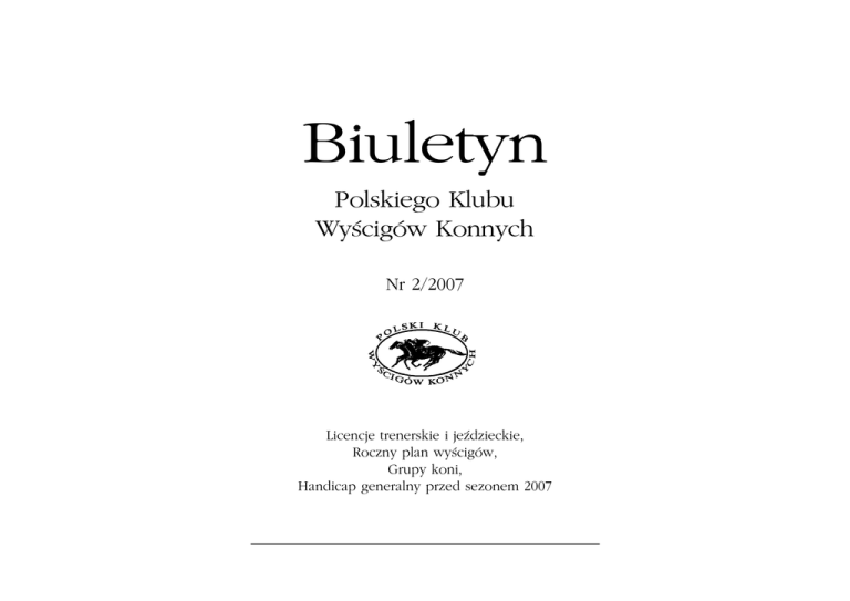 Biuletyn Polskiego Klubu Wyœcigów Konnych Nr 2/2007 Licencje trenerskie i jeŸdzieckie, Roczny plan wyœcigów, Grupy koni, Handicap generalny przed sezonem 2007 Warszawa, dnia 10.01.2007 r. Komunikat nr 1 Polski Klub Wyœcigów Konnych informuje, ¿e specjalistyczne szkolenie dla kandydatów na trenerów koni wyœcigowych (galopem) odbêdzie siê w dniach 26-27 i 2-3 lutego bie¿¹cego roku w godzinach 9oo - 15oo, a egzamin wstêpny w dniu 20 stycznia bie¿¹cego roku o godzinie 10oo, w siedzibie Polskiego Klubu Wyœcigów Konnych. Polski Klub Wyœcigów Konnych 00-9 976 Warszawa, ul. Pu³awska 266 e-m mail: [email protected] SPIS TELEFONÓW Sekretariat Prezesa PKWK: 022 853-1 17-1 15 Biuro i sekretariat: 022 852-0 06-5 53; 022 852-0 06-5 54; fax 022 852-3 31-2 29 Redakcja Ksi¹g Stadnych: tel. 022 331-5 59-9 90, 022 331-5 59-9 91; fax. 022 852-0 06-5 55; Wydzia³ Spraw Hodowlanych i Wyœcigowych: tel./fax 022 843-1 10-3 34; Biuletyny mo¿na nabyæ w siedzibie Klubu w Warszawie przy ul. Pu³awskiej 266 lub otrzymaæ poczt¹, sk³adaj¹c zamówienie na adres Klubu. Konto PKWK: Kredyt Bank V Oddzia³ w Warszawie 58 1500 1272 1212 7003 0253 0000 Warszawa, dnia 6.02.2007 r. Prezes Polskiego Klubu Wyœcigów Konnych Feliks Klimczak Komunikat nr 2 Polski Klub Wyœcigów Konnych informuje, ¿e egzamin teoretyczny dla kandydatów na trenerów koni wyœcigowych (galopem) odbêdzie siê w dniu 10 marca bie¿¹cego roku od godziny 9oo, w siedzibie Polskiego Klubu Wyœcigów Konnych. Warszawa, dnia 30.03.2007 r. Prezes Polskiego Klubu Wyœcigów Konnych Feliks Klimczak Komunikat nr 3 Polski Klub Wyœcigów Konnych informuje, ¿e w dniach 10 oraz 16 i 30 marca 2007 roku Komisja egzaminacyjna przeprowadzi³a egzaminy teoretyczny i praktyczny, dotycz¹ce uzyskania uprawnieñ do trenowania koni galopem. Do egzaminu przyst¹pi³o 10 osób, z których zaliczy³y 3. Uprawnienia do trenowania koni galopem uzyska³y: Justyna DOMAÑSKA, Ma³gorzata MAROSZEK, Zofia STACHOWSKA-GIERCZYÑSKA. Warszawa, dnia 2.04.2007 r. Prezes Polskiego Klubu Wyœcigów Konnych Feliks Klimczak Komunikat nr 4 Polski Klub Wyœcigów Konnych informuje, ¿e w dniu 2 kwietnia 2007 roku PATRYK WRÓBLEWSKI zda³ egzamin ze znajomoœci przepisów o wyœcigach konnych z zakresu tematyki zawartej w „Rozporz¹dzeniu Ministra Rolnictwa i Rozwoju Wsi z dnia 23 sierpnia 2001r. w sprawie ustalenia regulaminu wyœcigów konnych” (Dz. U. z dnia 31 sierpnia 2001 r. z póŸniejszymi zmianami), uzyskuj¹c uprawnienia do ubiegania siê o zezwolenie na kierowanie stajni¹ wyœcigow¹ Warszawa, 28 kwietnia 2007 roku Prezes Polskiego Klubu Wyœcigów Konnych Feliks Klimczak Komunikat nr 7 Polski Klub Wyœcigów Konnych informuje, ¿e na Wroc³awskim Torze Wyœcigów Konnych - Partynice w dniu 27 kwietnia 2007 roku KAROLINA DYNAROWSKA zda³a egzamin z zakresu tematyki zawartej w „Rozporz¹dzeniu Ministra Rolnictwa i Rozwoju Wsi z dnia 23 sierpnia 2001r. w sprawie ustalenia regulaminu wyœcigów konnych” (Dz. U. z dnia 31 sierpnia 2001 r. z póŸniejszymi zmianami), uzyskuj¹c uprawnienia do dosiadania koni. Prezes Polskiego Klubu Wyœcigów Konnych Feliks Klimczak Warszawa, 11 maja 2007 roku Komunikat nr 8 Polski Klub Wyœcigów Konnych informuje, ¿e 4-dniowe szkolenie dla kandydatów na sêdziów wyœcigowych odbêdzie siê w dniach 26-27 maja i 2-3 czerwca bie¿¹cego roku w Warszawie w siedzibie Klubu w godzinach 9.00 - 12.30 (wyk³ady) oraz w trakcie rozgrywania gonitw (zajêcia praktyczne). Prezes Polskiego Klubu Wyœcigów Konnych Feliks Klimczak Biuletyn PKWK 2/2007 5 Lista osób, które uzyska³y licencje i zosta³y powo³ane przez Prezesa Polskiego Klubu Wyœcigów Konnych do pe³nienia funkcji sêdziów wyœcigowych w 2007 roku: I. Tor Wyœcigów Konnych we Wroc³awiu - Partynice a) Komisja Techniczna: Grzegorz Ciszewski, Anna Maria Ganowicz, Henryk Geringer, Les³aw Karpina, Jakub Kasprzak, Stanis³aw Przybylak, Józef Œnie¿ek. b) Sêdziowie techniczni: sêdziowie starterzy: Jan Borkowski, Marek Rafalski sêdziowie u celownika: Ma³gorzata Szewczyk sêdzia u wagi: Agnieszka Bienert Komisja Odwowcza: Jarosaw Koch, Krzysztof Laskowski, Marek Wachel. I. Tor Wyœcigów Konnych w Warszawie - S³u¿ewiec a) Komisja Techniczna: Pawe³ Che³kowski, Jerzy Jednaszewski, Jacek £ojek, Miros³aw Stawski, Adam Wiœniewski. b) Sêdziowie techniczni: sêdziowie starterzy: Ryszard Jasiukiewicz, Wiœniewski Leszek sêdziowie u celownika: Krzysztof Chmiel sêdziowie u wagi: Kazimierz Górecki, Stanis³aw Gulajew, Iwona Kiljañska sêdzia u zegara: Bo¿ena Owczarczyk Prezes Polskiego Klubu Wyœcigów Konnych Feliks Klimczak Lekarze medycyny i lekarze weterynarii uprawnieni do pe³nienia funkcji dy¿urnych lekarzy na Torach Wyœcigów Konnych w sezonie 2007: Lekarze medycyny na Torze Wyœcigów Konnych na S³u¿ewcu w Warszawie: Maciej Gontarewicz, Kazimierz Dragañski, Jaros³aw Ziaja Lekarze weterynarii na Torze Wyœcigów Konnych na S³u¿ewcu w Warszawie: Micha³ Dziekañski, Janusz Rydzyñski, Mariusz Gêbka, Olga Kalisiak, Katarzyna Kruza, Jan Samsel, Blanka Wysocka oraz Adam W¹sowski - upowa¿nieni do identyfikacji koni Andrzej Majcher - upowa¿niony do pobierania prób dopingowych Prezes Polskiego Klubu Wyœcigów Konnych Feliks Klimczak 6 Biuletyn PKWK 2/2007 Na podstawie decyzji Prezesa Polskiego Klubu Wyœcigów Konnych nastêpuj¹ce osoby uzyska³y licencjê na trenowanie koni w sezonie 2007: 1. Maja Bochiñska 2. Stanis³aw Borkowski 3. W³odzimierz Broniszewski 4. Tadeusz Dêbowski 5. Aleksandra Gajos 6. Józef Gêborys 7. Jan G³owacki 8. Sergiy Ivashchenko 9. Maciej Janikowski 10. Wiktor Jasiñski 11. Dorota Ka³uba 12. Tomasz Kluczyñski 13. Agnieszka Klus 14. Katarzyna Koz³owska 15. Janusz Koz³owski 16. Wies³aw Kryszy³owicz 17. Joanna Ksiê¿uk 18. Ma³gorzata £ojek 19. Boles³aw Mazurek 20. Mieczys³aw Me³nicki 21. Marek Mioduszewski 22. Anna Nieora-Tchkuaseli 23. Olga Nowak 24. Marek Nowakowski 25. Joanna Patejuk 26. Roman