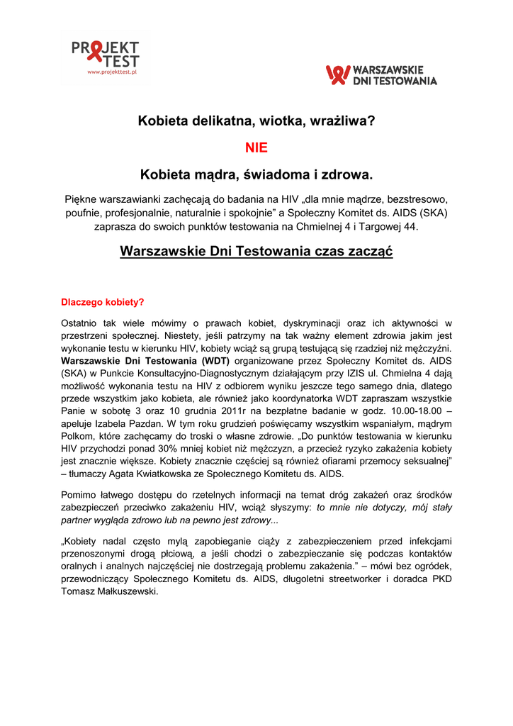 Kobieta delikatna, wiotka, wrażliwa? NIE Kobieta mądra, świadoma i zdrowa. Piękne warszawianki zachęcają do badania na HIV „dla mnie mądrze, bezstresowo, poufnie, profesjonalnie, naturalnie i spokojnie” a Społeczny Komitet ds. AIDS (SKA) zaprasza do swoich punktów testowania na Chmielnej 4 i Targowej 44. Warszawskie Dni Testowania czas zacząć Dlaczego kobiety? Ostatnio tak wiele mówimy o prawach kobiet, dyskryminacji oraz ich aktywności w przestrzeni społecznej. Niestety, jeśli patrzymy na tak ważny element zdrowia jakim jest wykonanie testu w kierunku HIV, kobiety wciąż są grupą testującą się rzadziej niż mężczyźni. Warszawskie Dni Testowania (WDT) organizowane przez Społeczny Komitet ds. AIDS (SKA) w Punkcie Konsultacyjno-Diagnostycznym działającym przy IZIS ul. Chmielna 4 dają możliwość wykonania testu na HIV z odbiorem wyniku jeszcze tego samego dnia, dlatego przede wszystkim jako kobieta, ale również jako koordynatorka WDT zapraszam wszystkie Panie w sobotę 3 oraz 10 grudnia 2011r na bezpłatne badanie w godz. 10.00-18.00 – apeluje Izabela Pazdan. W tym roku grudzień poświęcamy wszystkim wspaniałym, mądrym Polkom, które zachęcamy do troski o własne zdrowie. „Do punktów testowania w kierunku HIV przychodzi ponad 30% mniej kobiet niż mężczyzn, a przecież ryzyko zakażenia kobiety jest znacznie większe. Kobiety znacznie częściej są również ofiarami przemocy seksualnej” – tłumaczy Agata Kwiatkowska ze Społecznego Komitetu ds. AIDS. Pomimo łatwego dostępu do rzetelnych informacji na temat dróg zakażeń oraz środków zabezpieczeń przeciwko zakażeniu HIV, wciąż słyszymy: to mnie nie dotyczy, mój stały partner wygląda zdrowo lub na pewno jest zdrowy... „Kobiety nadal często mylą zapobieganie ciąży z zabezpieczeniem przed infekcjami przenoszonymi drogą płciową, a jeśli chodzi o zabezpieczanie się podczas kontaktów oralnych i analnych najczęściej nie dostrzegają problemu zakażenia.” – mówi bez ogródek, przewodniczący Społecznego Komitetu ds. AIDS, długoletni streetworker i doradca PKD Tomasz Małkuszewski. Ciągle za mało wiedzy Dziś HIV to nie wyrok. Zakażenie tym wirusem nie powinno się nam już kojarzyć ze znanym wszystkim filmem Filadelfia, gdzie Tom Hanks umiera na nieuleczalną, nieodgadnioną dla wielu ludzi w tamtym czasie chorobę. Te stereotypy czas odesłać do lamusa. Dziś HIV jest zakażeniem przewlekłym, kontrolowanym, a żyjąc z nim można doczekać się wnuków. Postęp medycyny i farmaceutyki pozwala się z HIV „oswoić” i nauczyć się z nim żyć. Ale… najpierw musimy wiedzieć, czy jesteśmy zakażeni czy nie, tak więc : „Po pierwsze trzeba się badać, a po drugie o siebie dbać.” – tłumaczą organizatorzy akcji. Krystyna Sokołowska, to wybitna działaczka na rzecz walki z dyskryminacją dotyczącą epidemii HIV/AIDS, Przewodnicząca Stowarzyszenia Wolontariuszy na Rzecz Dzieci „Mały Książę”. Współpracowała z Markiem Kotańskim przy tworzeniu „Domu Ciepła” i hospicjum w Rembertowie. Jedna z założycielek Stowarzyszenia Wolontariuszy Wobec AIDS „Bądź z nami”, a wcześniej (1993) Społecznego Komitetu ds. AIDS w związku z kampanią mówi: „Poznajemy HIV od ponad 20 lat. Wiemy dużo, a przynajmniej wystarczająco, aby chronić dzieci przed zakażeniem HIV. Niestety środowisko ginekologiczno - położnicze nie zawsze korzysta z tej wiedzy przedstawiając argumenty, które nie przemawiają do mnie i kobiet świadomych możliwości dzisiejszej medycyny. Lekceważenie, tych dwóch piekielnie ważnych zdań informujących o możliwości wykonania testu i ewentualne uratowanie dziecka przed zakażeniem powinno być społecznie nieakceptowalne i trzeba o tym mówić głośno – bo lekarzy, którzy pomijają test na HIV w czasie prowadzenia ciąży jest w Polsce zbyt wielu. To okrucieństwo i brak profesjonalizmu. Z HIV zostaje matka i niestety dziecko, a takich przypadków jest co raz więcej. Lekarze powinni odpowiadać za taką praktykę, a niestety są w naszym kraju bezkarni. Matka pozostaje z poczuciem winy wobec dziecka, złością i ogromną frustracją. A dziecko? No cóż, nie pozna nigdy świata bez HIV. Kto ponosi odpowiedzialność za takie sytuacje? Dlatego proszę wszystkie kobiety, które decydują się na potomstwo, bądźcie świadome. Nawet jeśli wasz lekarz pominie to badanie, nie wstydźcie się zareagować, przypomnieć, wymagać – macie do tego prawo.” Zdrowa kobieta to piękna kobieta Aby przypomnieć naszym pięknym, zabieganym paniom o testowaniu się na HIV stworzyliśmy plakat skierowany specjalnie do nich. Kobieca torebka, często większość z nas tak naprawdę nie wie co w niej ma… a HIV? Sama sprawdź czy go nie masz. *** 3-10 grudnia 2011 | soboty 10.00 - 18.00 ul. Chmielna 4 | www.projekttest.pl | www.facebook.com/projekttest W ciągu tygodnia: PKD w „IZIS” przy ul. Chmielnej 4 w Warszawie Pon-Wt: 10.00-20.00 Śr-Czw:15.00-20.00 Pt:10.00-16.00 PKD w „IZIS” przy ul. Targowej 44 w Warszawie Pon: 10:30 – 14:30 Wt – Czw: 14:00 – 18:00 *** Akcję po raz piąty SKA organizuje przy wsparciu m. st. Warszawa, Krajowego Centrum ds. AIDS, Open Society Institute (Global Drug Policy Program), Lekarsko-Kosmetycznej Spółdzielnią Pracy „IZIS”, Levi’s, bioMérieux oraz Bristol Myers Squibb. Mimo, że z roku na rok wzrasta świadomość Polaków w zakresie zagrożenia HIV/AIDS, eksperci z Narodowego Instytutu Zdrowia Publicznego - Państwowego Zakładu Higieny przewidują, że w 2011 roku po raz pierwszy liczba Polaków z nowo rozpoznanym zakażeniem HIV może przekroczyć 1000 osób. Dlatego niezbędne jest realizowanie kolejnych kampanii, które przekażą merytoryczną wiedzę na temat możliwości ochrony przed zakażeniem i metod ograniczenia epidemii. Jedną z takich inicjatyw jest Program SHE, pierwszy w historii europejski program wzajemnej pomocy, którego zadaniem jest s