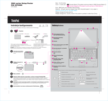 39T5989 07/11/2005 Instrukcje konfigurowania Budowa Aby uzyskaæ szczegó³owe informacje, naciœnij przycisk ThinkVantage. 3 1 2 Rozpakuj: 1 Komputer ThinkPad(R) Akumulator 2 kapturki urz¹dzenia Trackpoint(R) Zasilacz Kabel zasilaj¹cy 1 Antena bezprzewodowej sieci LAN UltraConnect(TM) 2 Oœwietlenie klawiatury ThinkLight(R) 3 Zatrzask Podrêczniki 4 * Patrz uwagi na odwrocie dotycz¹ce elementów niewymienionych na liœcie, brakuj¹cych lub uszkodzonych oraz dysku Recovery CD. - Instrukcje konfigurowania (ten arkusz) - Podrêcznik obs³ugi i rozwi¹zywania problemów - Pozosta³e dodatki lub ulotki Uwaga: Przed rozpoczêciem korzystania z komputera nale¿y zapoznaæ siê z uwagami dotycz¹cymi bezpieczeñstwa zamieszczonymi w Podrêczniku obs³ugi i rozwi¹zywania problemów. Zainstaluj akumulator: Akumulator jest gotowy do u¿ycia. 4 Antena bezprzewodowej sieci WAN* * Tylko wybrane modele. 5 Przyciski g³oœnoœci i wyciszania 6 Przycisk zasilania 7 Przycisk ThinkVantage 8 Przyciski wstecz i dalej przegl¹darki WWW 5 7 6 8 11 Pod³¹cz komputer do zasilania: 1 9 2 Czytnik odcisków palców* * Tylko wybrane modele. 10 9 3 10 Przycisk centralny urz¹dzenia TrackPoint 1 11 Klawisz Fn W kombinacji z innymi klawiszami umo¿liwia dostêp do funkcji specjalnych komputera ThinkPad. Blokada komputera Przejœcie w tryb hibernacji Zarz¹dzanie akumulatorem i zasilaniem W³¹czanie/wy³¹czanie lampki ThinkLight W³¹cz zasilanie: Wskazuj i klikaj elementy, korzystaj¹c z systemu nawigacji UltraNav(TM): Naciœnij kapturek urz¹dzenia TrackPoint lub przesuñ palce po urz¹dzeniu touchpad w kierunku, w którym chcesz przesun¹æ wskaŸnik. Lewy i prawy przycisk poni¿ej klawisza spacji i urz¹dzenia touchpad dzia³aj¹ tak jak przyciski myszy. Niektóre modele mog¹ byæ wyposa¿one tylko w urz¹dzenie TrackPoint. Skonfiguruj system operacyjny zgodnie z instrukcjami wyœwietlanymi na ekranie: Proces ten mo¿e potrwaæ kilkanaœcie minut, a w tym czasie komputer mo¿e byæ kilkakrotnie restartowany. Aby dowiedzieæ siê wiêcej, naciœnij przycisk ThinkVantage: Przejœcie w tryb zawieszenia Zarz¹dzanie po³¹czeniami sieciowymi Sterowanie odtwarzaniem plików multimedialnych Zmiana ustawieñ ekranu Zmiana jasnoœci ekranu Zmiana ustawieñ urz¹dzeñ wejœciowych Powiêkszenie zawartoœci ekranu Zarz¹dzanie urz¹dzeniami zewnêtrznymi P/N: 39T5989 39T5989 07/11/2005 Technologie Instalowanie opcjonalnej pamiêci Pojemnoœæ pamiêci w komputerze mo¿na zwiêkszyæ. Naciœniêcie przycisku ThinkVantage na klawiaturze powoduje otwarcie menu systemu ThinkVantage Productivity Center. Uwaga: Nale¿y u¿ywaæ tylko tych typów pamiêci, które s¹ obs³ugiwane przez komputer. W przypadku niepoprawnego zainstalowania opcjonalnej pamiêci lub zainstalowania nieobs³ugiwanego typu pamiêci w czasie uruchamiania komputera rozlegnie 1 Aby dowiedzieæ siê wiêcej o technologiach ThinkVantage lub innych rozwi¹zaniach, wybierz opcjê Access Help z menu systemu Productivity Center i wprowadŸ temat w indeksie lub wyszukaj go wed³ug s³ów kluczowych. Zainstaluj opcjonalny modu³ pamiêci SO-DIMM: Productivity Center 1 2 Dotknij uziemionego metalowego przedmiotu, aby roz³adowaæ ³adunki elektrostatyczne na ciele, które mog³yby uszkodziæ modu³ SO-DIMM. Staraj siê nie dotkn¹æ krawêdzi modu³u SO-DIMM, na której s¹ styki. Wy³¹cz komputer. 3 Od³¹cz zasilacz i wszystkie kable od komputera. 4 Zamknij ekran i odwróæ komputer. 5 Wyjmij akumulator. 8 Jeœli modu³ SO-DIMM jest ju¿ zainstalowany, usuñ go w sposób pokazany na ilustracji. Zachowaj wyjêty modu³ SO-DIMM na wypadek, gdyby by³ potrzebny w przysz³oœci. Access Connections Security Rescue and Recovery System Migration Assistant 9 6 Wykrêæ 4 wkrêty. Dopasuj wyciêcie w krawêdzi styków modu³u SODIMM do wystêpu w gnieŸdzie. Energicznie wsuñ modu³ SO-DIMM do gniazda pod k¹tem 20 stopni 1 , a nastêpnie dociskaj go, a¿ zaskoczy na miejsce 2 . 2 1 2 7 Odwróæ z powrotem komputer i usuñ podpórkê pod nadgarstki. Od³¹czanie kabla urz¹dzenia trackpad nie jest konieczne. System Update * Dodatkowe uwagi dotycz¹ce rozpakowywania: 1) Niektóre modele mog¹ zawieraæ elementy, które nie s¹ wymienione na tej liœcie. 2) Jeœli jakiegoœ elementu brakuje lub jest on uszkodzony, nale¿y skontaktowaæ siê z punktem sprzeda¿y 3) Komputer jest wyposa¿ony w funkcjê Disk-to-Disk Recovery. Wszystko, co jest potrzebne do odtworzenia fabrycznie zainstalowanych plików i aplikacji, znajduje siê na dysku twardym, dziêki czemu nie jest potrzebny dysk Recovery CD. Wiêcej informacji na ten temat zawiera podrozdzia³ "Odtwarzanie fabrycznie zainstalowanego oprogramowania" w Podrêczniku obs³ugi i rozwi¹zywania problemów. Imiê i nazwisko: 1 Nazwa firmy: Numer modelu: Numer seryjny: 10 Wymieñ podpórkê pod nadgarstki. 11 Odwróæ z powrotem komputer i przykrêæ 4 wkrêty. 12 Wymieñ bateriê. 2 SprawdŸ, czy opcjonalny modu³ pamiêci SO-DIMM zosta³ zainstalowany poprawnie: Serwis firmowy lub reselera: Serwis WWW dzia³u wsparcia: Numer do dzia³u wsparcia: 1 W³¹cz komputer. 2 Gdy w trakcie uruchamiania zostanie wyœwietlony odpowiedni komunikat, naciœnij przycisk ThinkVantage. 3 Uruchom program BIOS Setup Utility, klikaj¹c przycisk "Access BIOS" w kategorii “Configure". 4 SprawdŸ, czy w pozycji "Installed memory" jest podana ³¹czna iloœæ pamiêci zainstalowanej w komputerze. Gdyby np. zainstalowano dodatkowy modu³ SO-DIMM 512 MB w komputerze o standardowej pojemnoœci pamiêci 256 MB, w pozycji "Installed memory" by³aby podana wielkoœæ 768 MB. Wydrukowano w Chinach Copyright Lenovo 2005. Fragmenty Copyright International Business Machines Corporation 2005. Wszelkie prawa zastrze¿one. ThinkPad jest zastrze¿onym znakiem towarowym Lenovo. IBM jest znakiem towarowym IBM Corp. Tylko do pozycji kodu paskowego