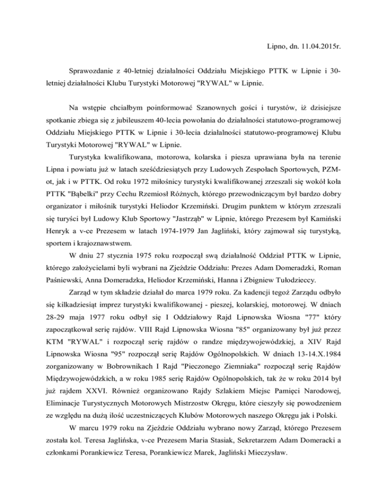 Lipno, dn. 11.04.2015r. Sprawozdanie z 40-letniej działalności Oddziału Miejskiego PTTK w Lipnie i 30letniej działalności Klubu Turystyki Motorowej "RYWAL" w Lipnie. Na wstępie chciałbym poinformować Szanownych gości i turystów, iż dzisiejsze spotkanie zbiega się z jubileuszem 40-lecia powołania do działalności statutowo-programowej Oddziału Miejskiego PTTK w Lipnie i 30-lecia działalności statutowo-programowej Klubu Turystyki Motorowej "RYWAL" w Lipnie. Turystyka kwalifikowana, motorowa, kolarska i piesza uprawiana była na terenie Lipna i powiatu już w latach sześćdziesiątych przy Ludowych Zespołach Sportowych, PZMot, jak i w PTTK. Od roku 1972 miłośnicy turystyki kwalifikowanej zrzeszali się wokół koła PTTK "Bąbelki" przy Cechu Rzemiosł Różnych, którego przewodniczącym był bardzo dobry organizator i miłośnik turystyki Heliodor Krzemiński. Drugim punktem w którym zrzeszali się turyści był Ludowy Klub Sportowy "Jastrząb" w Lipnie, którego Prezesem był Kamiński Henryk a v-ce Prezesem w latach 1974-1979 Jan Jagliński, który zajmował się turystyką, sportem i krajoznawstwem. W dniu 27 stycznia 1975 roku rozpoczął swą działalność Oddział PTTK w Lipnie, którego założycielami byli wybrani na Zjeździe Oddziału: Prezes Adam Domeradzki, Roman Paśniewski, Anna Domeradzka, Heliodor Krzemiński, Hanna i Zbigniew Tułodzieccy. Zarząd w tym składzie działał do marca 1979 roku. Za kadencji tegoż Zarządu odbyło się kilkadziesiąt imprez turystyki kwalifikowanej - pieszej, kolarskiej, motorowej. W dniach 28-29 maja 1977 roku odbył się I Oddziałowy Rajd Lipnowska Wiosna "77" który zapoczątkował serię rajdów. VIII Rajd Lipnowska Wiosna "85" organizowany był już przez KTM "RYWAL" i rozpoczął serię rajdów o randze międzywojewódzkiej, a XIV Rajd Lipnowska Wiosna "95" rozpoczął serię Rajdów Ogólnopolskich. W dniach 13-14.X.1984 zorganizowany w Bobrownikach I Rajd "Pieczonego Ziemniaka" rozpoczął serię Rajdów Międzywojewódzkich, a w roku 1985 serię Rajdów Ogólnopolskich, tak że w roku 2014 był już rajdem XXVI. Również organizowano Rajdy Szlakiem Miejsc Pamięci Narodowej, Eliminacje Turystycznych Motorowych Mistrzostw Okręgu, które cieszyły się powodzeniem ze względu na dużą ilość uczestniczących Klubów Motorowych naszego Okręgu jak i Polski. W marcu 1979 roku na Zjeździe Oddziału wybrano nowy Zarząd, którego Prezesem została kol. Teresa Jaglińska, v-ce Prezesem Maria Stasiak, Sekretarzem Adam Domeracki a członkami Porankiewicz Teresa, Porankiewicz Marek, Jagliński Mieczysław. Zarząd w tym składzie działał do 13.12.1984 roku. Za kadencji tegoż Zarządu przybyły dwa koła i 9 klubów szkolnych: Koło przy Konwektorze, Nektawicie oraz Kluby przy SKKT LO w Lipnie, ZSR w Wymyślinie, Szkołach 1,2,3 w Lipnie oraz w Wichowie, Kikole, Suminie i Skępem. Łącznie było ponad 200 członków. Również w tej kadencji powołano dwie Komisje: Komisję Turystyki Motorowej, której przewodniczącym został Jagliński Jan, Sekretarzem Maria Stasiak a członkami Mirosław Sawicko, Wioletta Kochowicz oraz Komisja Turystyki Pieszej, której przewodniczącym został Roman Waśniewski a Sekretarzem Adam Domeracki. W dniu 12.12.1984r. odbył się ponowny Zjazd Oddziału PTTK sprawozdawczowyborczy na którym powołano nowy Zarząd - Prezesem ponownie została kol. Teresa Jaglińska, która funkcję pełniła do maja 1985r. tj. do chwili śmierci, Sekretarzem Zarządu została Grażyna Wiśniewska, V-ce Prezesem ds. Turystyki Maria Stasiak, ds. sportu Czesław Sobala, natomiast członkami Zarządu zostali Porankiewicz Teresa, Porankiewicz Marek, Falkowski Kazimierz, Mieczysław Jagliński. W skład Komisji Rewizyjnej wybrani zostali: Przewodniczący Jagliński Jan oraz członkowie Jadwiga Bełkowska i Roman Paśniewski. Po śmierci Teresy Jaglińskiej funkcję Prezesa objęła Maria Stasiak. W okresie działalności Zarządu powstał Klub SKKT przy Szkole Podstawowej w Ryszewku oraz Koło przy Okręgowej Spółdzielni Mleczarskiej w Lipnie i Klub Turystyki Motorowej "RYWAL" w Lipnie który działa do chwili obecnej. Na wyróżnienie zasługiwały Klub Szkolny z SP nr 2 w Lipnie prowadzony przez bardzo dobrego opiekuna Panią. Strześniewską oraz Klub ze SP w Wichowie prowadzony również przez dobrego opiekuna Romana Paśniewskiego, odznaczonego Srebrną Honorową Odznaką - "Za Pracę z Młodzieżą". W dniu 03.03.1989 roku odbył się ponowny Zjazd Oddziału na którym został wybrany nowy Zarząd, którego Prezesem został Marian Duchnowski, który funkcję tę pełnił do 2009r., V-ce Prezesem ds. Sportu został Waldemar Stasiak, który funkcję tę pełnił do 11.02.1999r. tj. do chwili zwołania Nadzwyczajnego Zjazdu Oddziału dot. zatwierdzenia nowego Statutu PTTK. Waldemar Stasiak odszedł ze względu na stan zdrowia, na jego miejsce to powołano Adama Szydę, który funkcję V-ce Prezesa ds. koordynacji klubów pełnił do 2009r. V-ce Prezesem ds. Turystyki została wybrana Wanda Watkowska-Rabiec, Sekretarzem Oddziału Jagliński Jan, który funkcję tę pełni do chwili obecnej, Skarbnikiem Joanna Klaban a członkami Ryszard Wiśniewski, Jan Gryczewski, Adam Kowalski, Krzysztof Onoszko, Mieczysław Jagliński, Paweł Sztuczka. W skład Komisji Rewizyjnej weszli Przewodnicząca Anna Karwowska, Roman Paśniewski i Bożena Papis. Pragnę nadmienić, iż w latach transformacji ustrojowej w roku 1991 Burmistrz Miasta Lipna wymówił nam lokal na Biuro Oddziału mieszczące się przy Placu Dekerta. Był to piękny punkt informacyjny dla turystów, ponieważ przejeżdżające przez miasto wycieczki wstępowały do Biura w celu uzyskania informacji o mieście jak i jego zabytkach - a mamy ich bardzo dużo. Mimo to kryzys przetrwaliśmy a Biuro od tegoż czasu mieści się w prywatnym budynku w jednym z pomieszczeń kol. Sekretarza Jana Jaglińskiego. W dniu 17.02.2001r. na Zjeździe Oddziału zos
